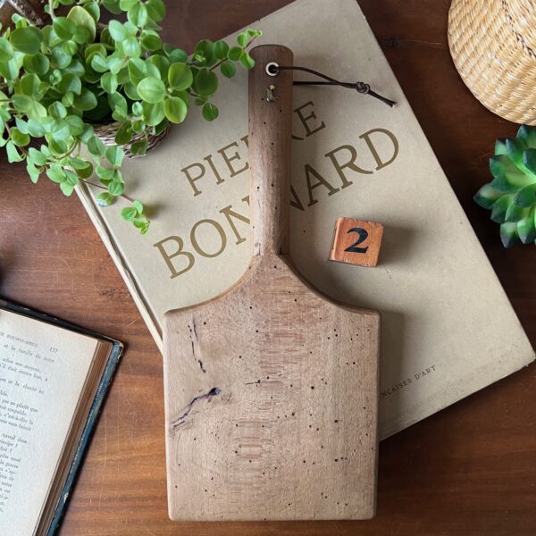 Un battoir ancien, marqué par le temps juste ce qu’il faut : traces d’usage, douceur du bois poli par les mains qui ont travaillé avec. Il porte désormais une autre histoire : un cordon en cuir choisi avec soin et un petit oiseau en laiton, comme une signature délicate.