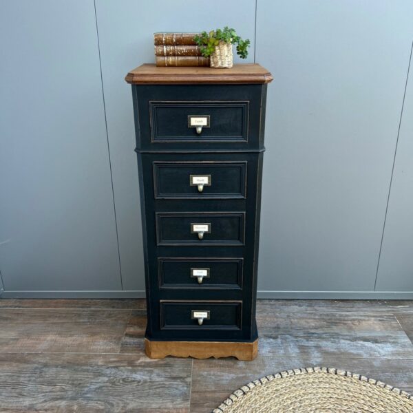 Un meuble plein de surprises ! Sous ses airs de semainier, ce meuble cache bien son jeu : cinq façades de tiroirs, mais un système astucieux — le premier, le quatrième et le cinquième tiroirs fonctionnent, tandis que les deux du milieu ouvrent une grande trappe.