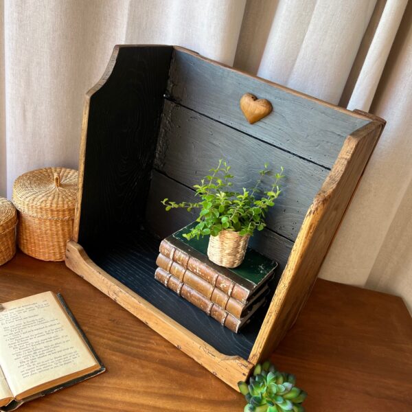 Un petit rebord sur le devant permet de caler facilement les objets que l’on y dépose : livres, plantes, accessoires… On aime ce joli cœur en bois en guise de fronton. Une pièce unique, pour faire entrer un peu d’histoire dans votre intérieur.