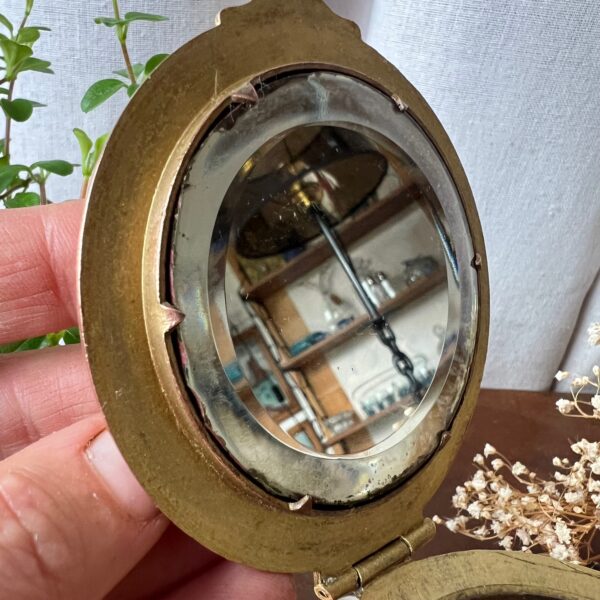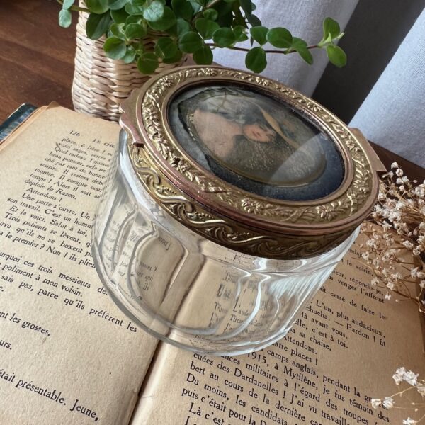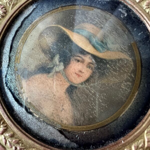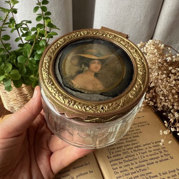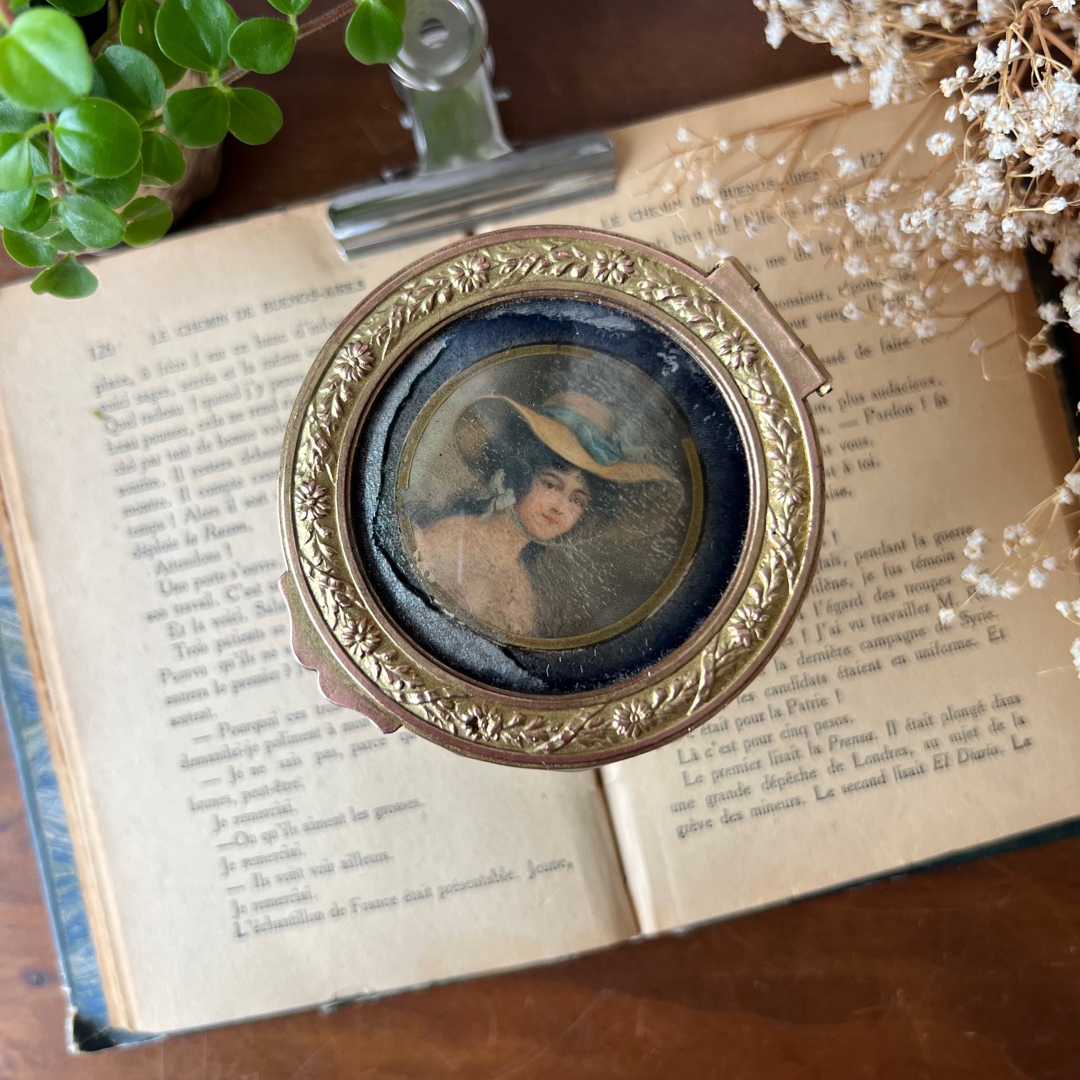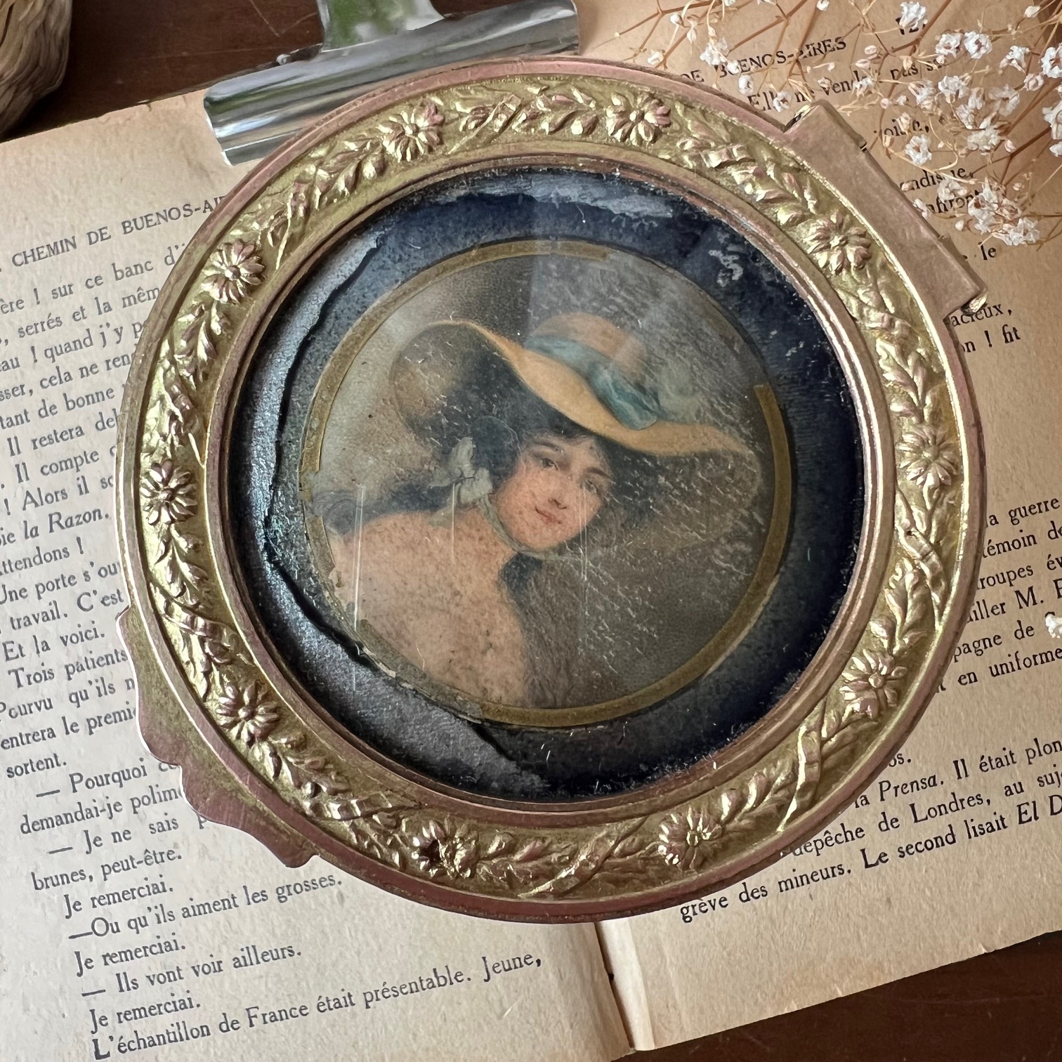 Sur le dessus, une miniature sous verre. Une femme en robe légère, coiffée d’un grand chapeau aux rubans bleus, pose son regard doux et lointain. À l’intérieur, un miroir rond et biseauté rappelle les gestes d’élégance du quotidien — ceux qu’on prenait le temps d’accomplir.