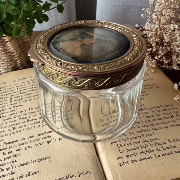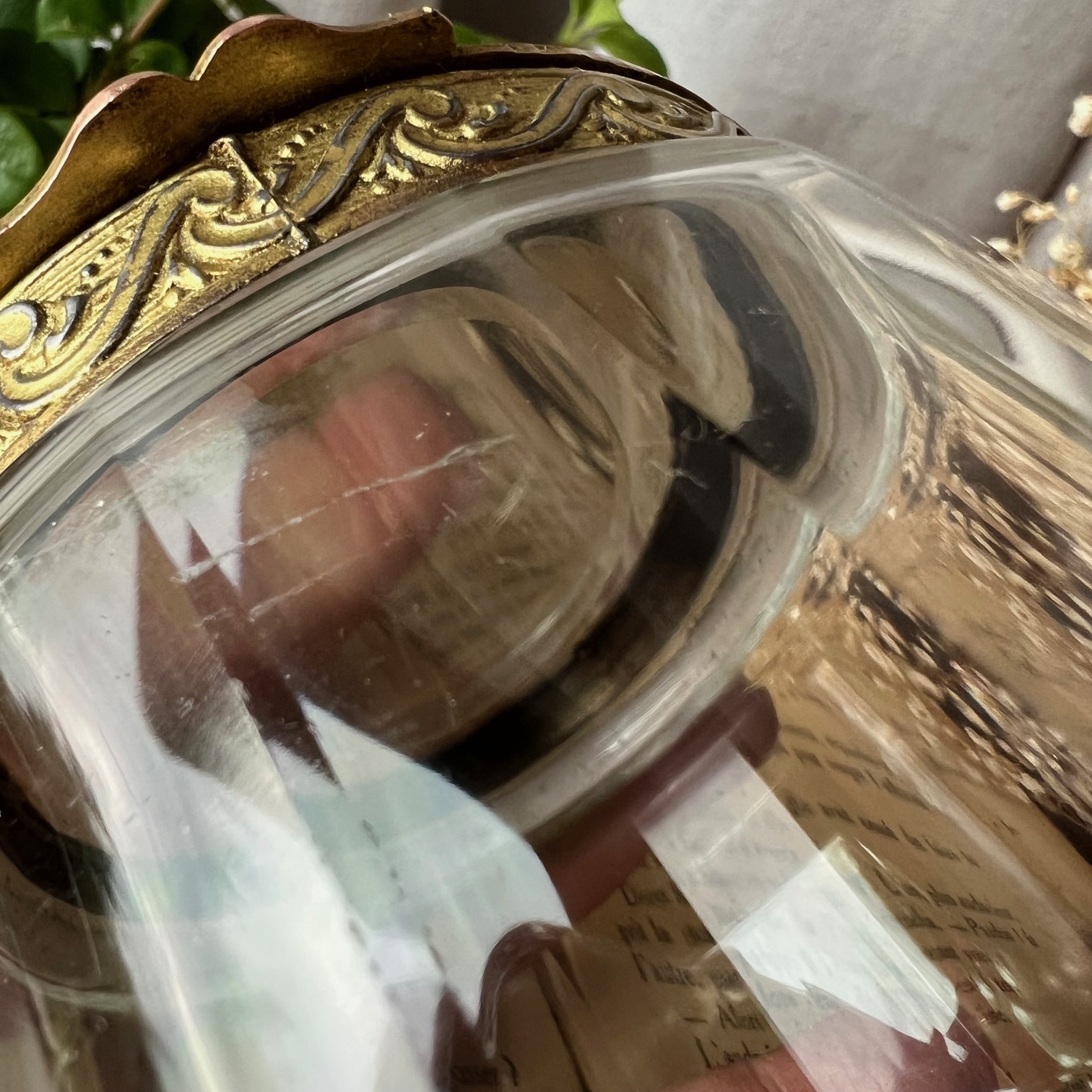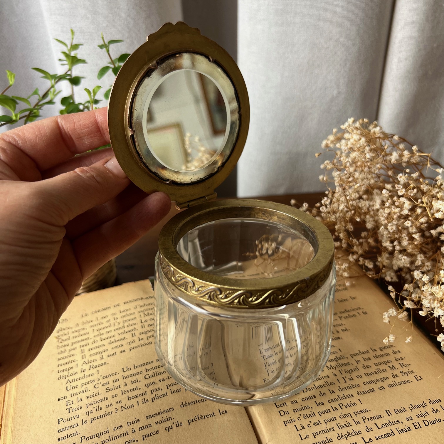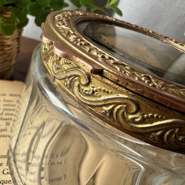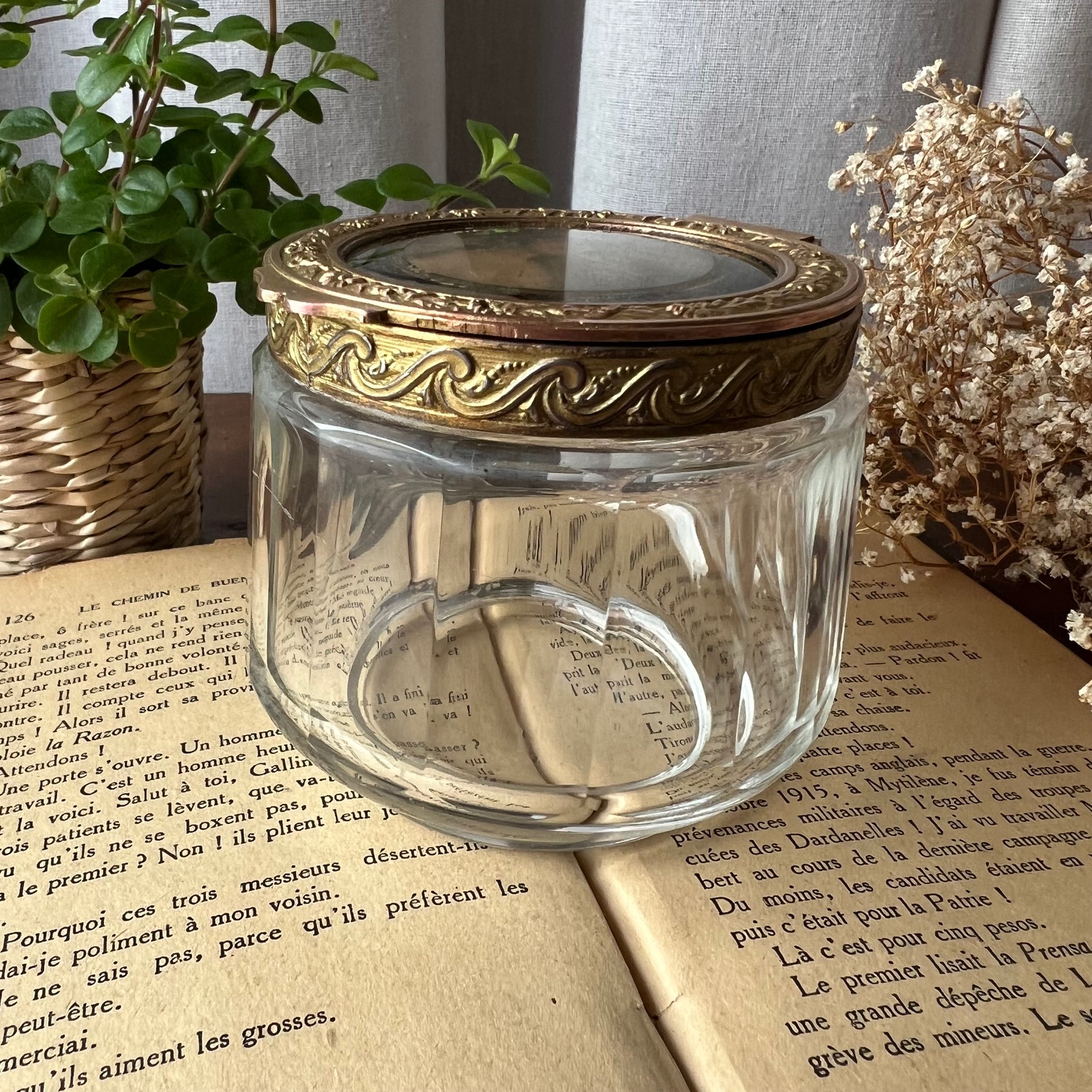 Elle trône là, comme un secret chuchoté par les coiffeuses d’antan. Une boîte à poudre de l’époque Art déco, en verre lourd et facetté, surmontée d’un couvercle à charnière finement ouvragé de feuillages en relief doré. Un travail délicat, à la frontière du bijou et de l’objet d’usage.
