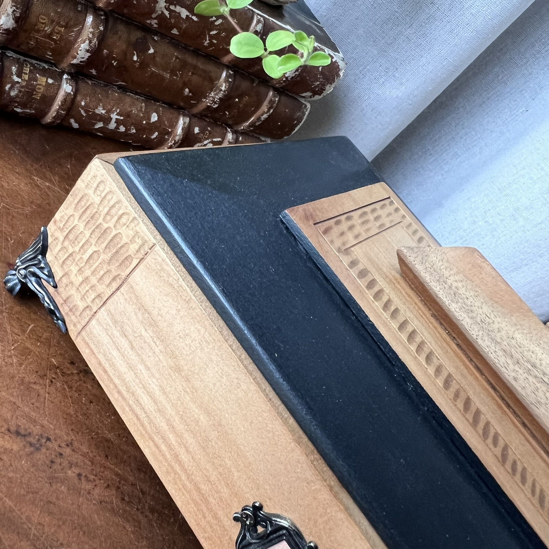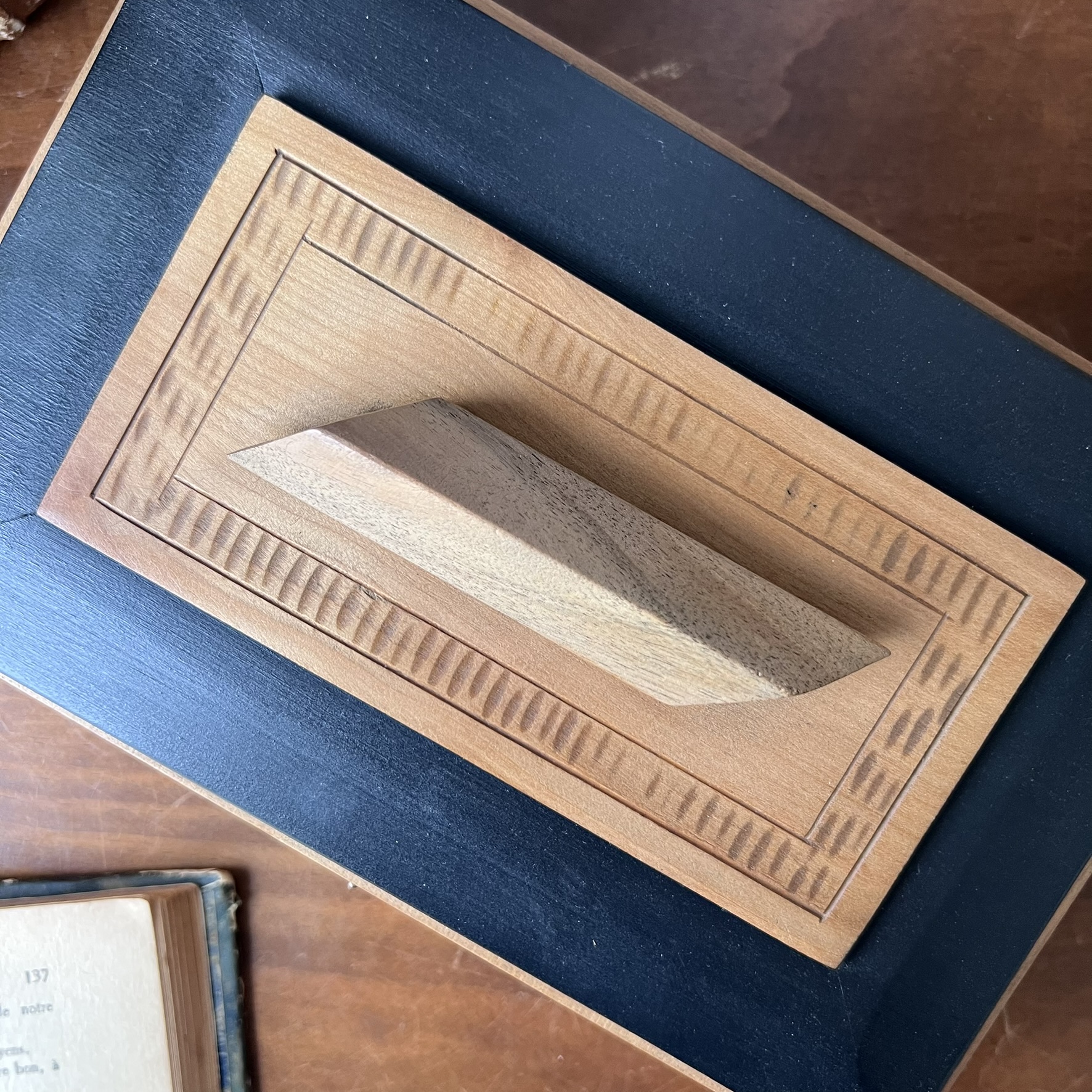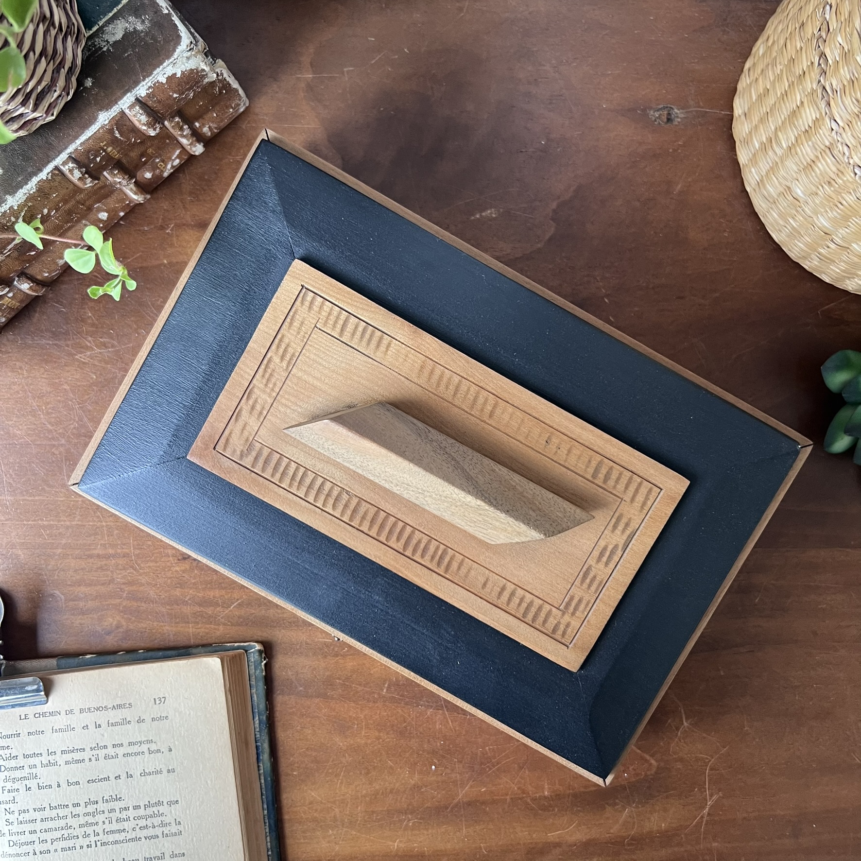 Une boîte art déco tout en bois, aux lignes franches, avec ce couvercle amovible surmonté d’une grosse poignée en bois – typique, assumée, sculpturale.