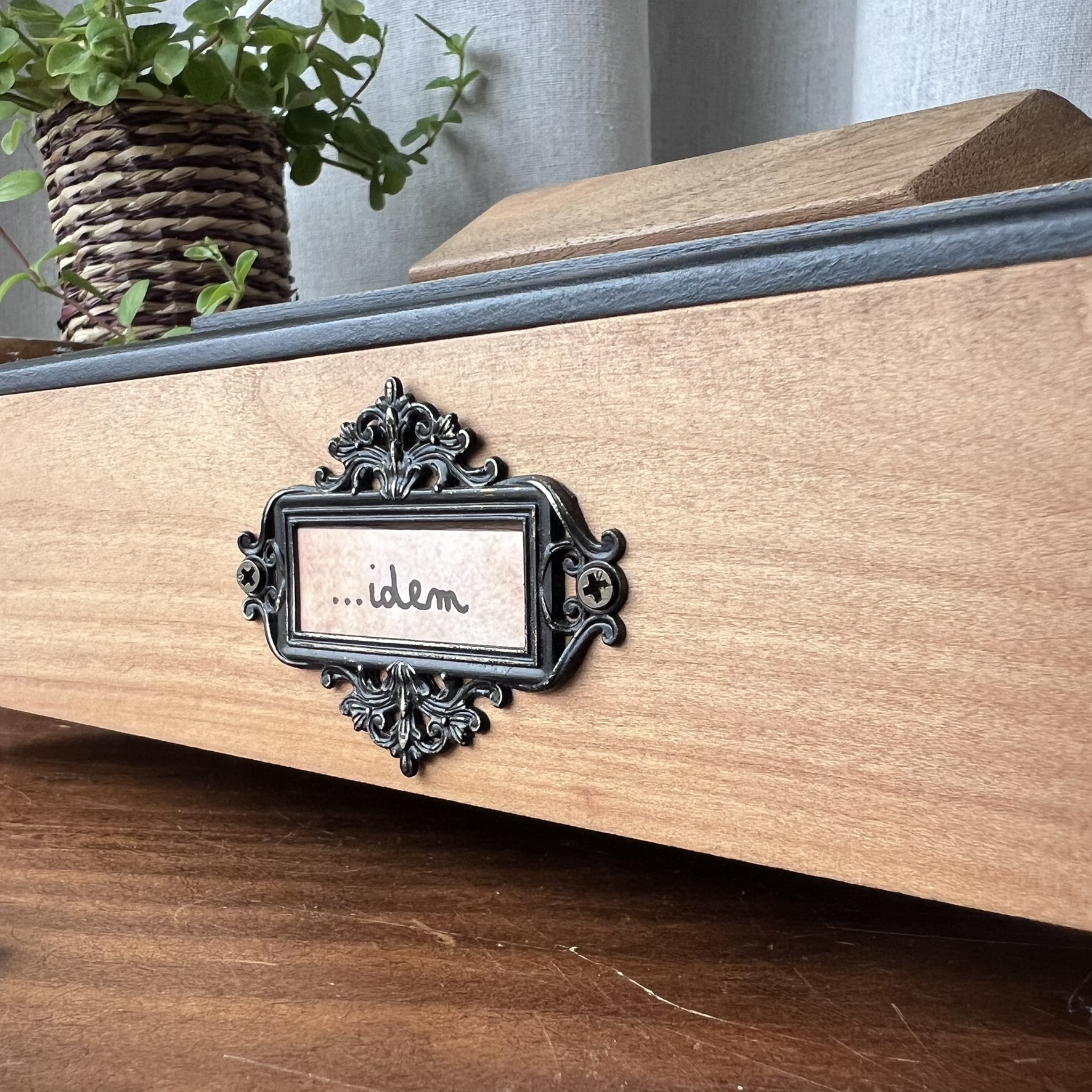 Elle repose sur quatre petits pieds en métal doré. Juste ce qu’il faut pour la soulever du quotidien. Et puis, sur le devant, ce porte-étiquette. Avec un seul mot : « Idem »… comme une réponse. Comme un écho.