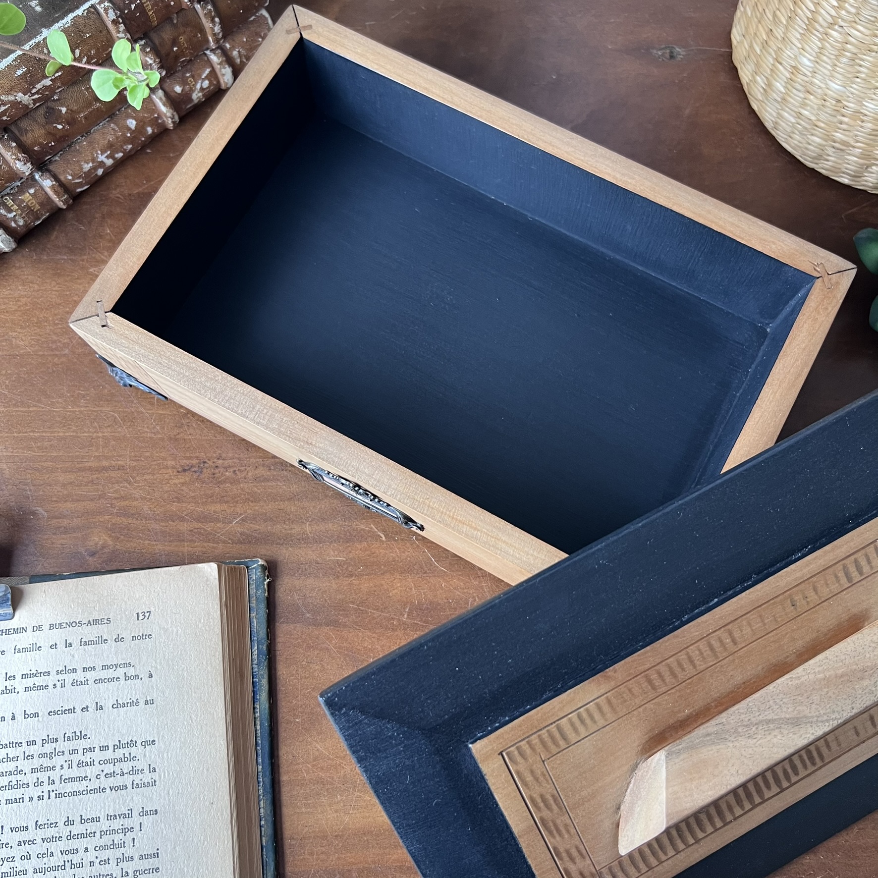 Le bois sculpté dialogue avec un noir mat profond, posé sur le couvercle… et à l’intérieur aussi. Un noir qui absorbe la lumière, qui contraste avec la chaleur du bois.