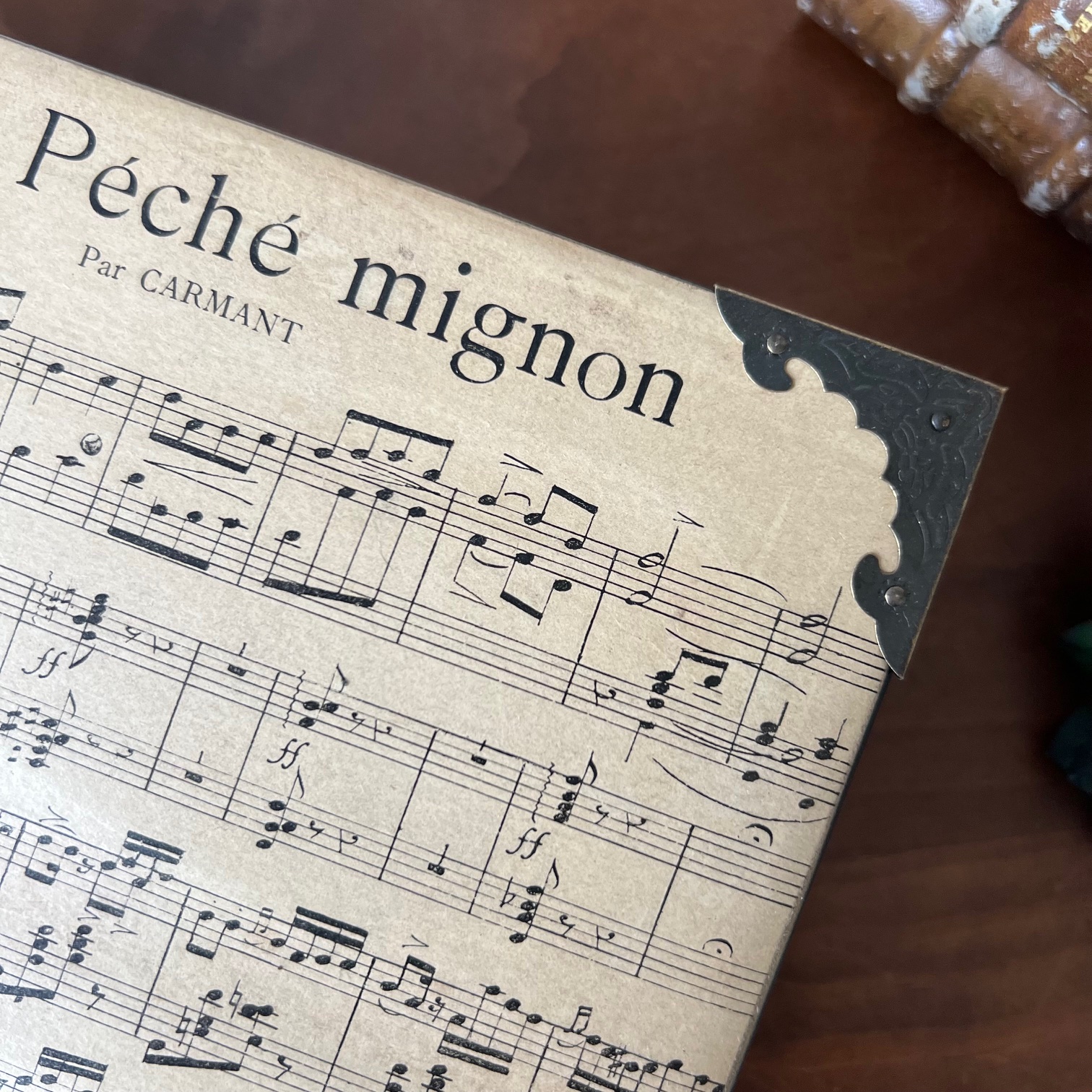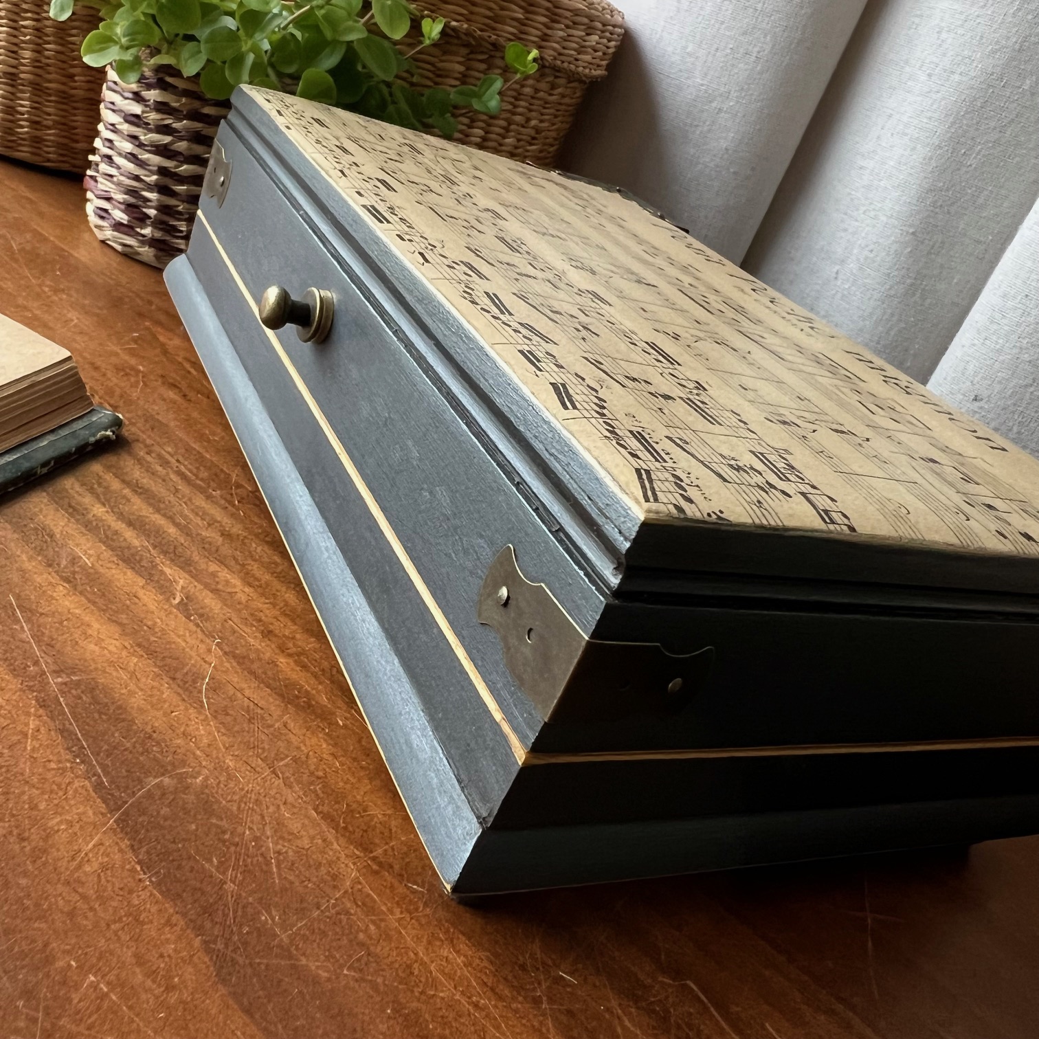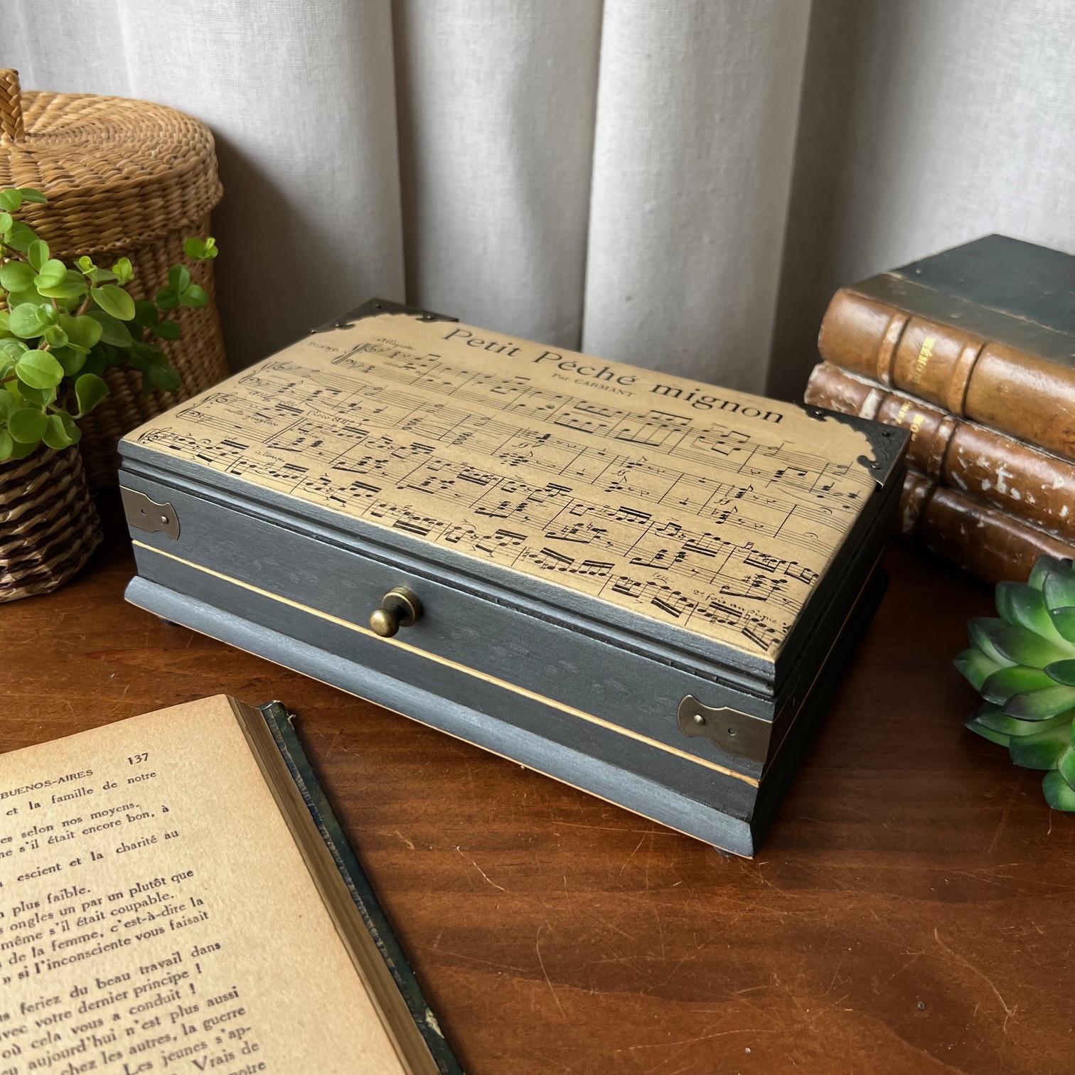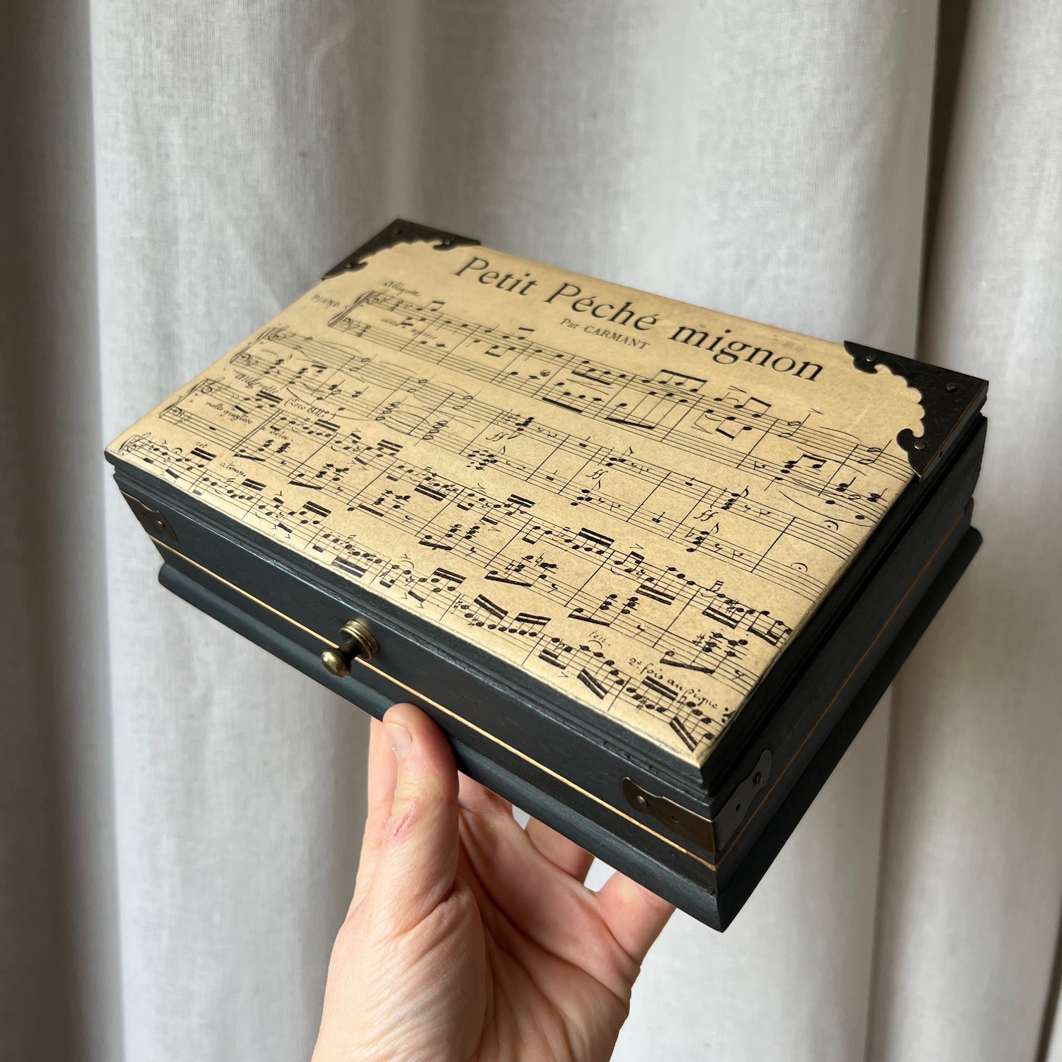 La boîte a été entièrement poncée puis patinée en noir. Sur le couvercle, une ancienne partition de musique, « Petit péché mignon », a été contre-collée puis protégée. Un clin d’œil délicieusement assumé.