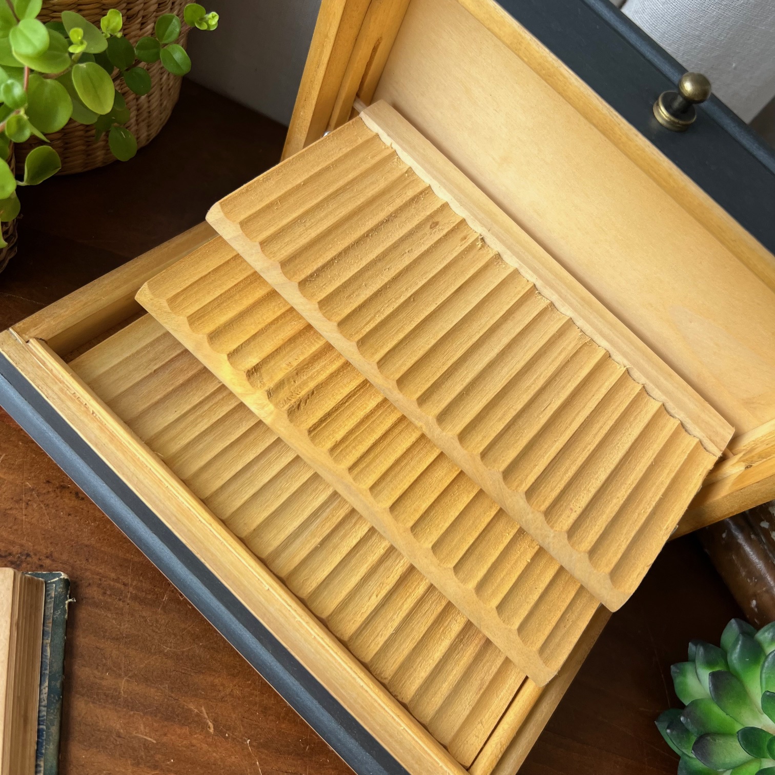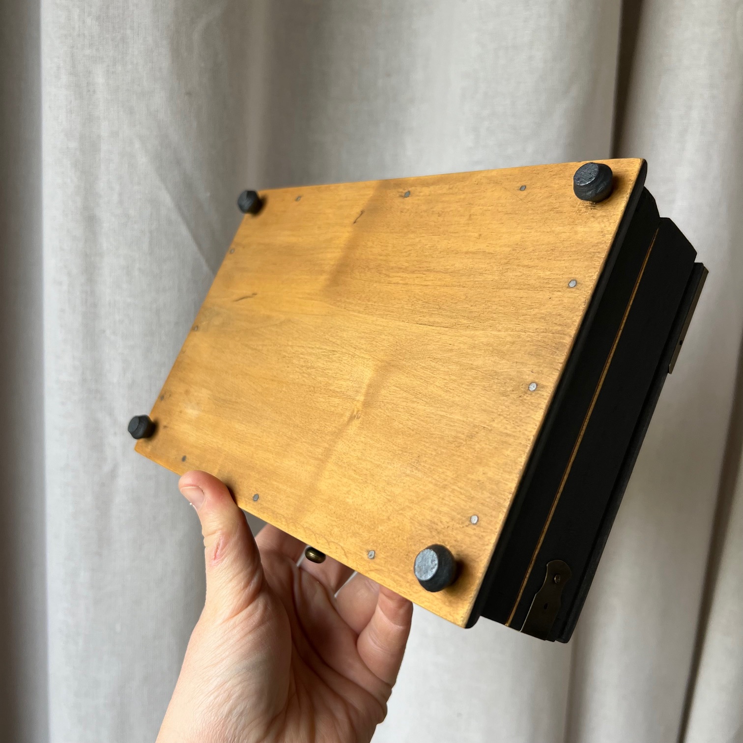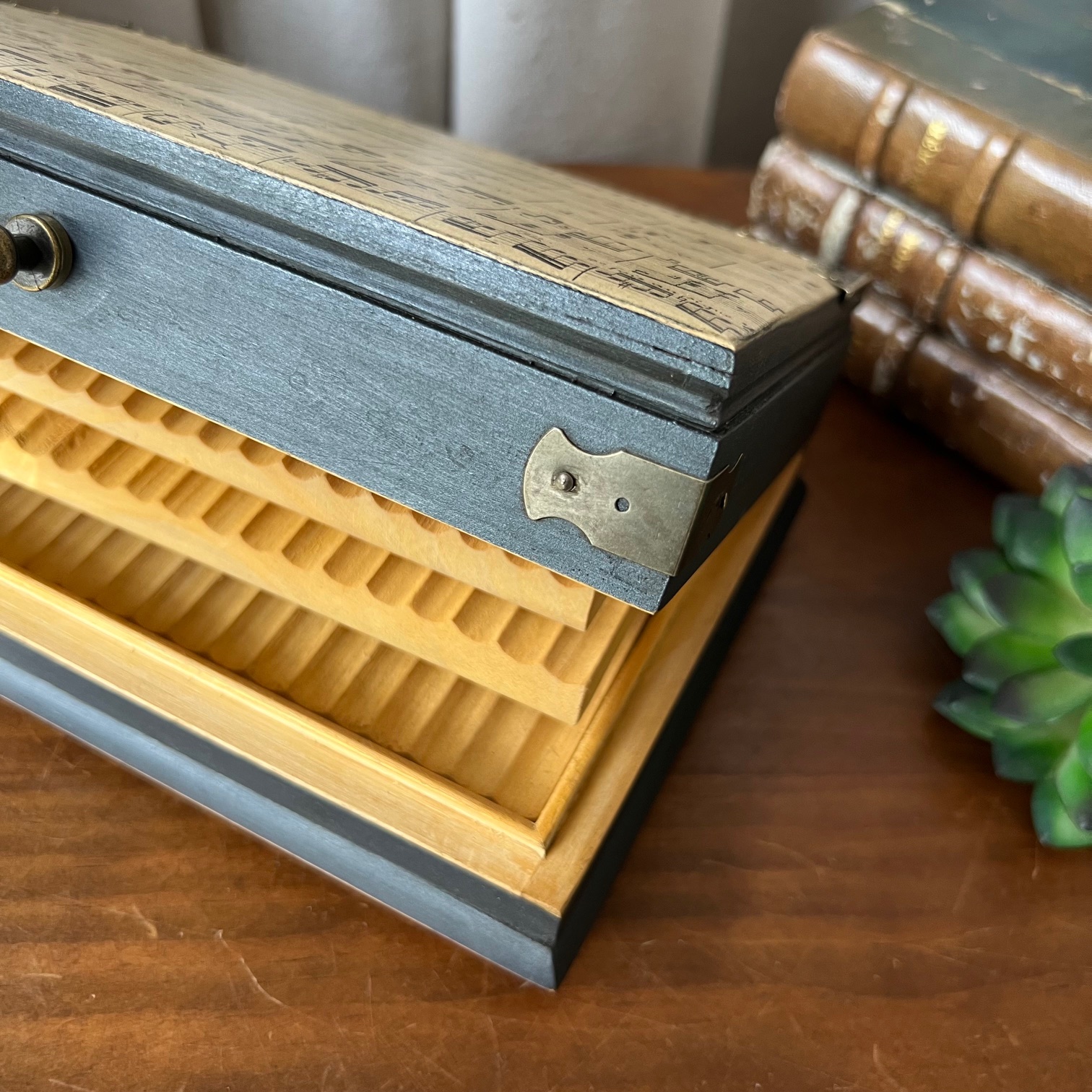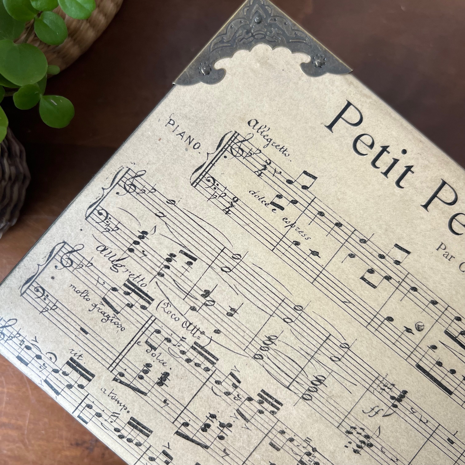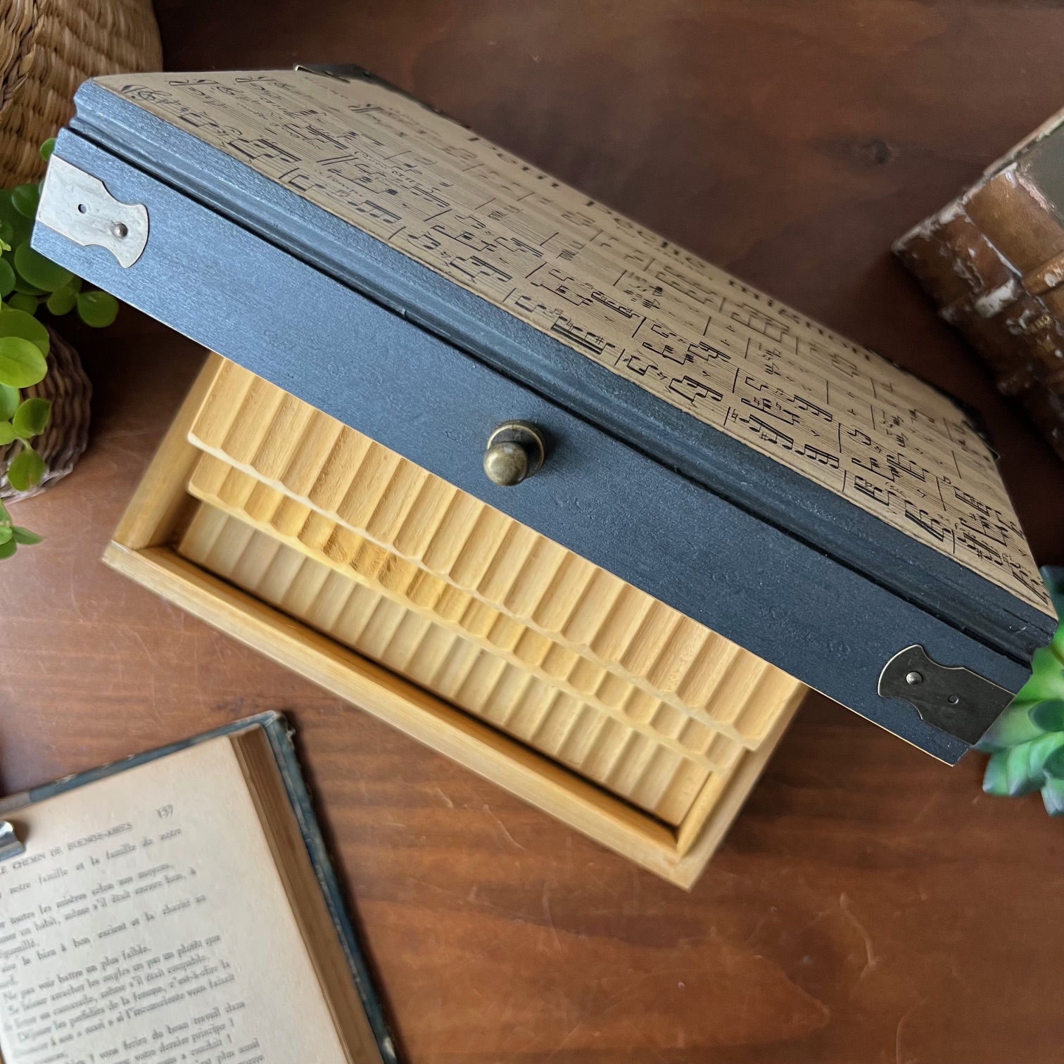 La boîte a été entièrement poncée puis patinée en noir. Sur le couvercle, une ancienne partition de musique, « Petit péché mignon », a été contre-collée puis protégée. Un clin d’œil délicieusement assumé.