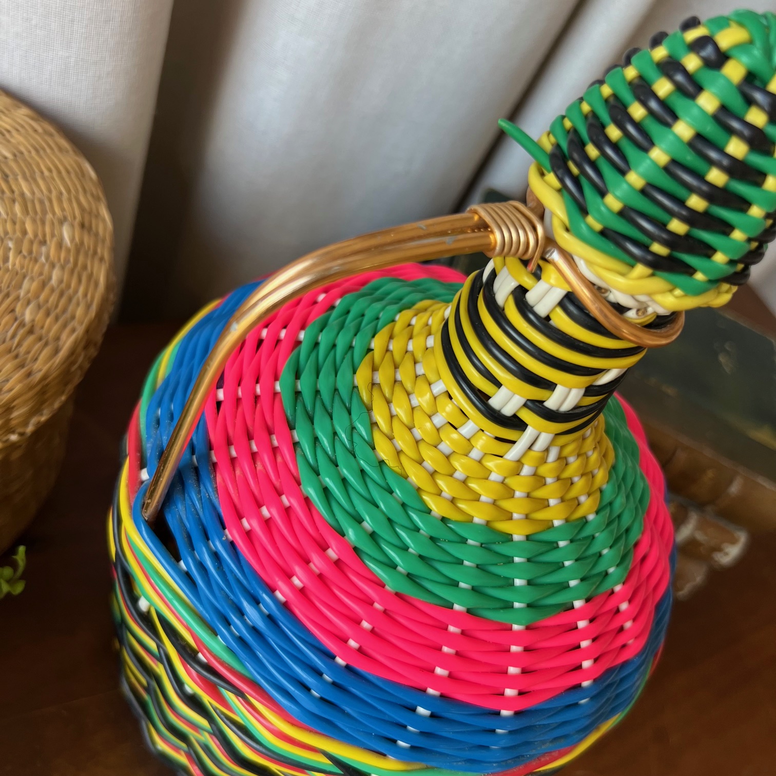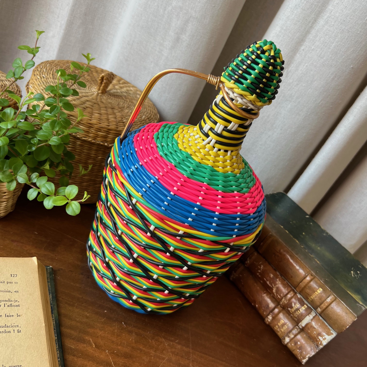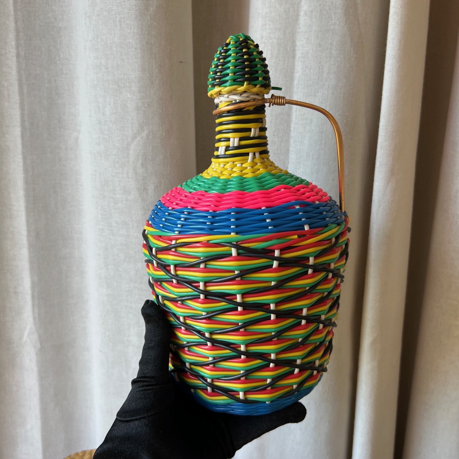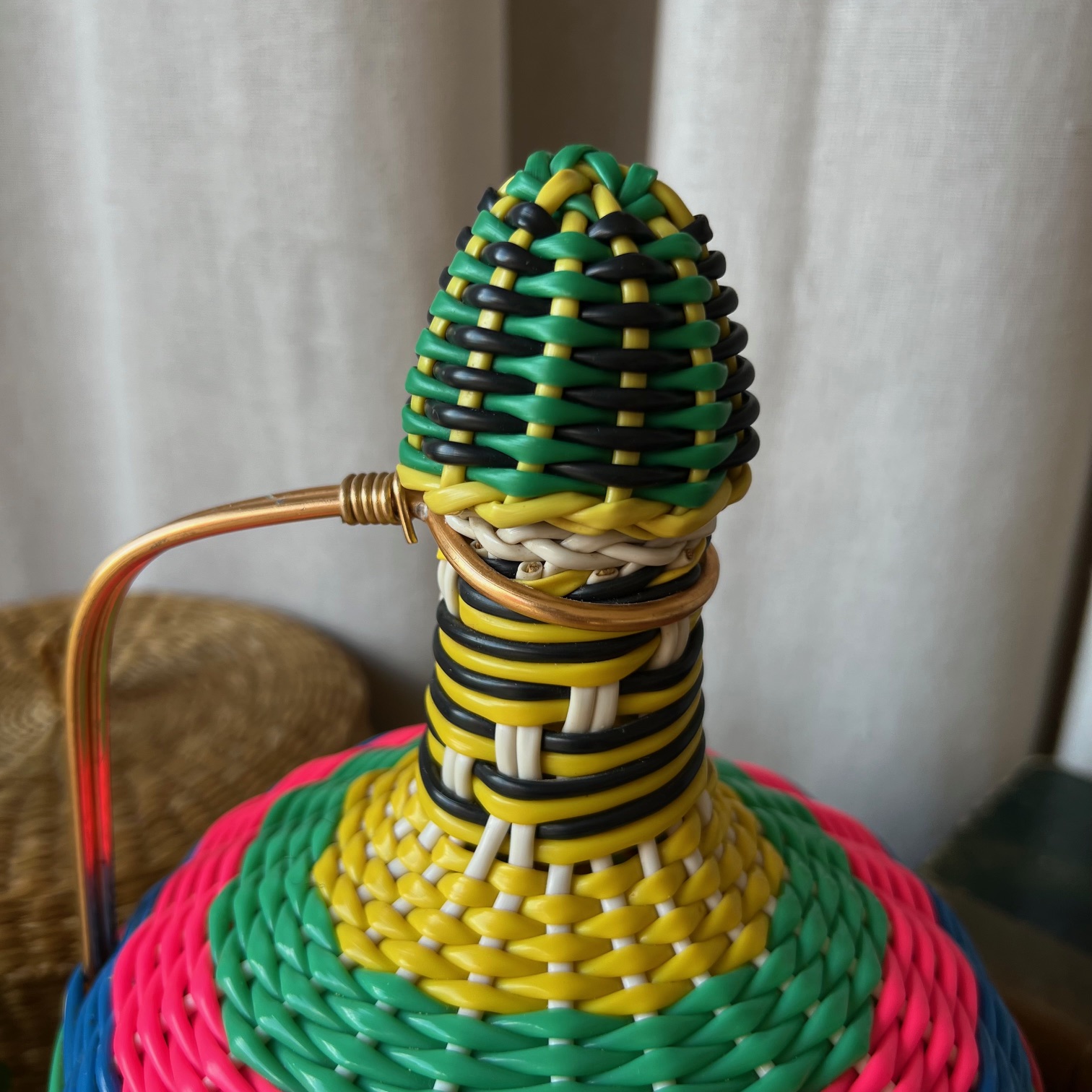 Voici une bonbonne ancienne, entièrement enrubannée de brins de scoubidou multicolores – rose fluo, bleu électrique, vert gazon, jaune citron, noir profond… un festival de couleurs qui fleure bon les années 70.