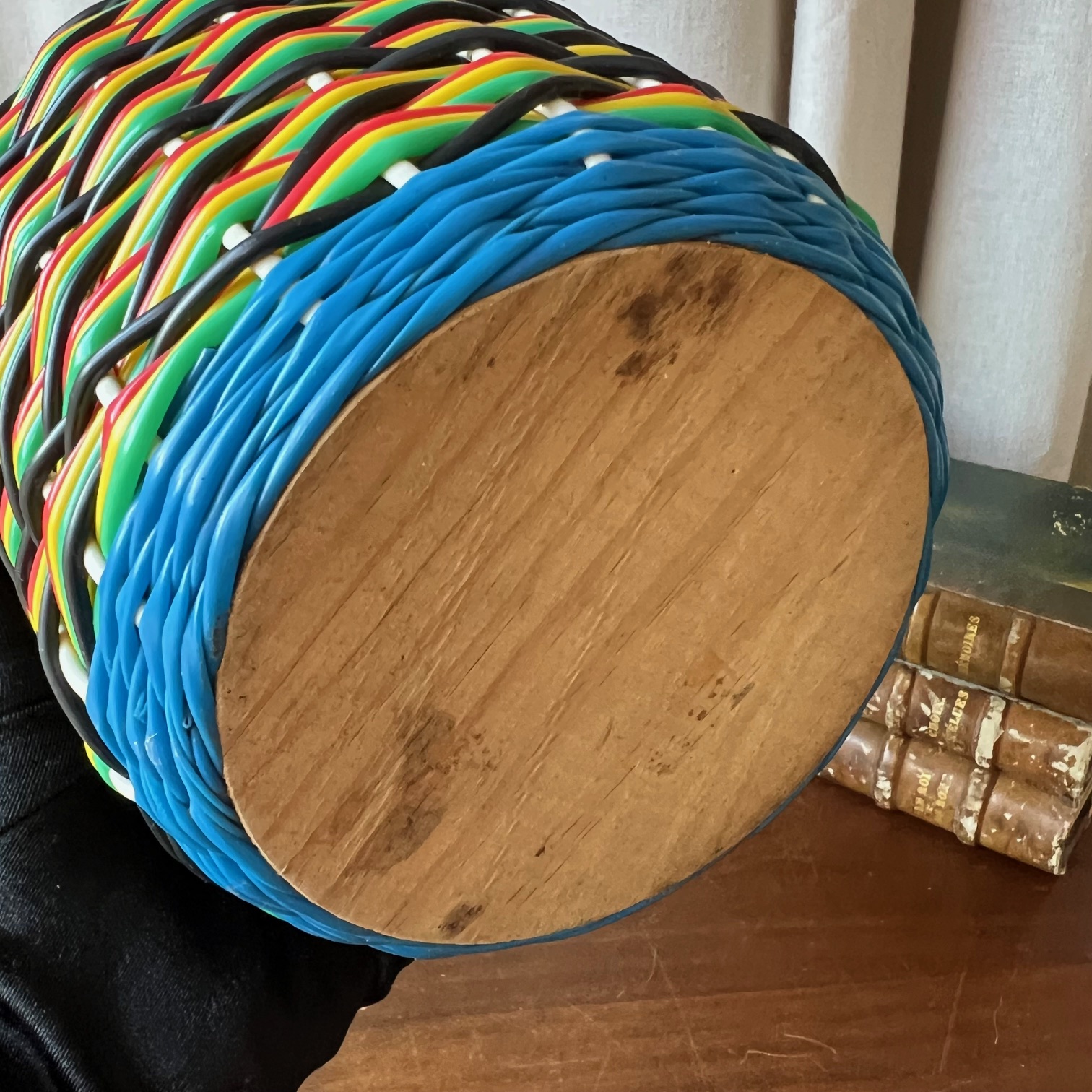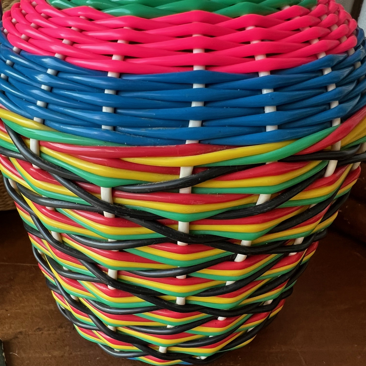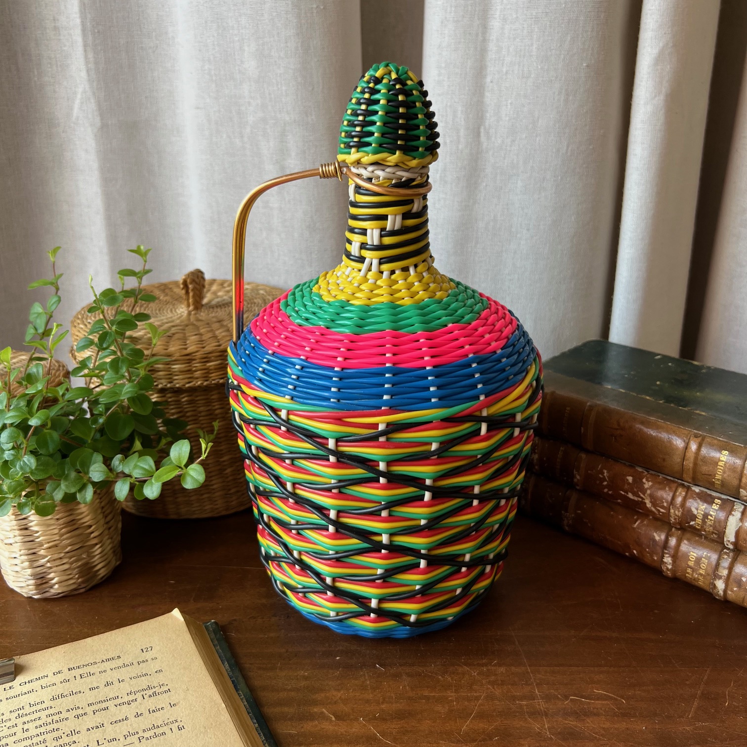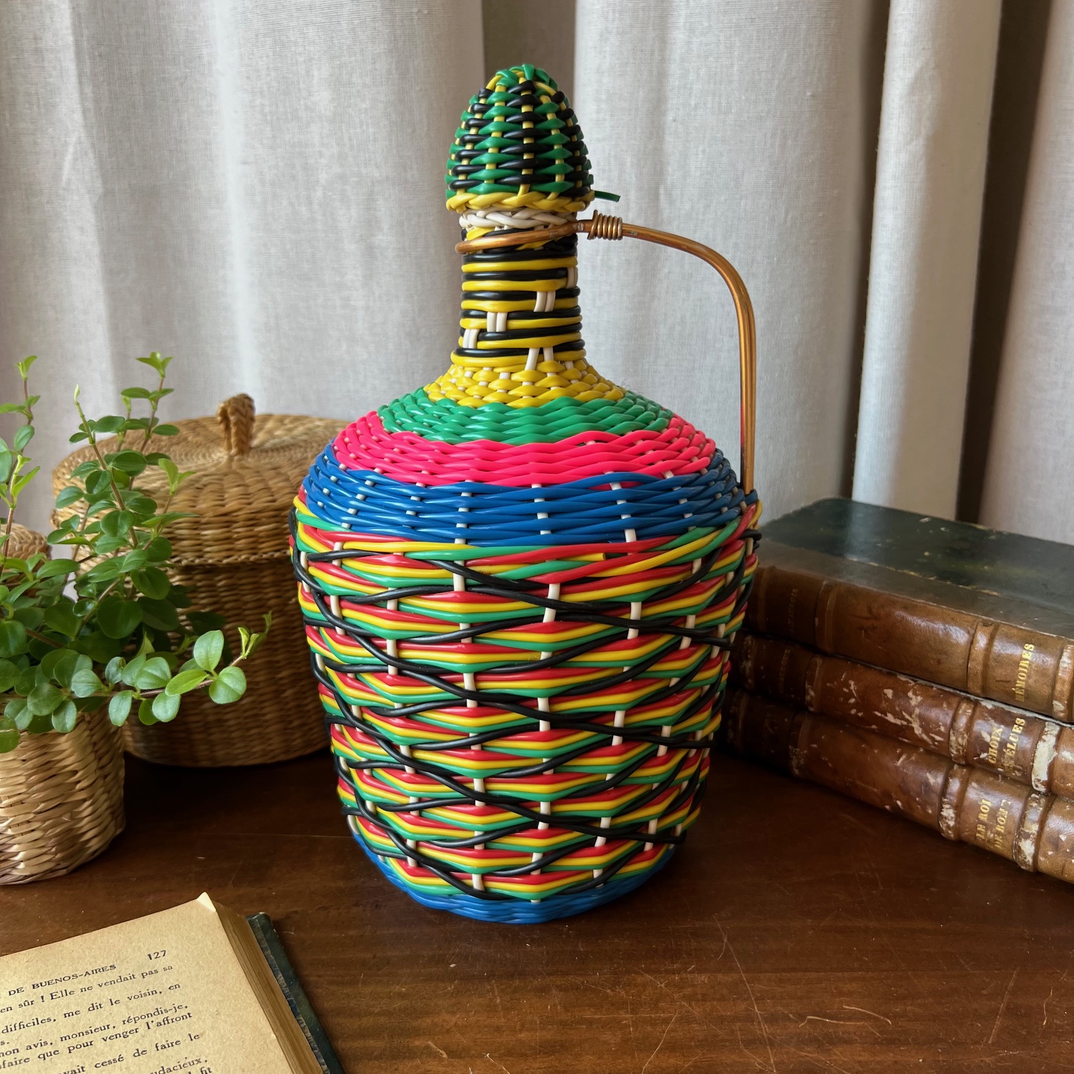 Voici une bonbonne ancienne, entièrement enrubannée de brins de scoubidou multicolores – rose fluo, bleu électrique, vert gazon, jaune citron, noir profond… un festival de couleurs qui fleure bon les années 70.