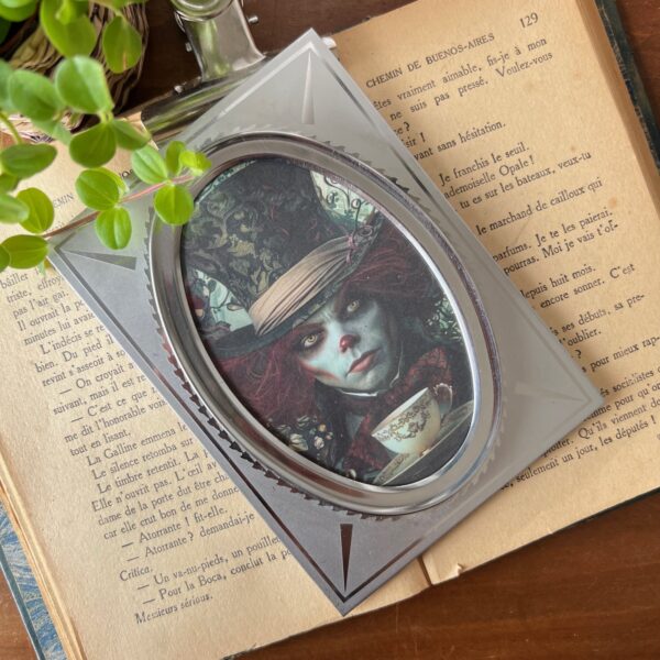 Le verre d’origine protège un médaillon ovale où glisser une photo, une carte postale ancienne, ou pourquoi pas un petit poème.