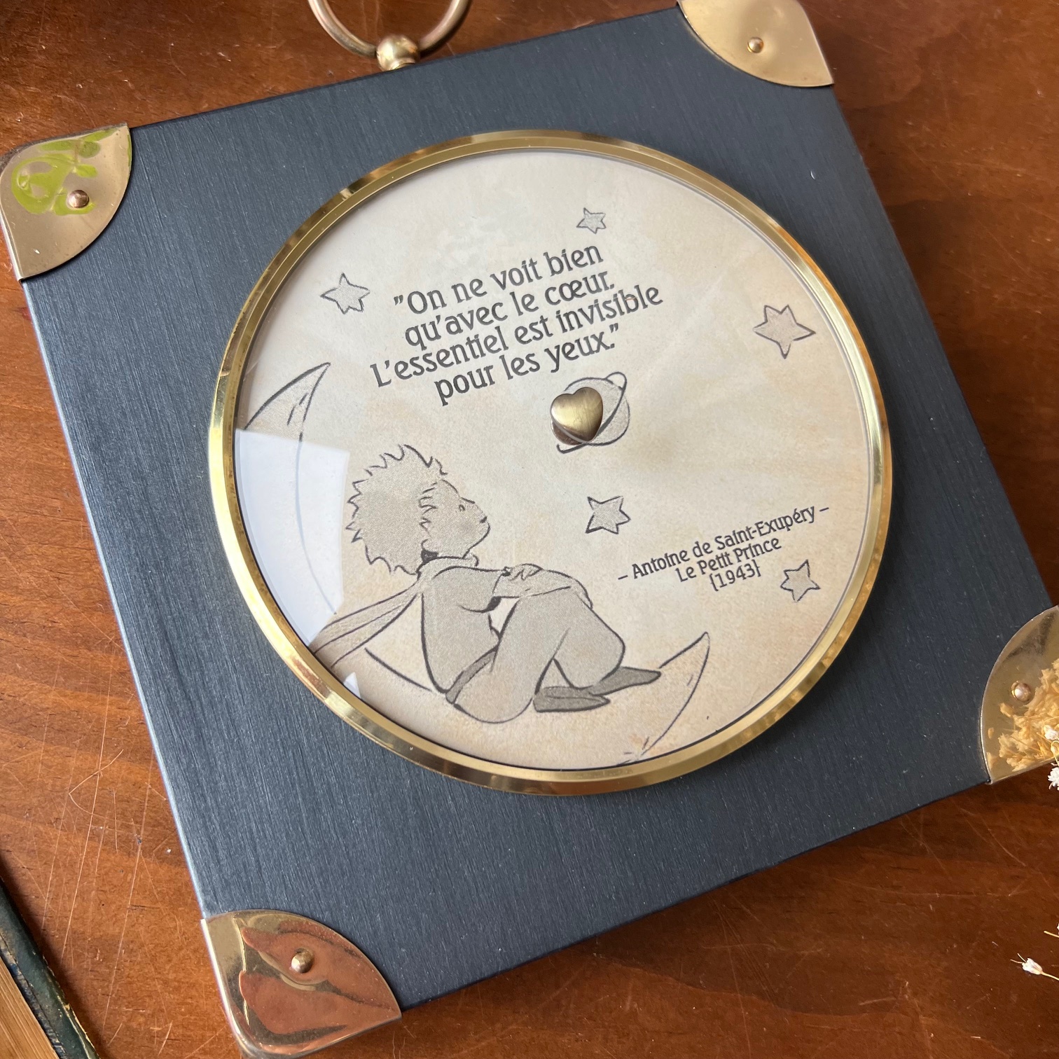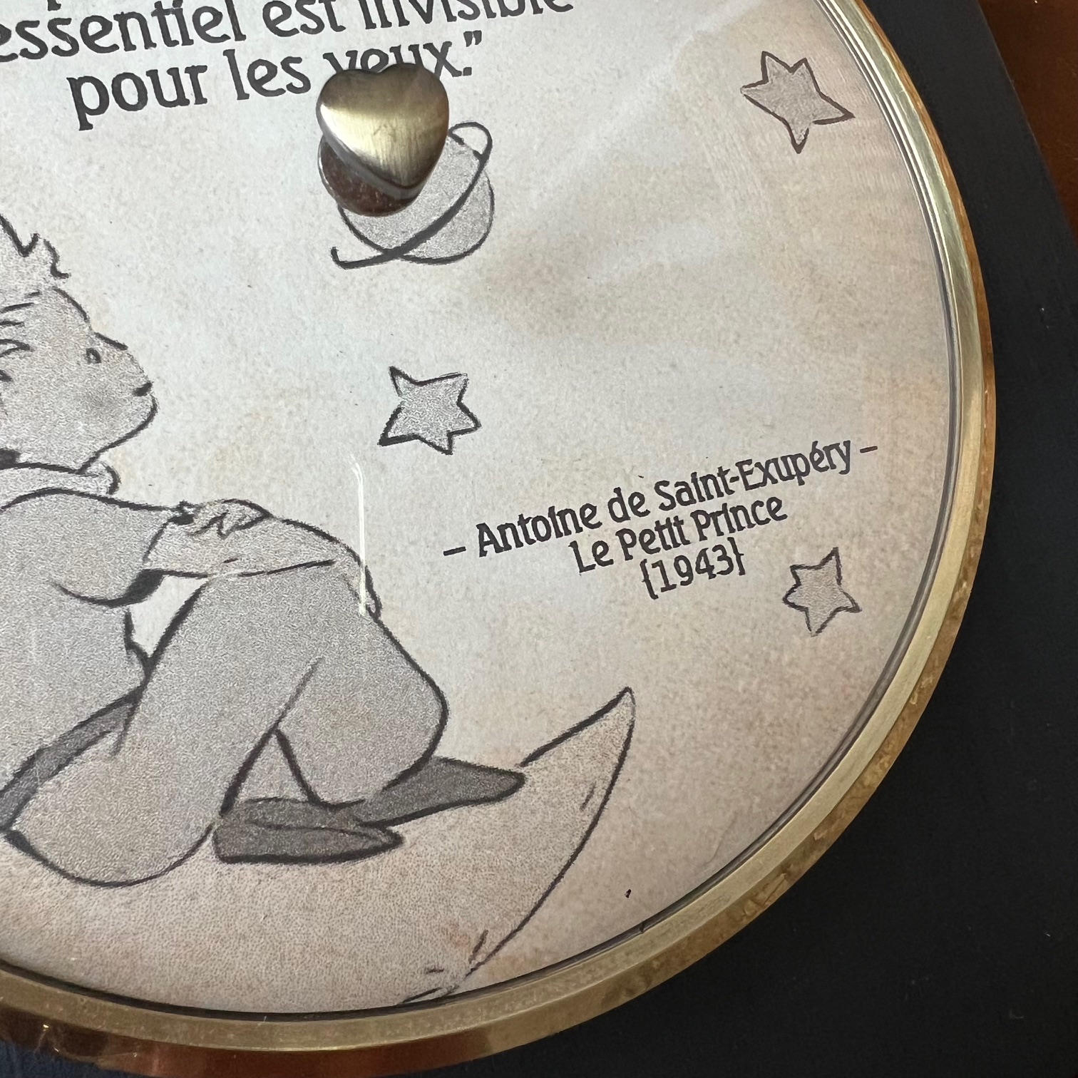 Et sous ce cœur, quelques mots d’Antoine de Saint-Exupéry, gravés dans l’âme de cet objet : « On ne voit bien qu’avec le cœur. L’essentiel est invisible pour les yeux. »