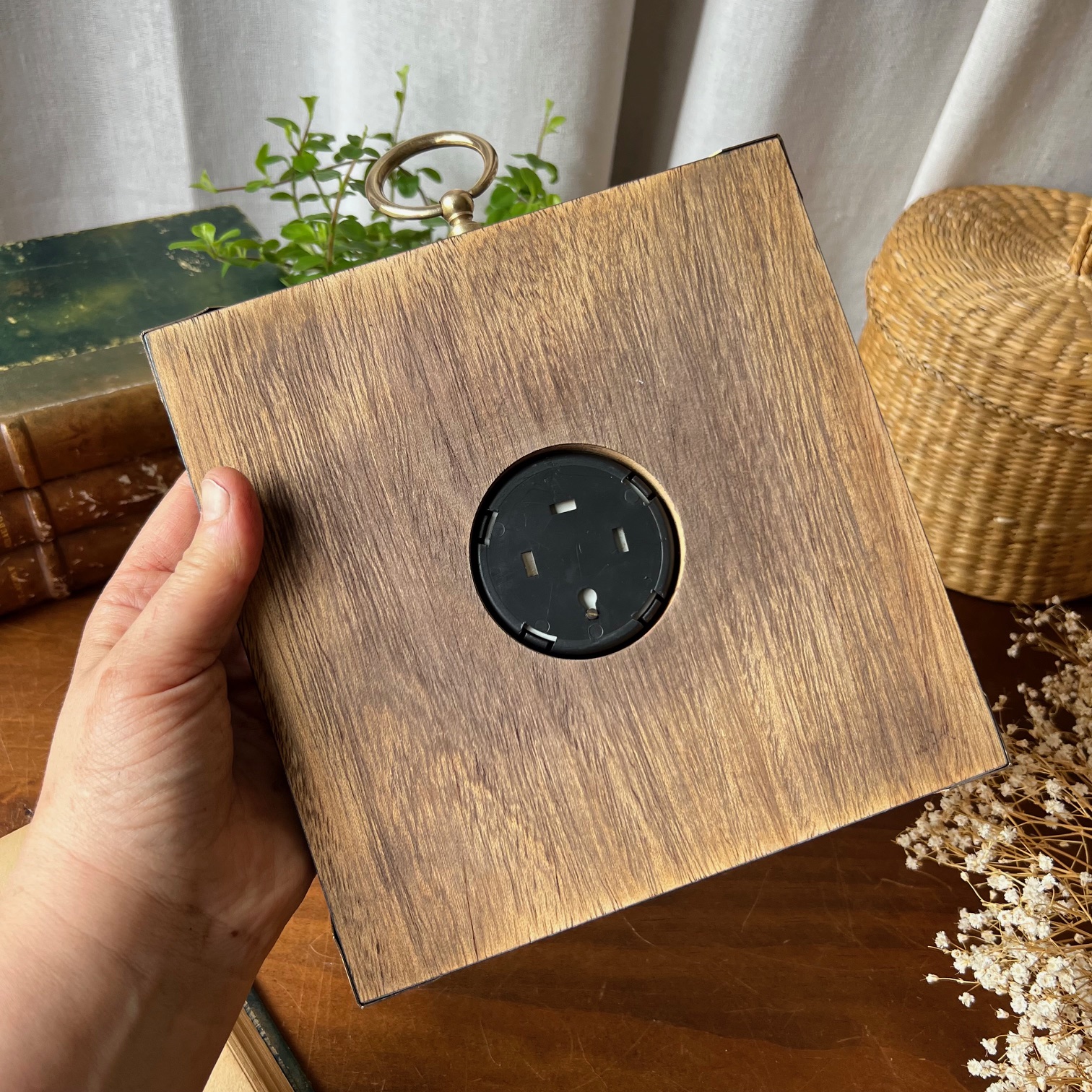 Le mécanisme fatigué ne disait plus le temps. Alors, doucement, il a été retiré. Le cadre, patiné en noir, garde fièrement ses coins et sa boucle d’accroche en laiton, comme un rappel de ses origines.