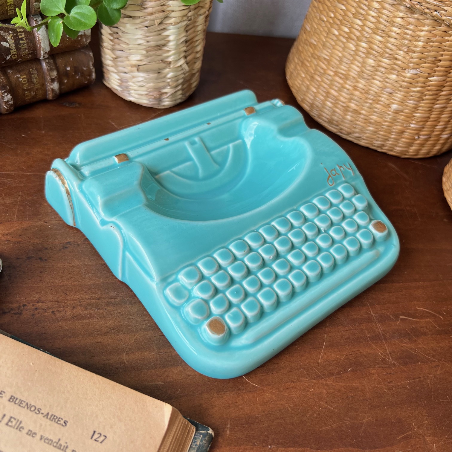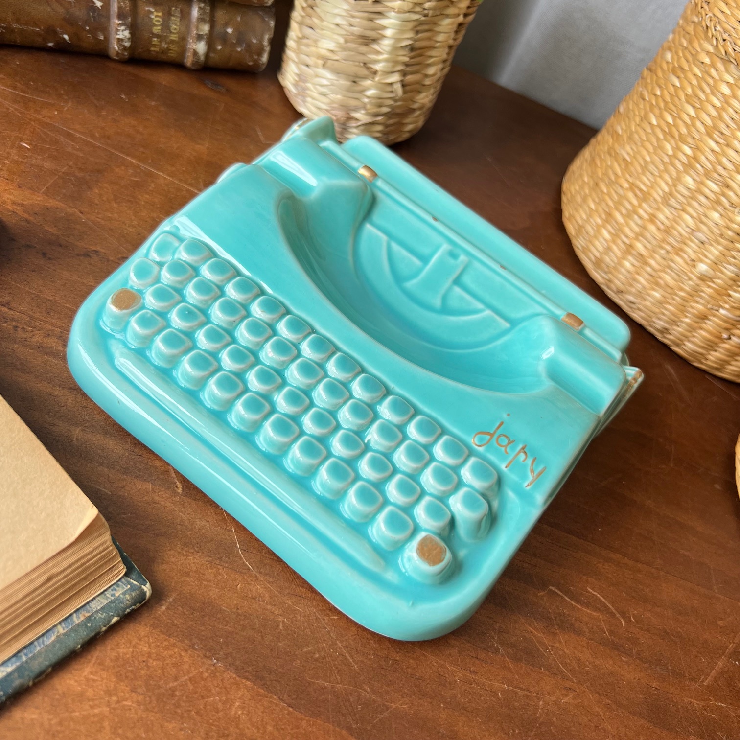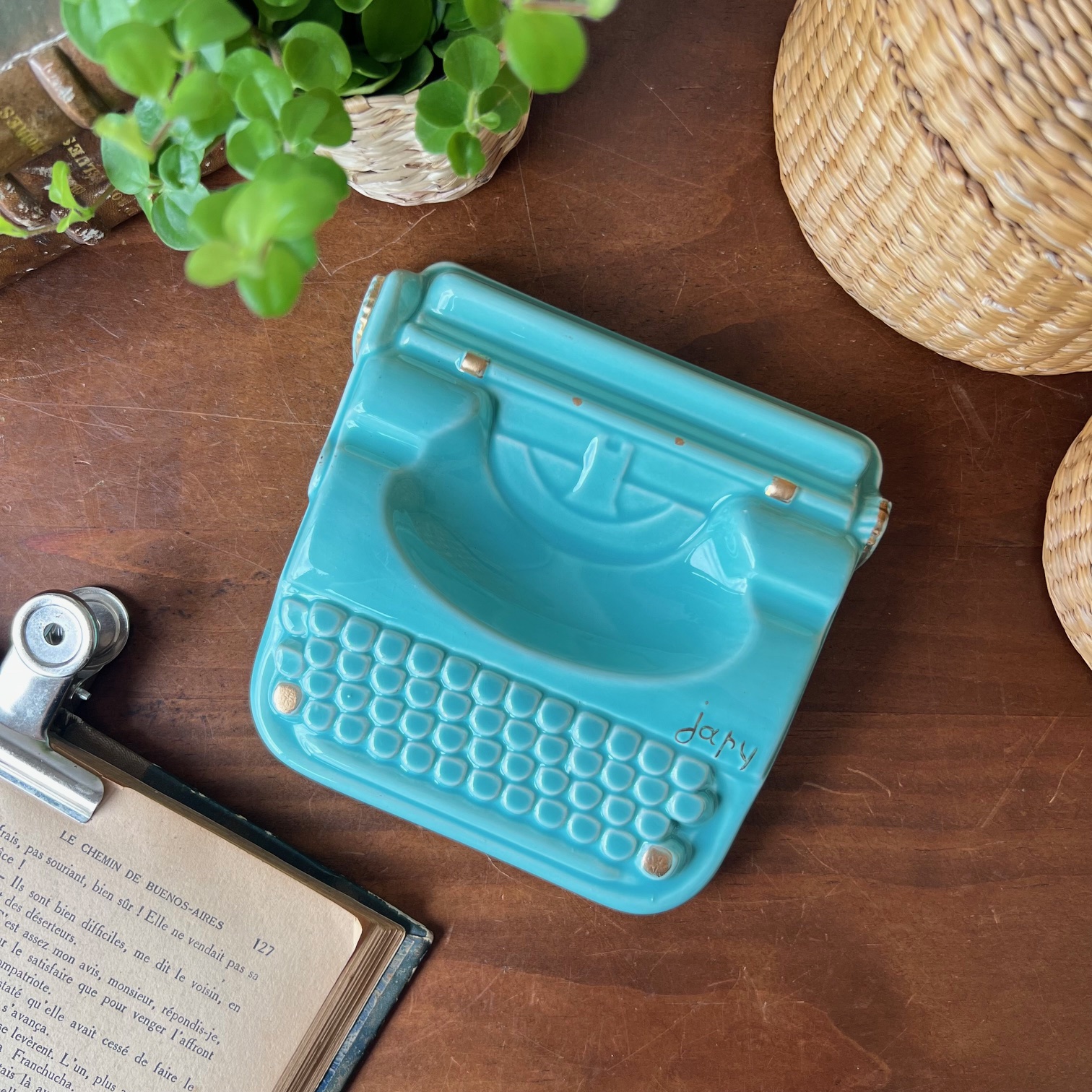 Voici un cendrier vintage en céramique, en forme de machine à écrire turquoise, signé Japy — une pièce pleine de charme et d’humour, entre design décoratif et hommage aux icônes de bureau d’autrefois.