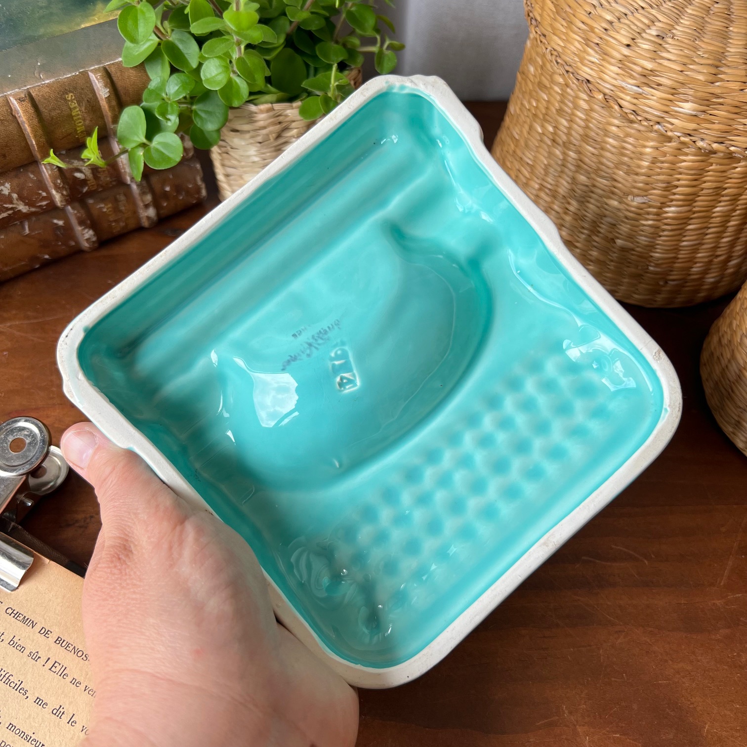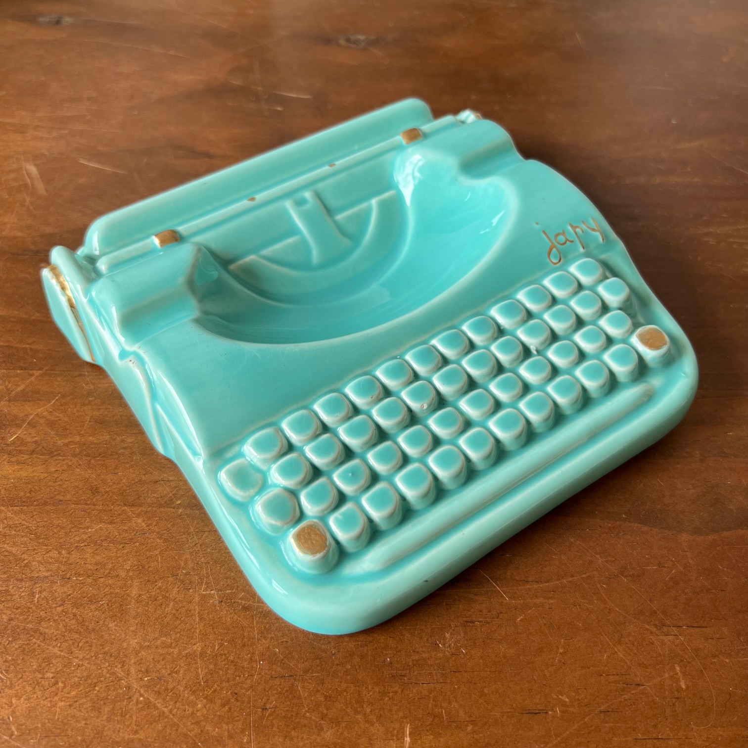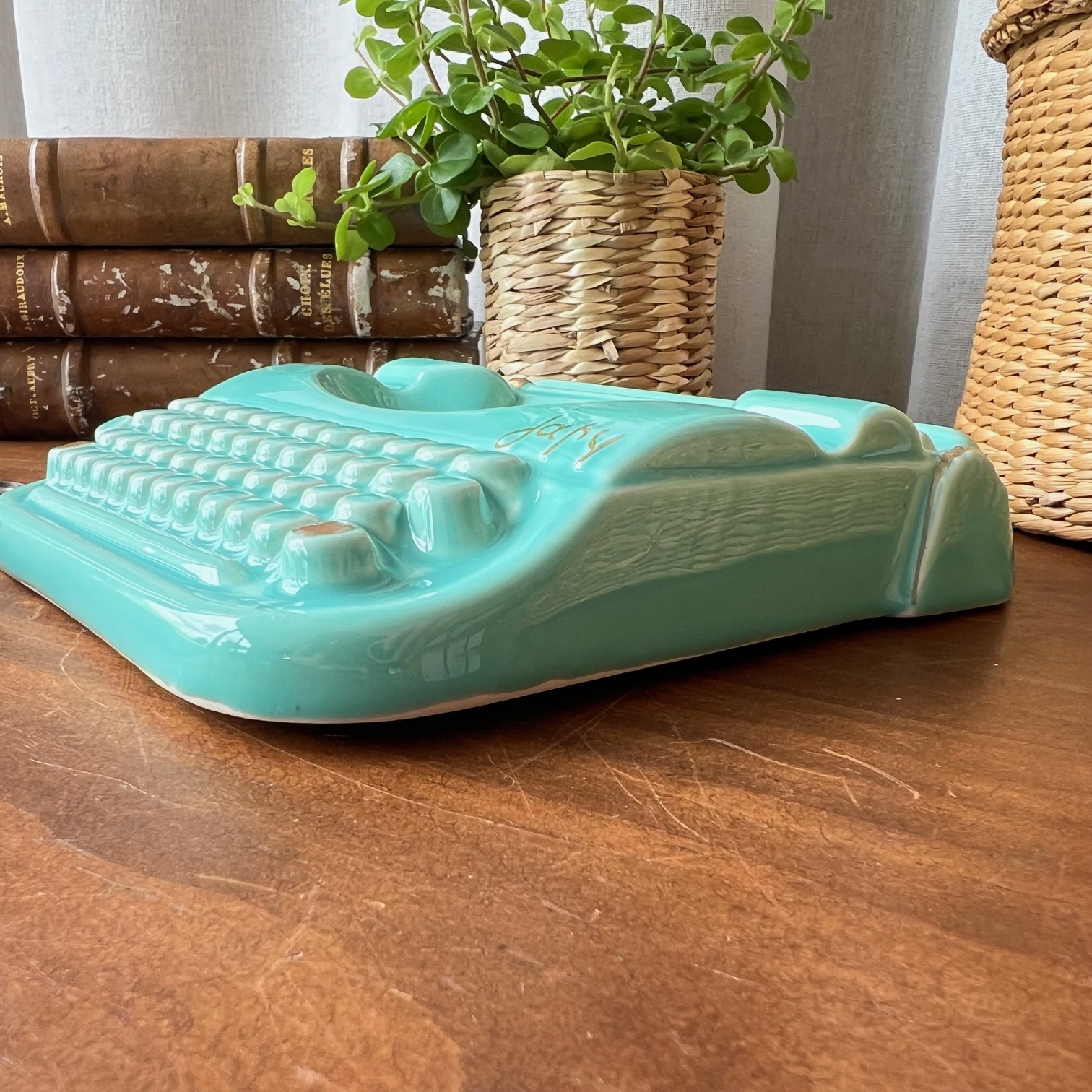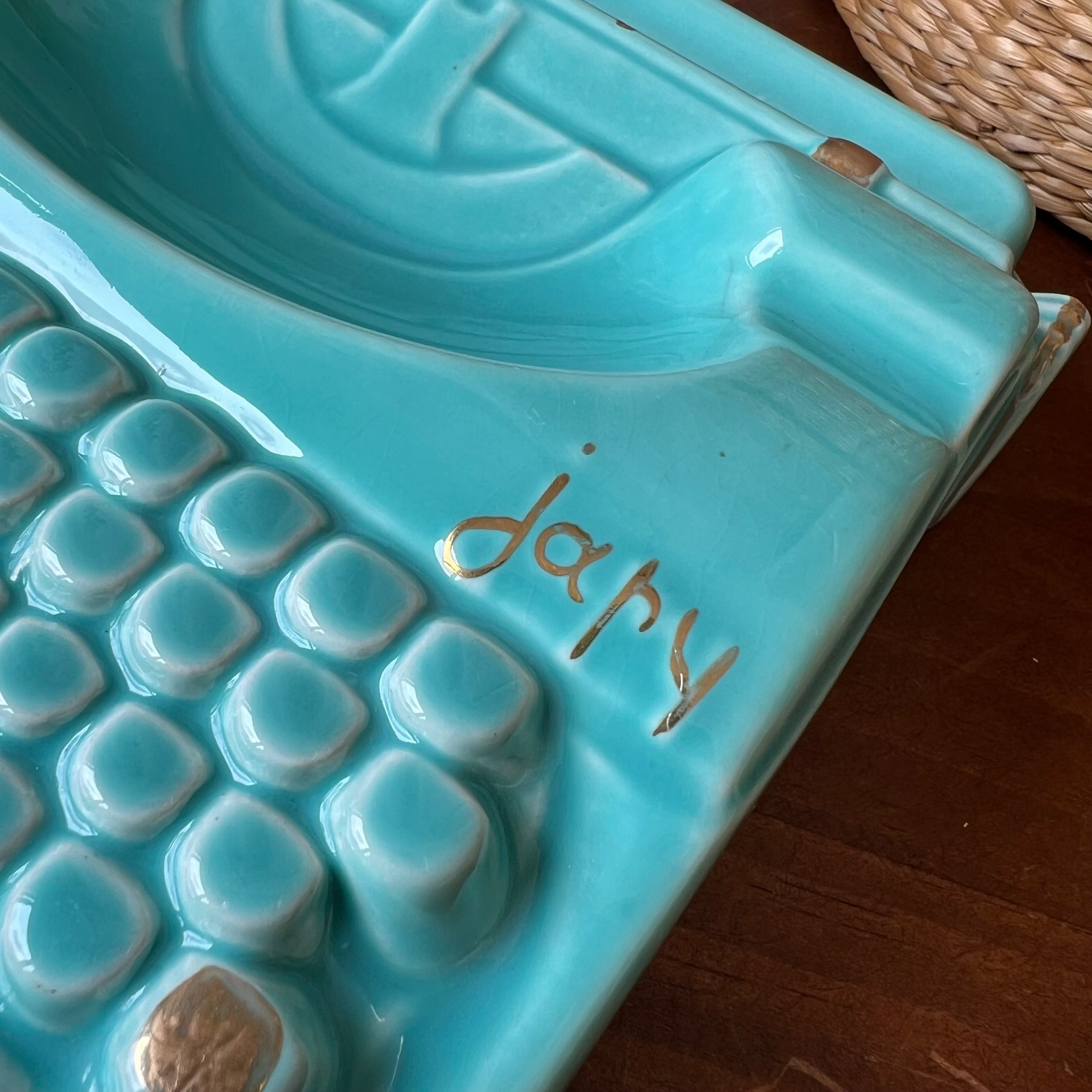 Voici un cendrier vintage en céramique, en forme de machine à écrire turquoise, signé Japy — une pièce pleine de charme et d’humour, entre design décoratif et hommage aux icônes de bureau d’autrefois.