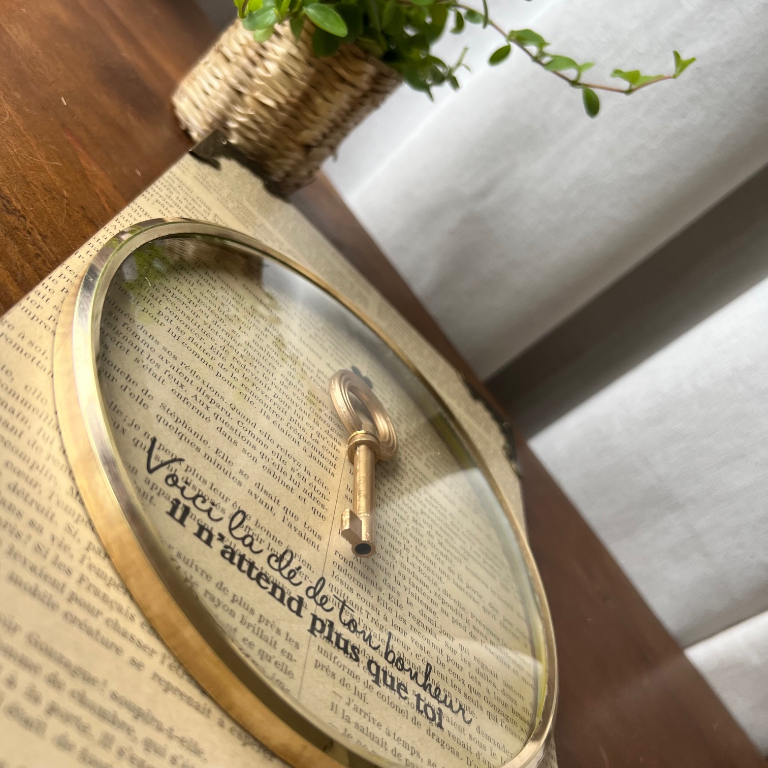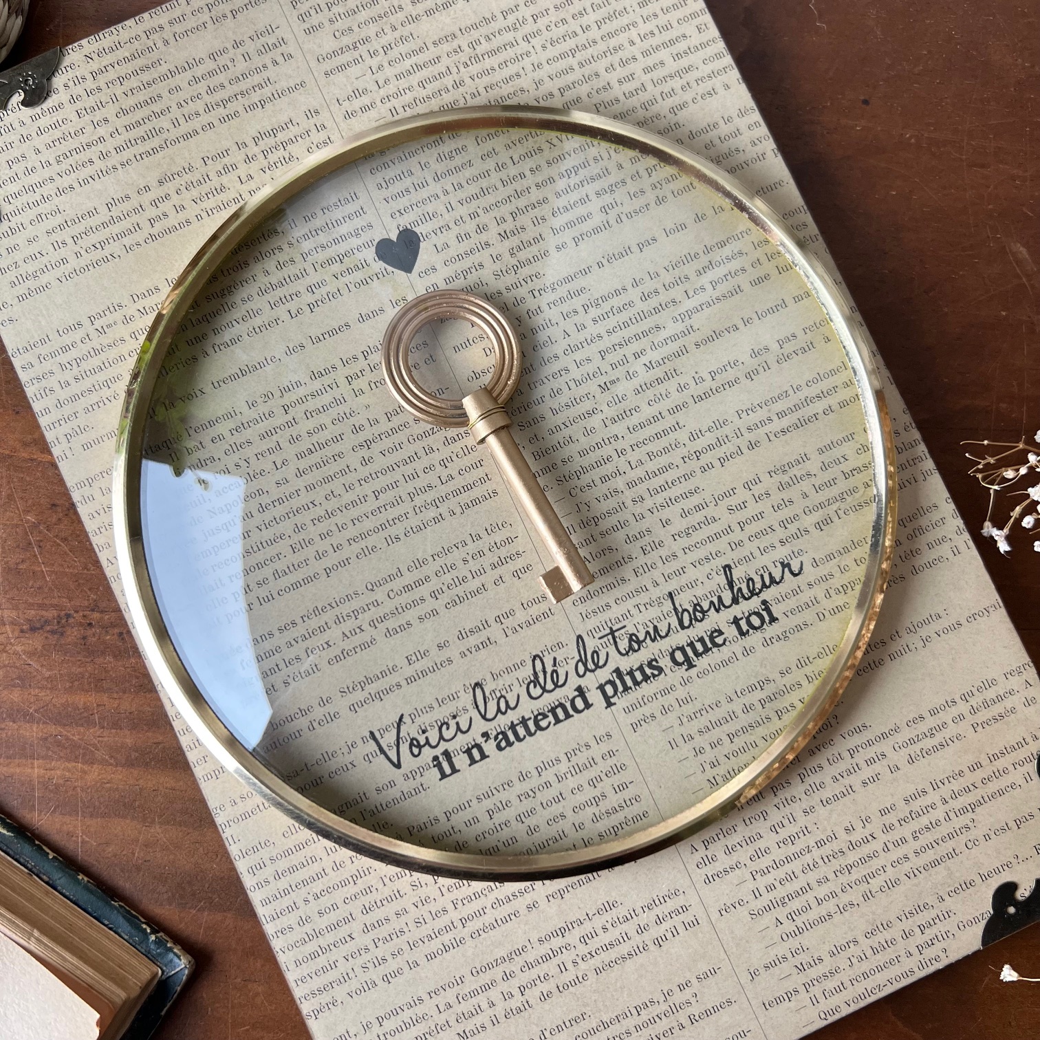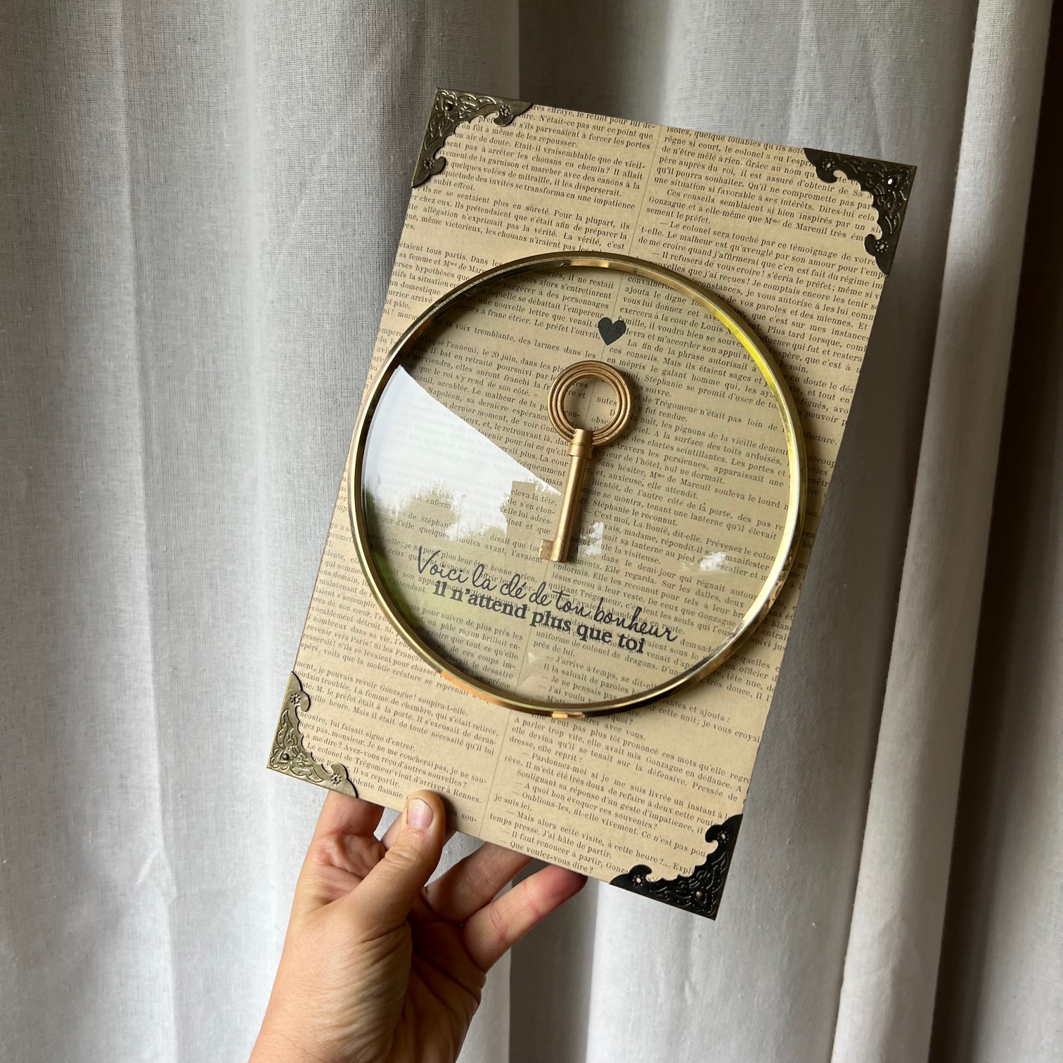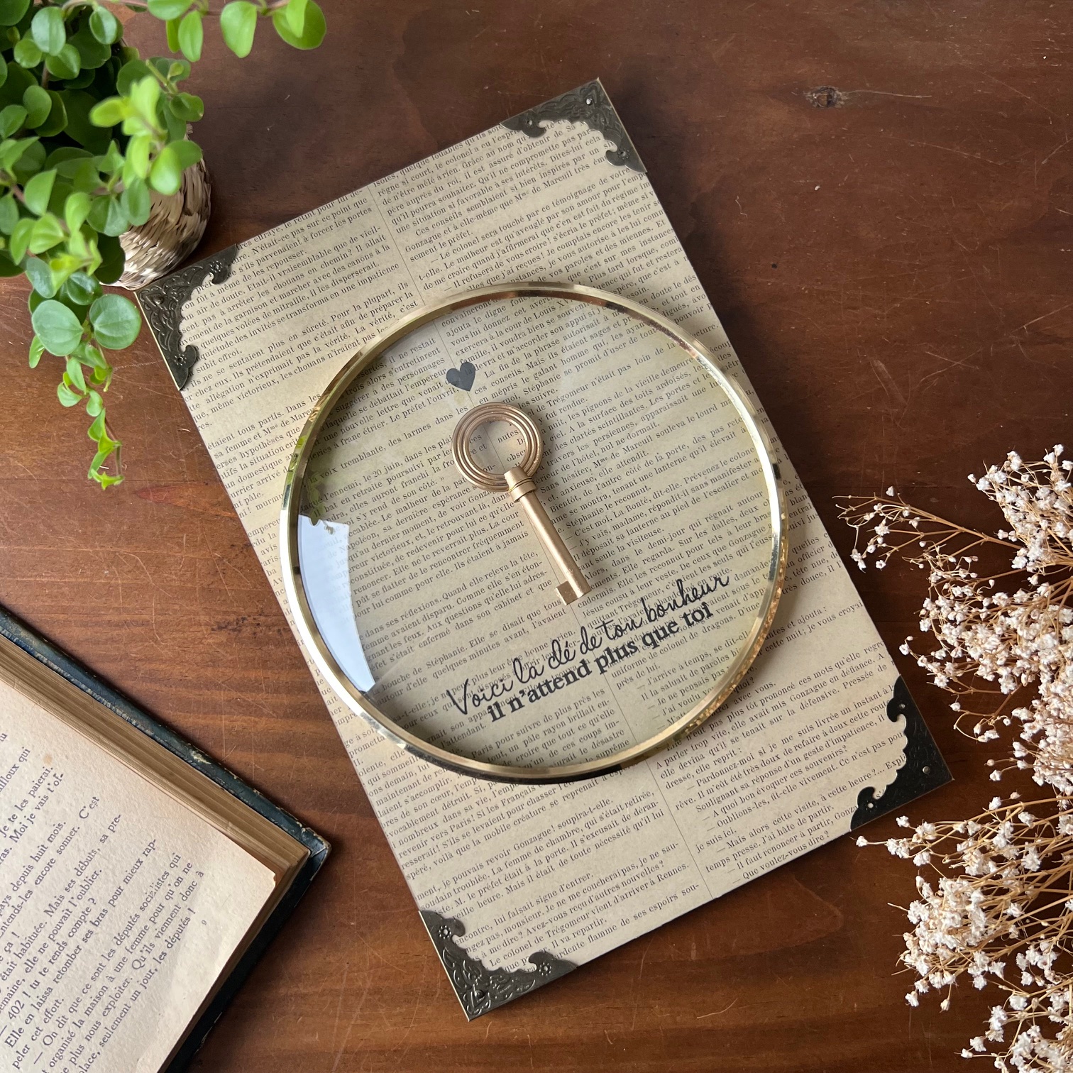 Aux quatre coins, des protections en métal doré viennent souligner l’écrin. Au centre, sous le verre bombé, une clé ancienne dorée se détache, accompagnée d’une inscription manuscrite et typographique : « Voici la clé de ton bonheur, il n’attend plus que toi »… et d’un petit cœur noir.