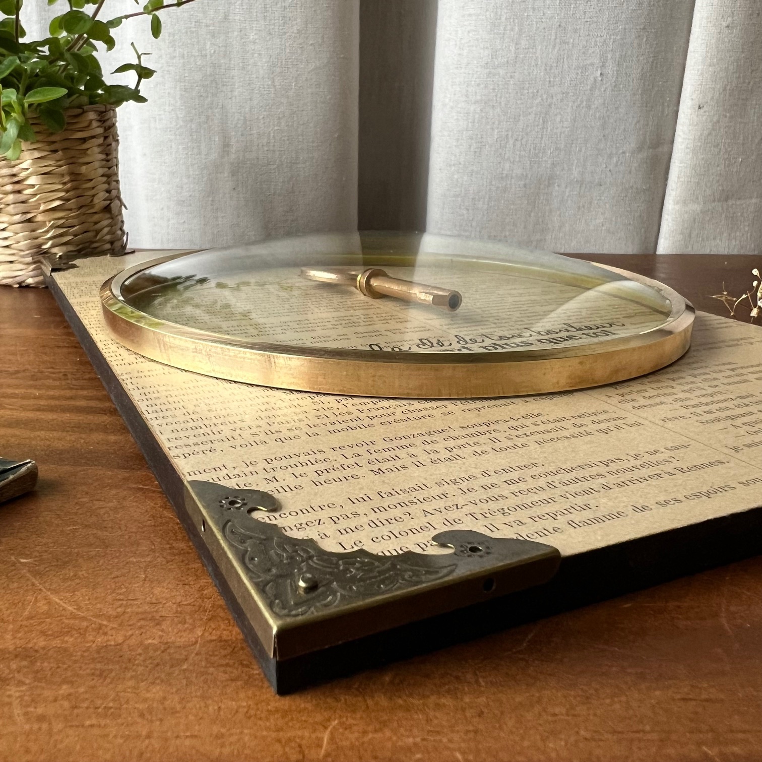 Derrière son verre bombé cerclé de laiton, le temps ne s’écoule plus, il s’est figé pour laisser place à une autre histoire. Le cadran et les aiguilles ont disparu, remplacés par une page de journal d’illustration de la fin du XIXᵉ siècle, soigneusement vieillie et vernie.