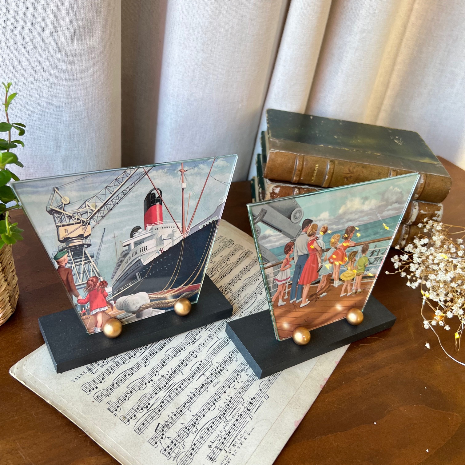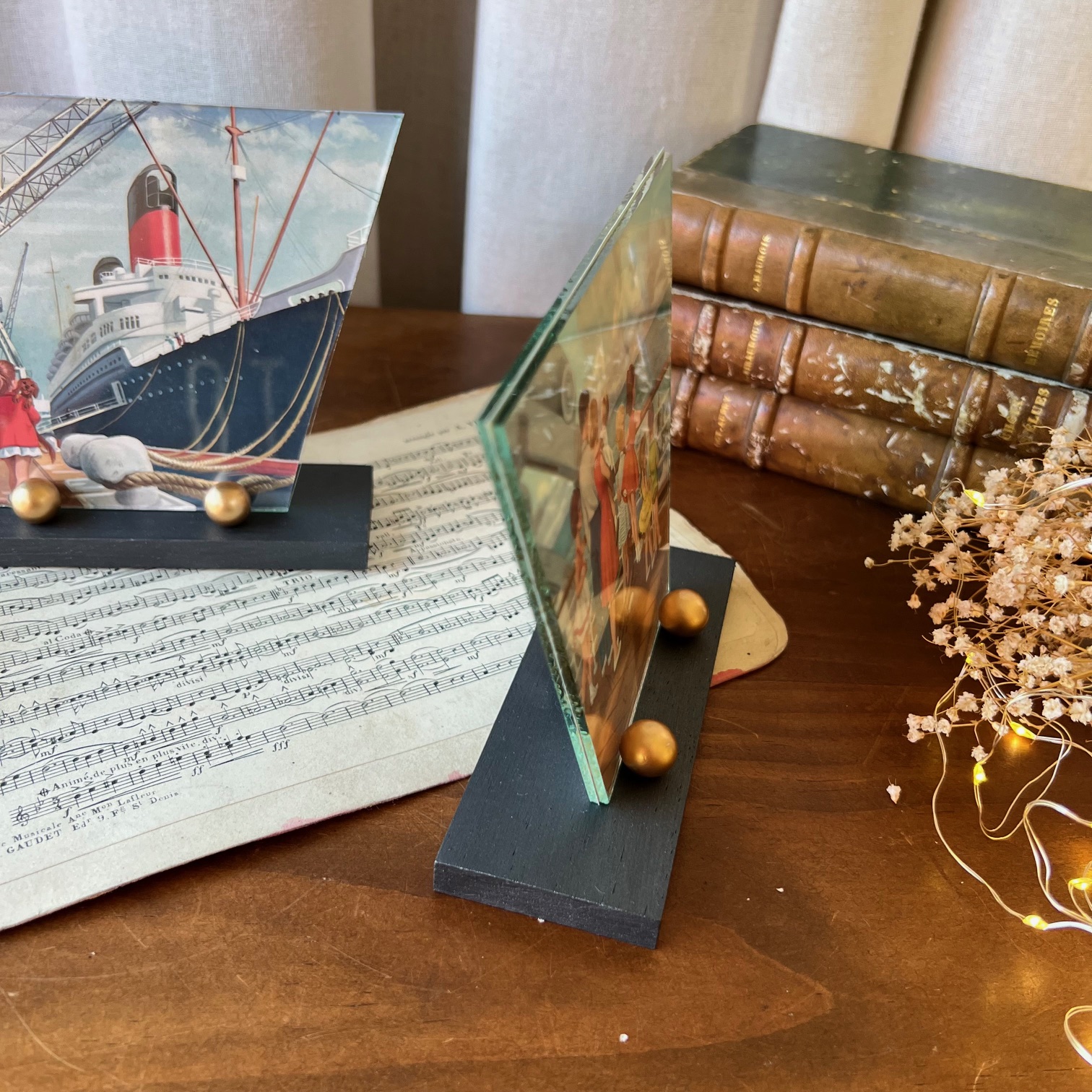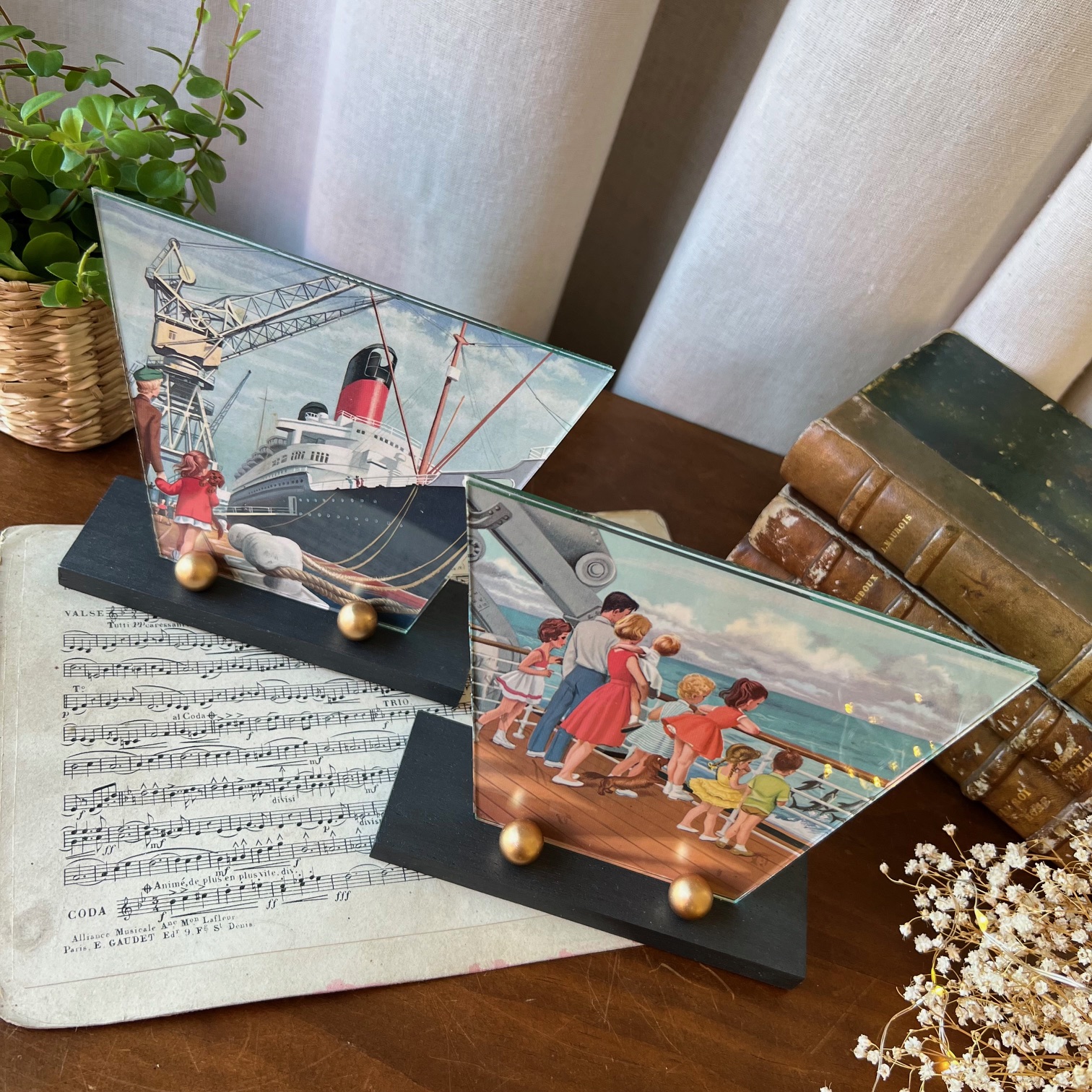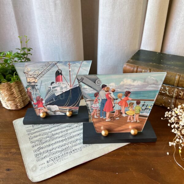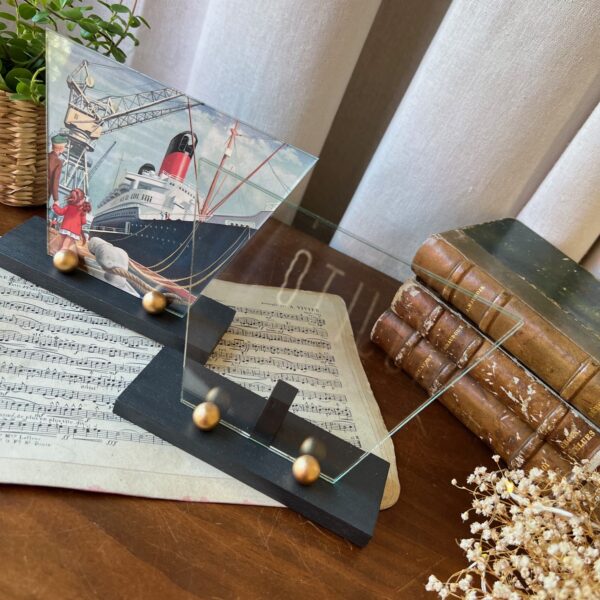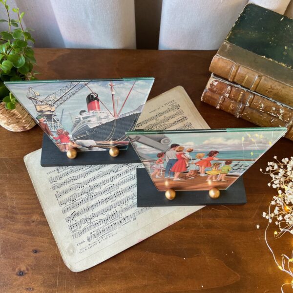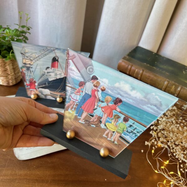 On craque pour ces petits cadres art déco ! Et on aime ce duo avec son support en bois en deux teintes – noir et or – et son double verre à la forme atypique… En attendant d’y exposer vos plus belles photos, j’ai glissé des jolies illustrations issues des aventures de la pétillante Martine.
