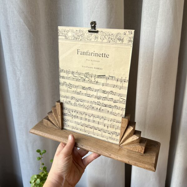 Un grand cadre Art Déco composé d’un socle en bois brut, aux deux éventails sculptés de part et d’autre. Au centre, son verre d’origine prêt à sublimer une photo, une image – j’y ai glissé une ancienne partition pour lui donner vie en attendant son futur.