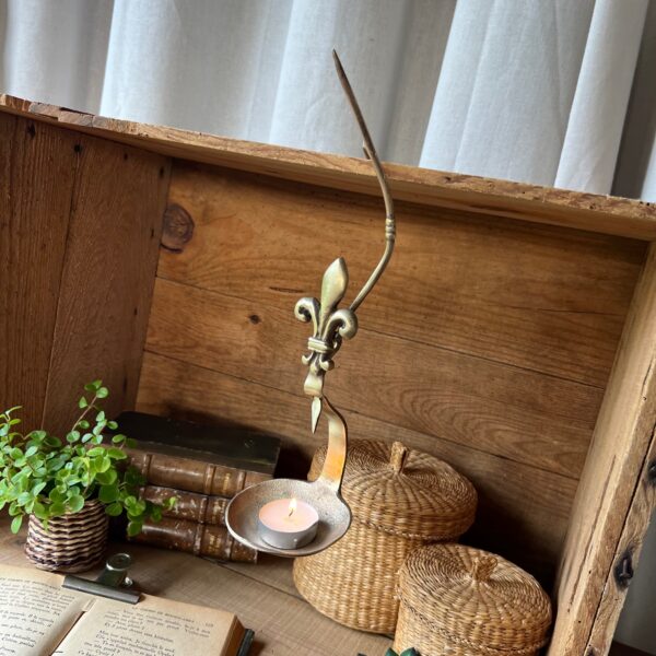 Petite lampe à huile ancienne en bronze, au charme tout doré. Sa coupole arrondie repose sur un manche en forme de crochet, et l’ensemble se coiffe d’une élégante fleur de lys.