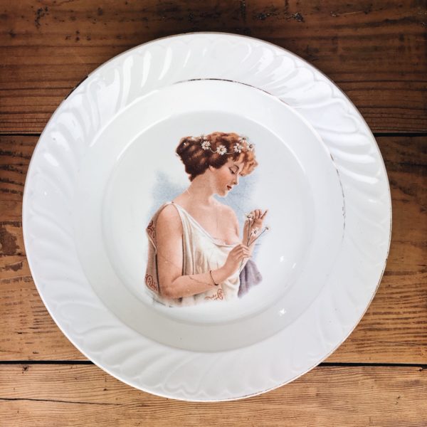 Il y a des assiettes que l’on aime à accrocher au mur comme un tableau… Et j’aime – beaucoup, à la folie, passionnément – cette belle assiette ancienne pour la finesse de sa porcelaine blanche, pour ses liserés dorés atténués par le temps… et pour cette femme aux traits subtils et aux couleurs naturelles. Coup de coeur.