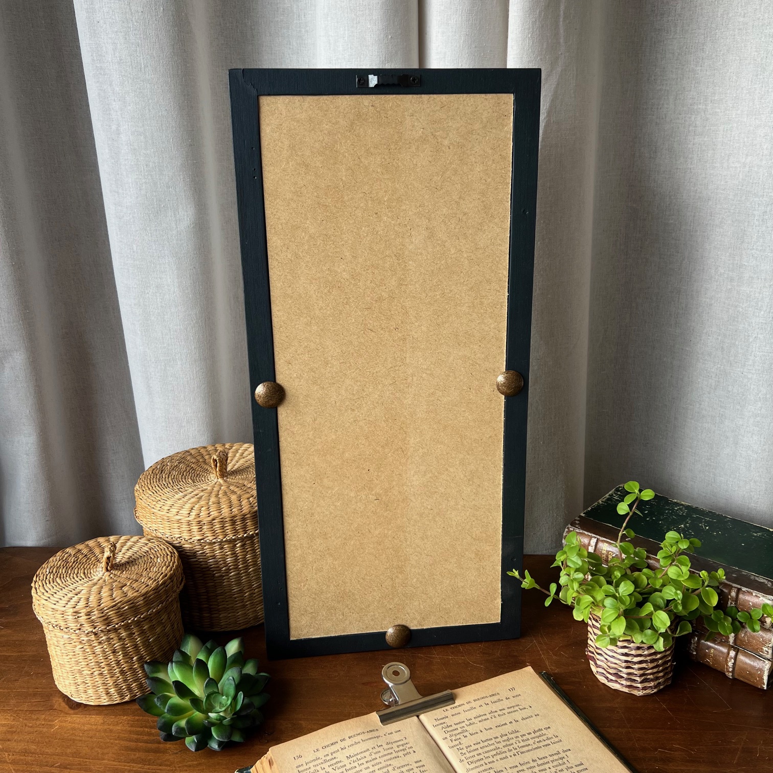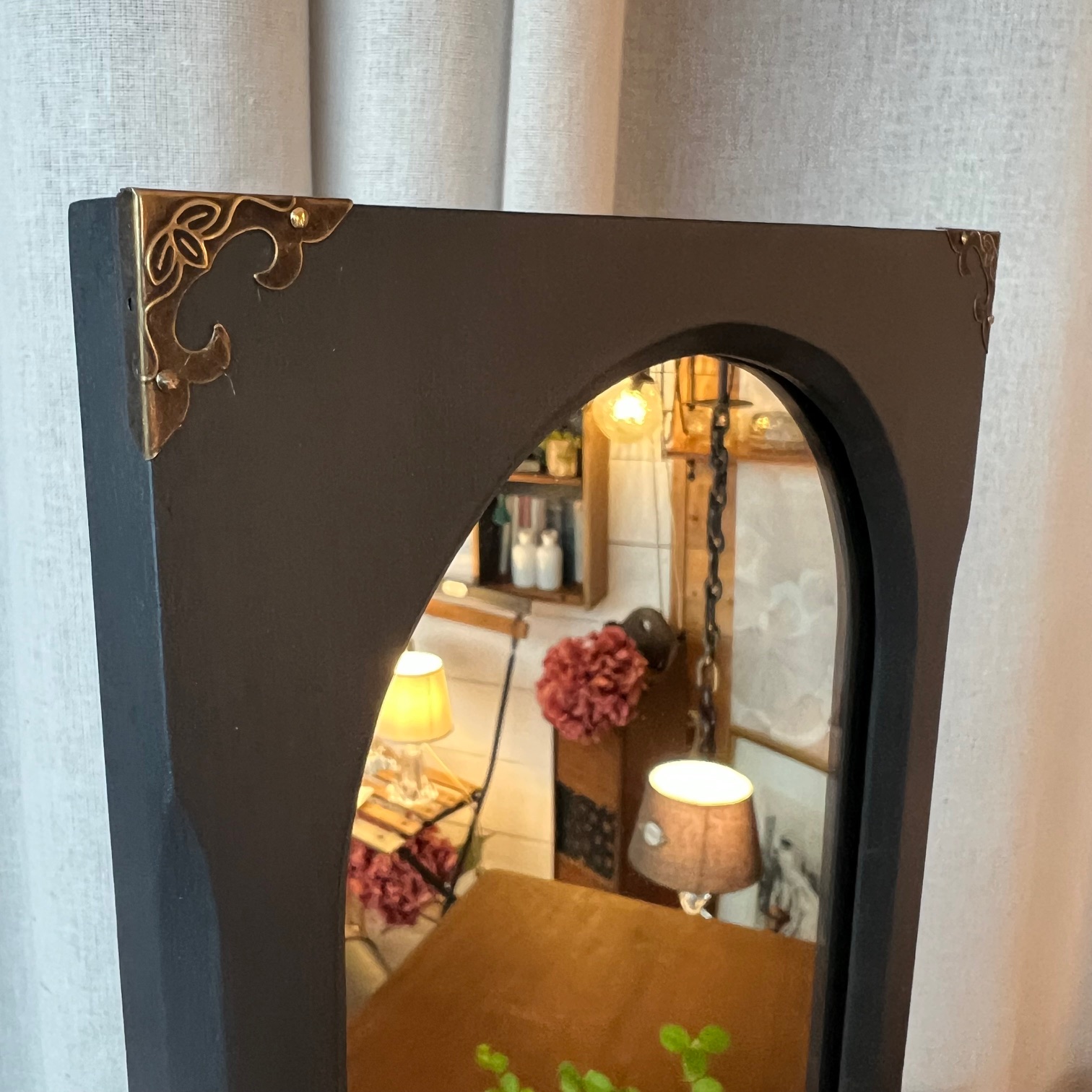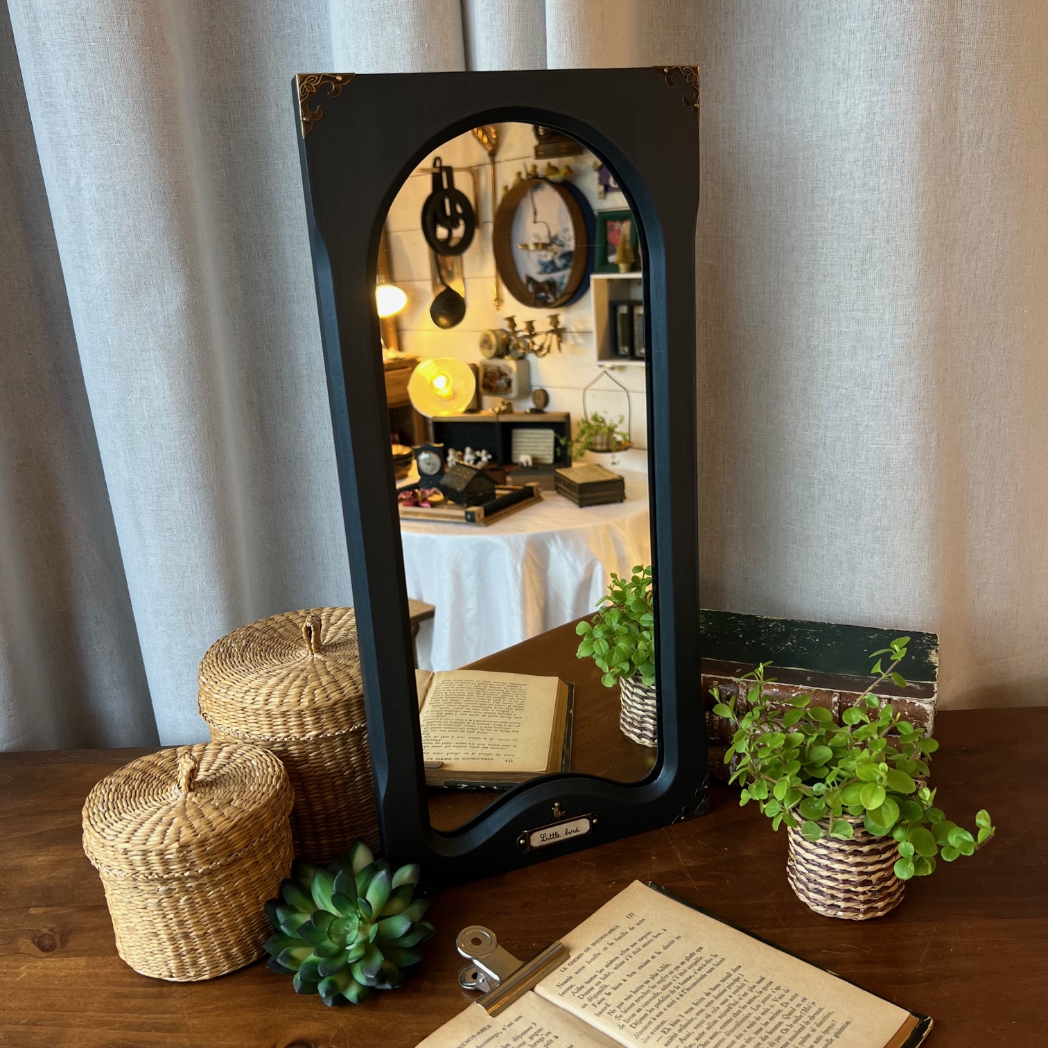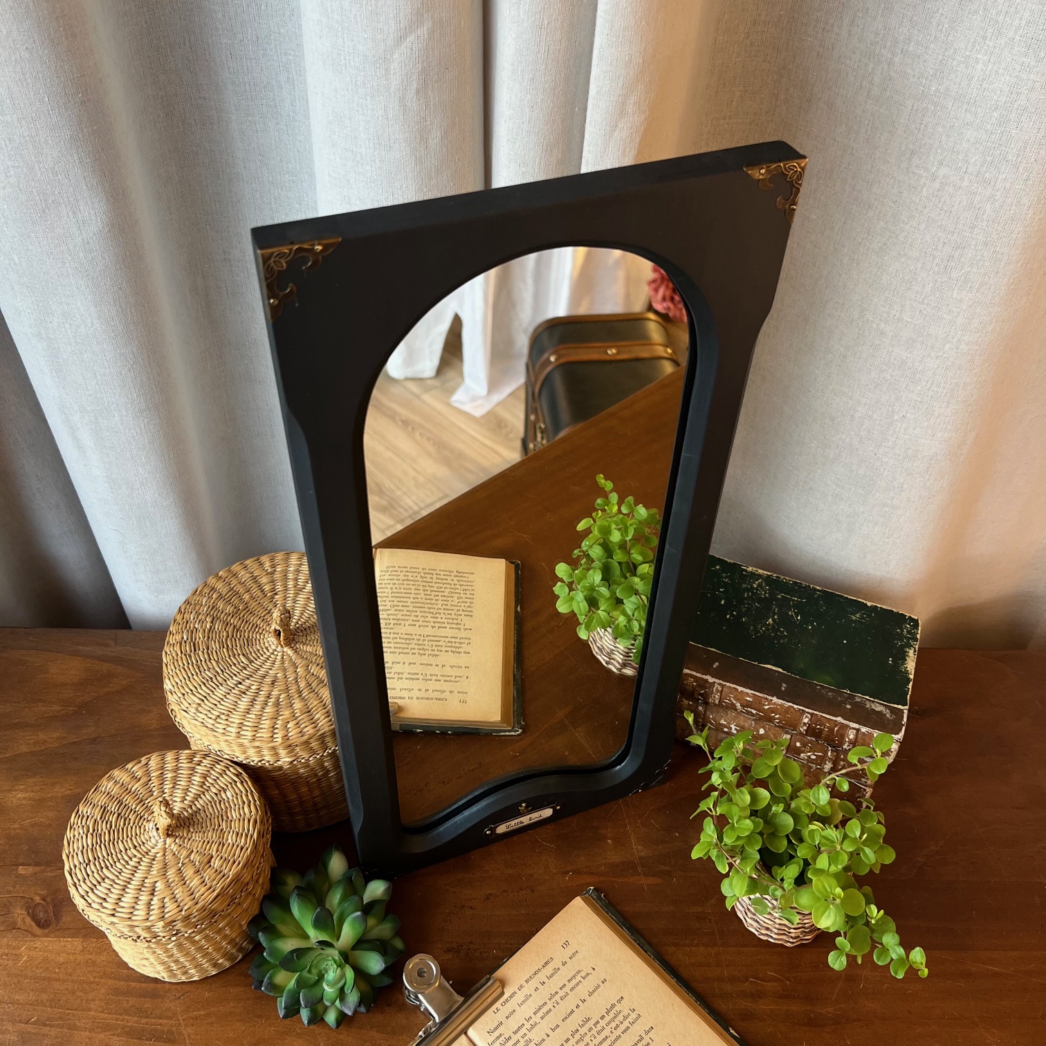 Son cadre en bois, rectangulaire, a été peint en noir. Une teinte profonde, patinée, jamais figée. À l’intérieur, le miroir se glisse dans une arche qui donne immédiatement de l’élégance à l’ensemble.
