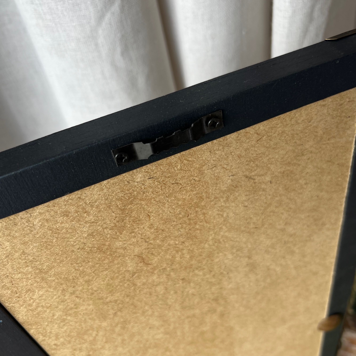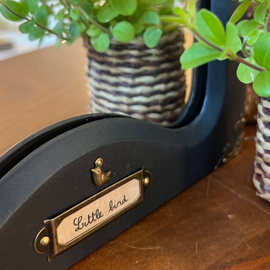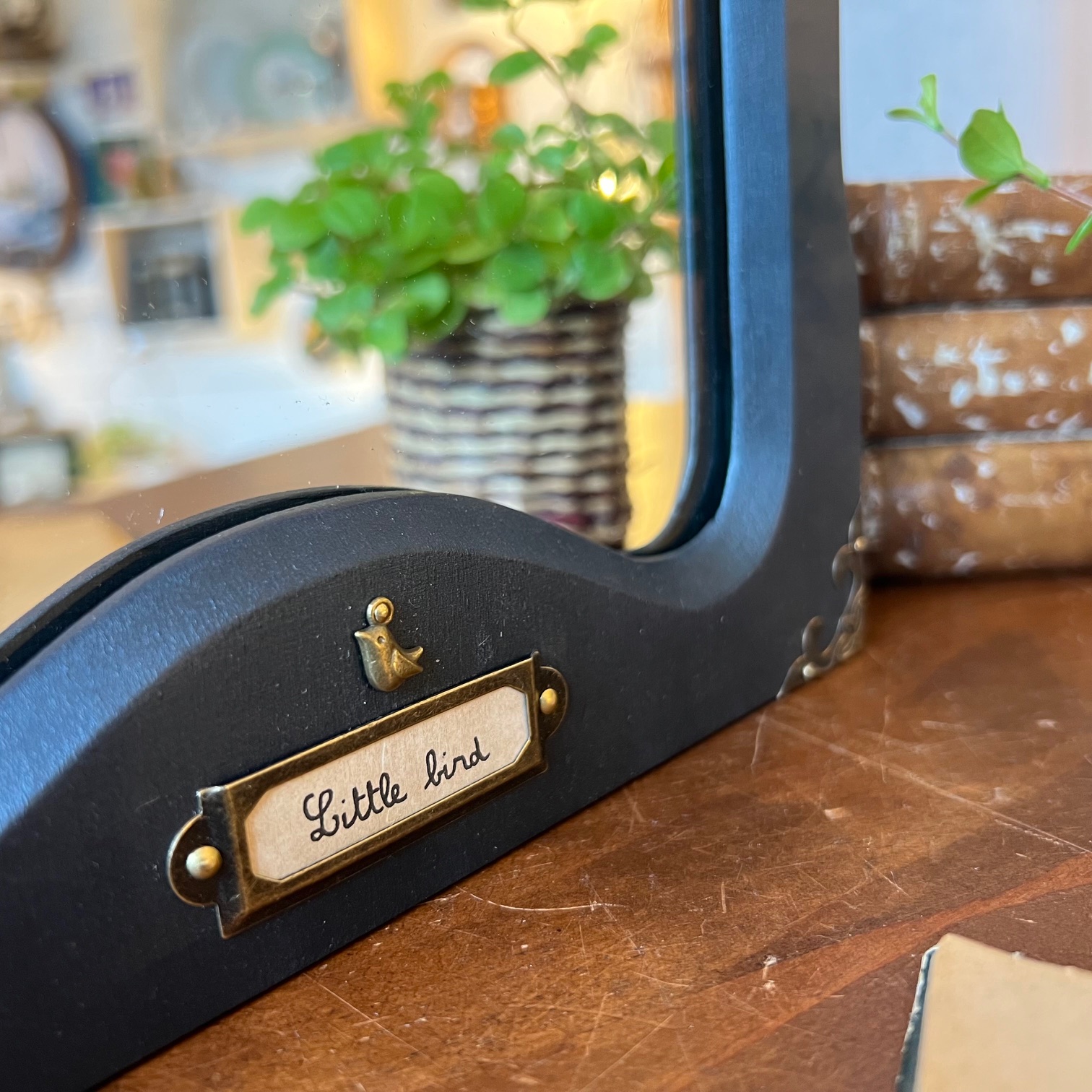 Aux quatre coins, des angles en métal doré viennent réveiller le noir, comme de petites ponctuations lumineuses. En bas, un porte-étiquette ancien accueille les mots « Little Bird ». Et juste au-dessus, perché avec légèreté, un petit oiseau en laiton, en relief, veille sur l’ensemble. Un détail simple, mais qui change tout.