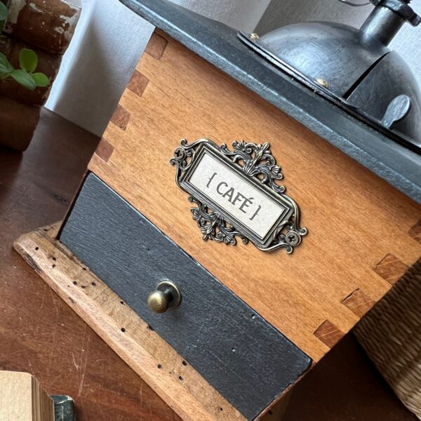 On craque pour les petits détails : la poignée en bois tourné, le bouton doré, le dôme en métal patiné… et surtout ce joli porte-étiquette personnalisable qui peut accueillir le mot de votre choix. Une belle idée de cadeau (pour soi ou pour un amateur de café).