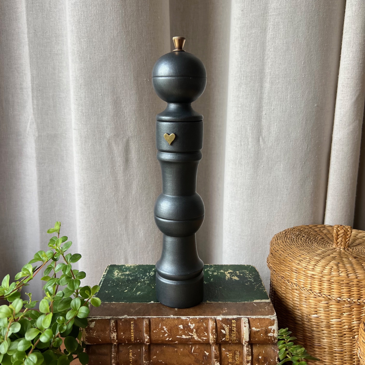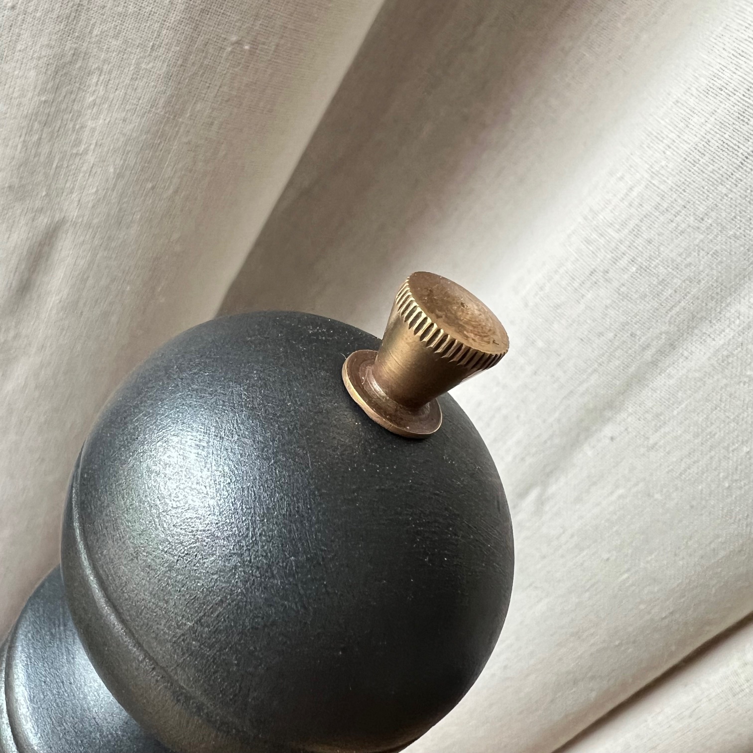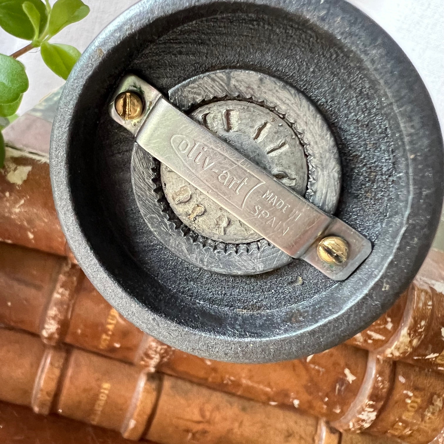Ce moulin à poivre en bois d’olivier, estampillé Oliv-Art et fabriqué en Espagne, a été restauré. Le bois, marqué par le temps, a été soigneusement patiné en noir pour révéler son élégance.
