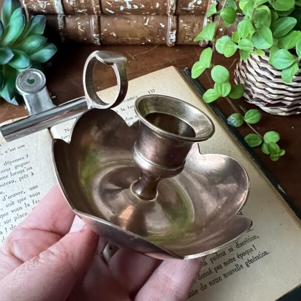 Un petit bougeoir en laiton doré, tout en sobriété, avec son anneau pour glisser le doigt et se déplacer comme autrefois, lumière en main.