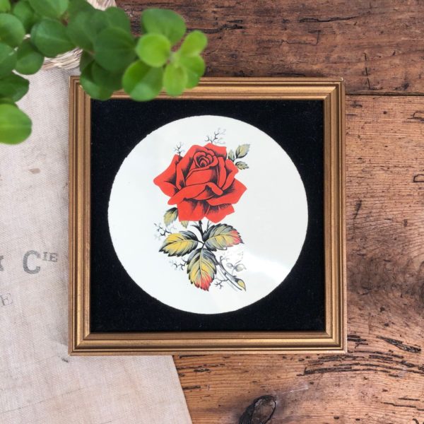 Chouette petit cadre doré avec en son cœur une rose rouge peinte sur de la porcelaine, le tout cerclé de feutrine noire. Belles finitions ! On les aime ces petits cadres en solo ou en accumulation.