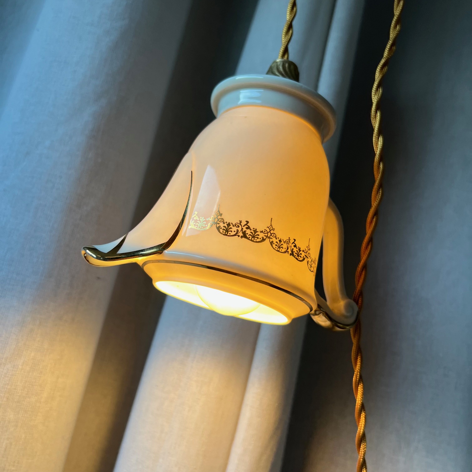 Côté technique : électrification à neuf, douille E14, serre-câble caché sous un cabochon en bronze, cordon textile doré de 2.5 m, ampoule offerte.