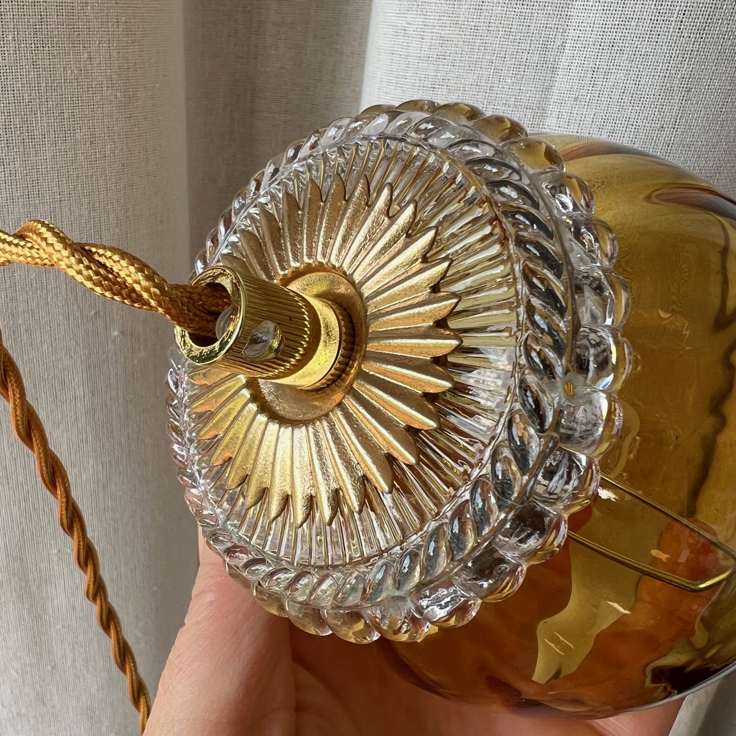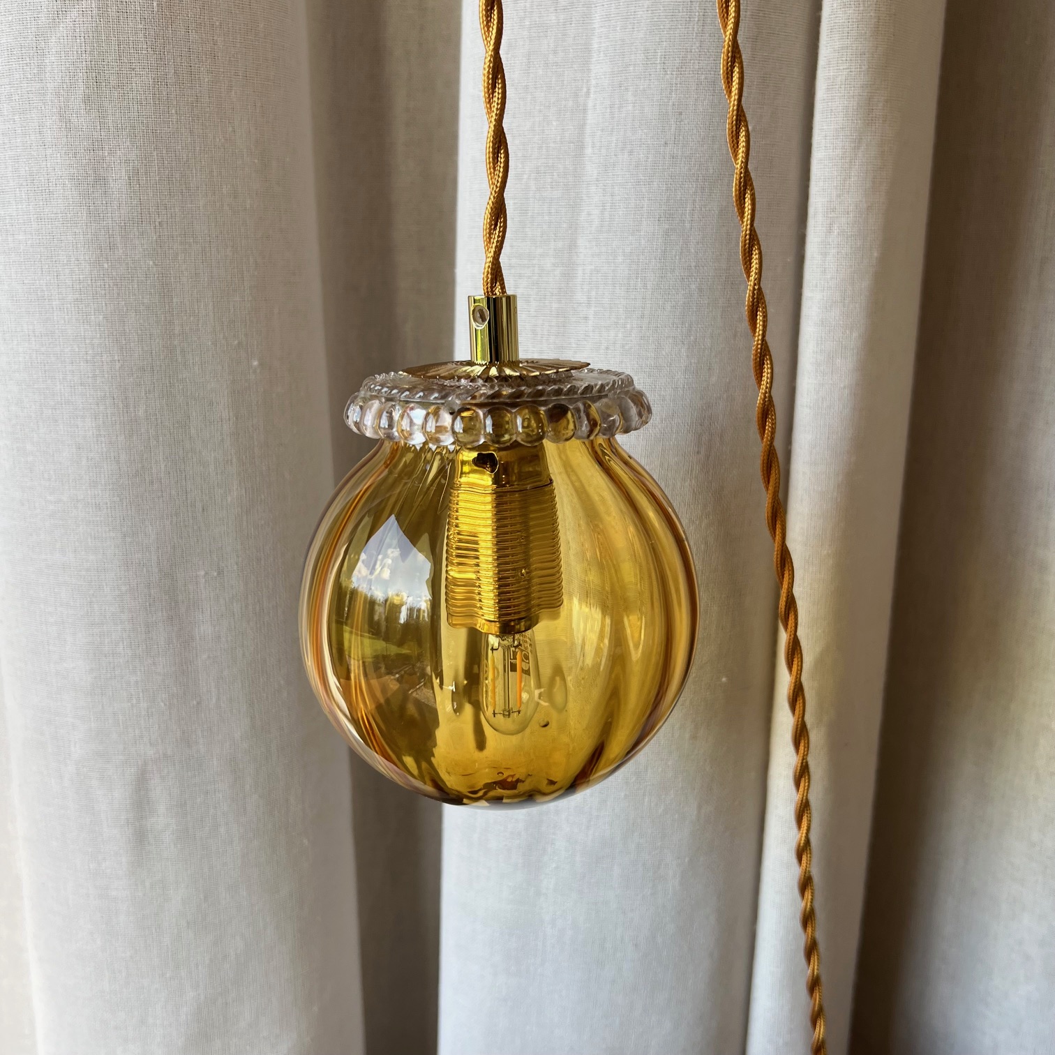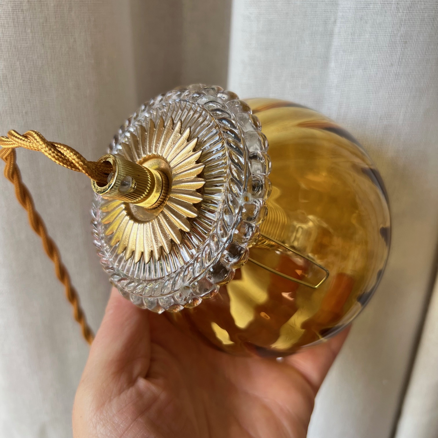 Cette petite baladeuse a tout d’une grande ! On craque pour sa forme ronde ciselé, son verre jaune, sa coupole en verre… et sa lumière douce ♥ Électricité refaite à neuf.
