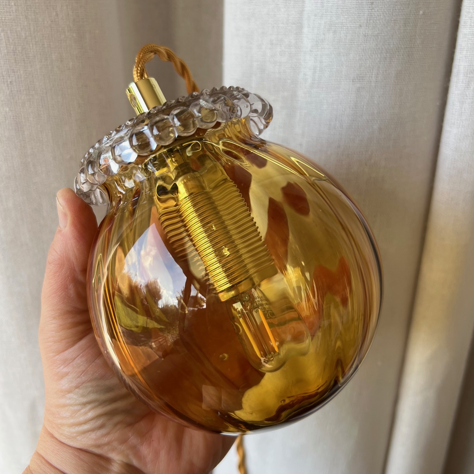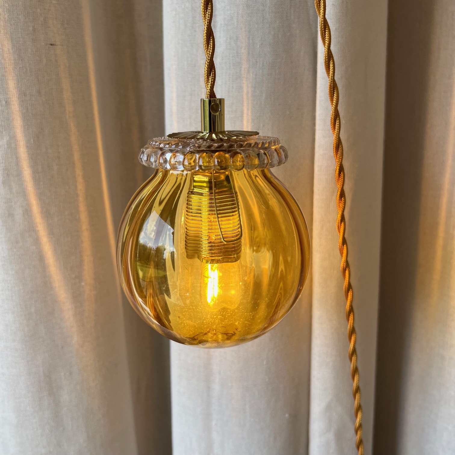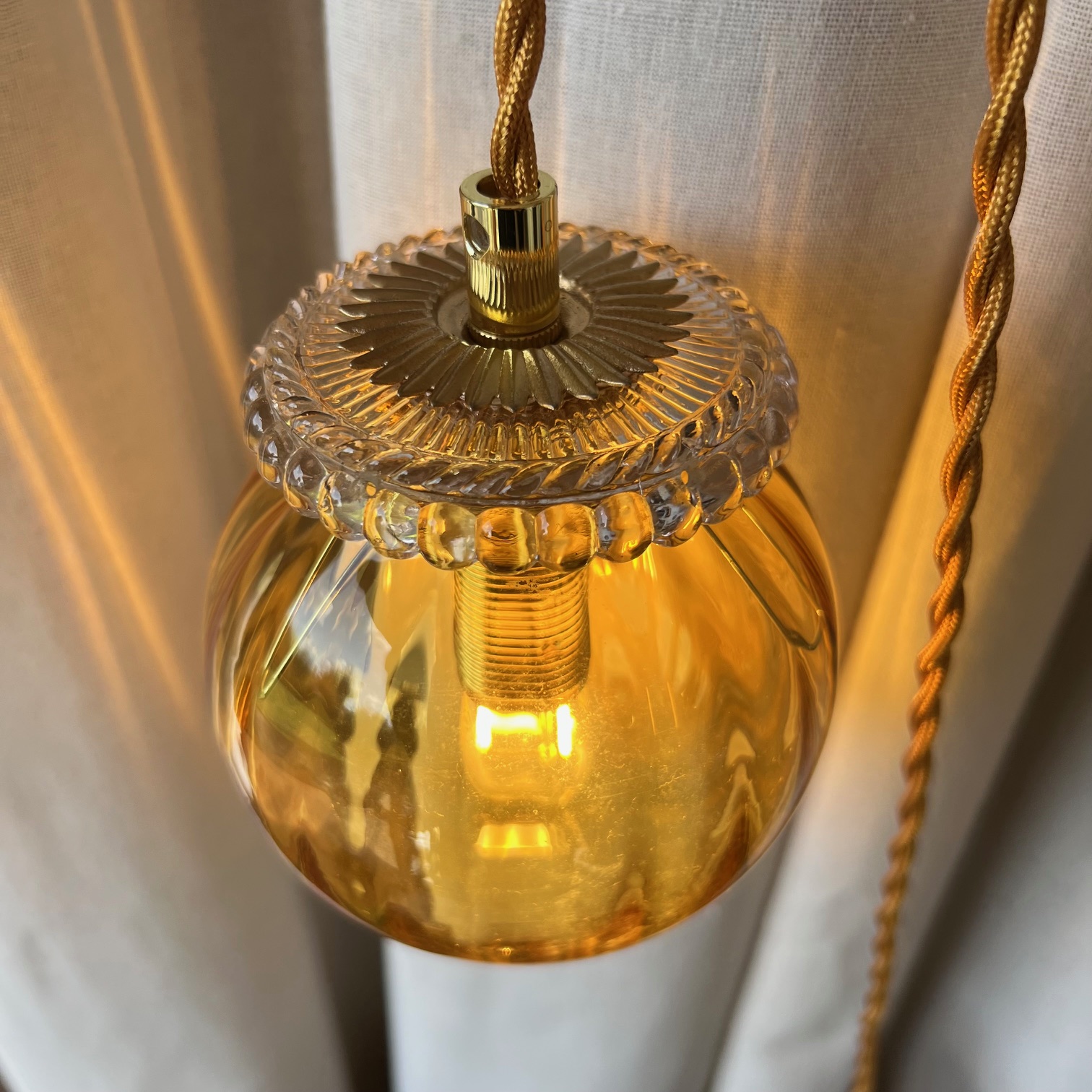 Cette petite baladeuse a tout d’une grande ! On craque pour sa forme ronde ciselé, son verre jaune, sa coupole en verre… et sa lumière douce ♥ Électricité refaite à neuf.