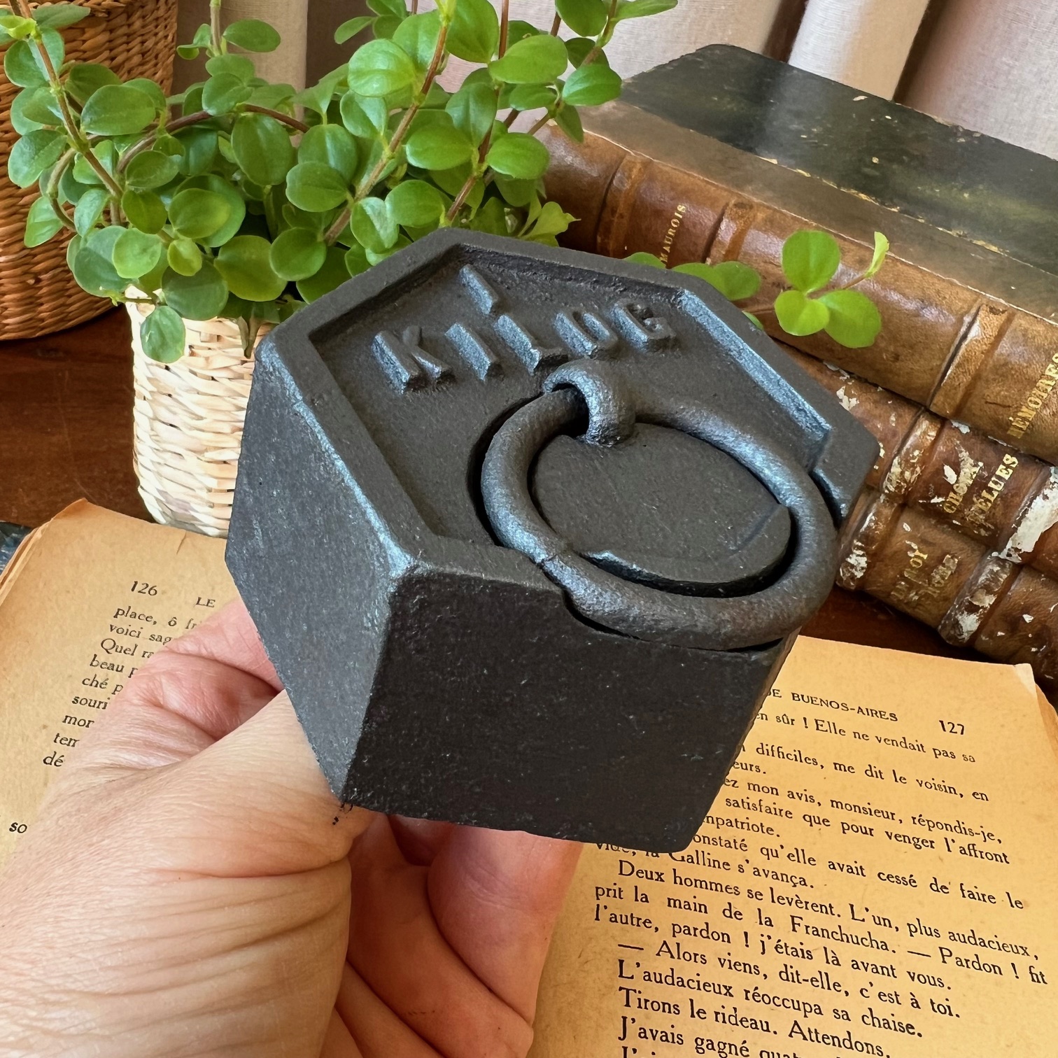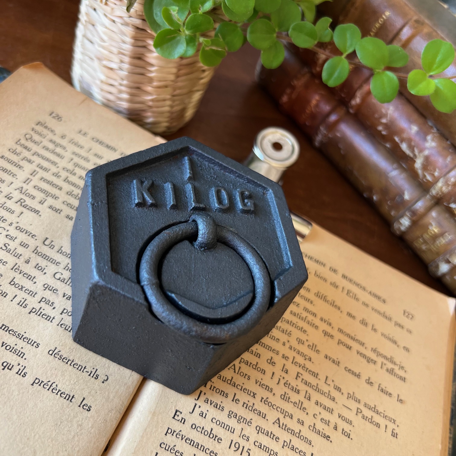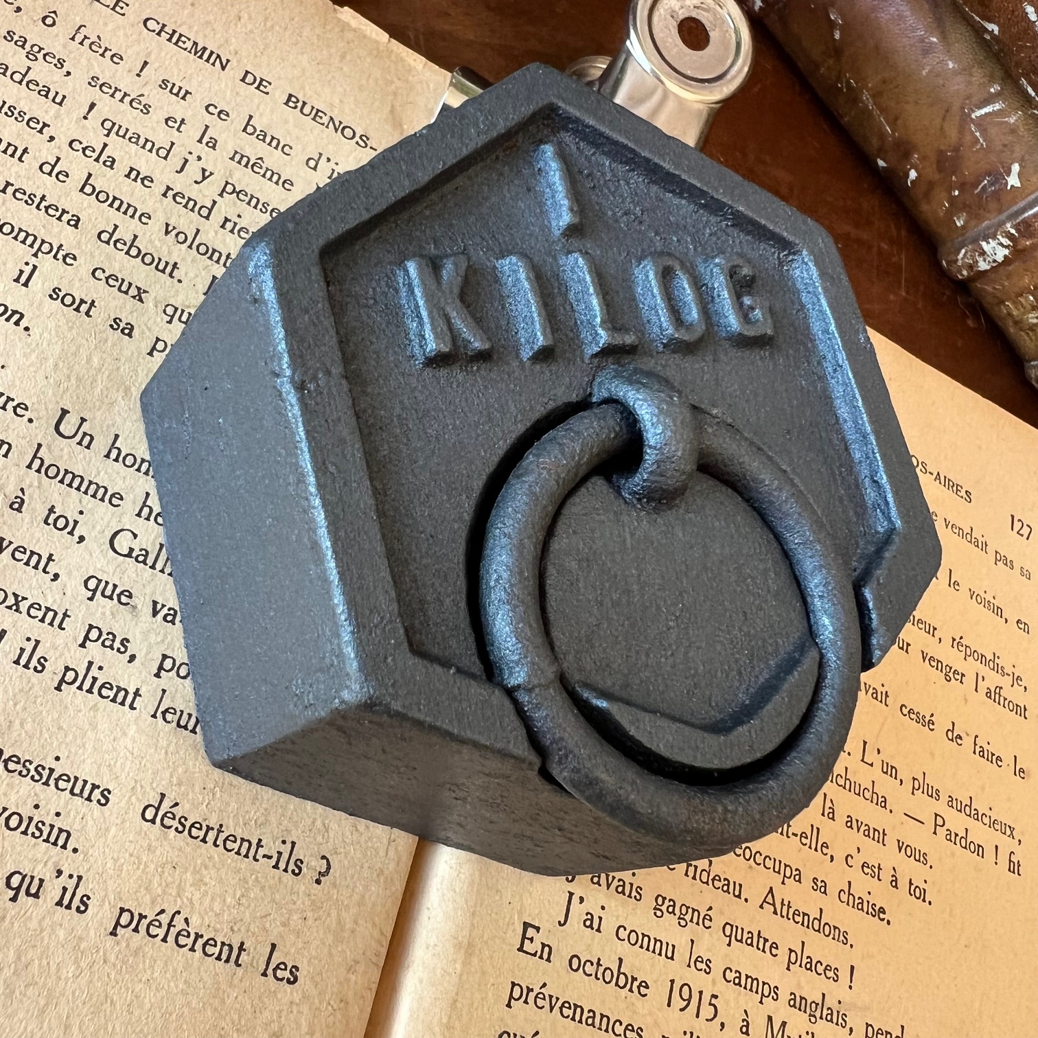 Ce poids de 1 kg en fonte, patiné en noir, affiche une belle silhouette hexagonale surmontée de son anneau. Traces du temps, irrégularités, usure noble : tout en lui raconte une époque révolue où l’on mesurait avec précision et fierté.