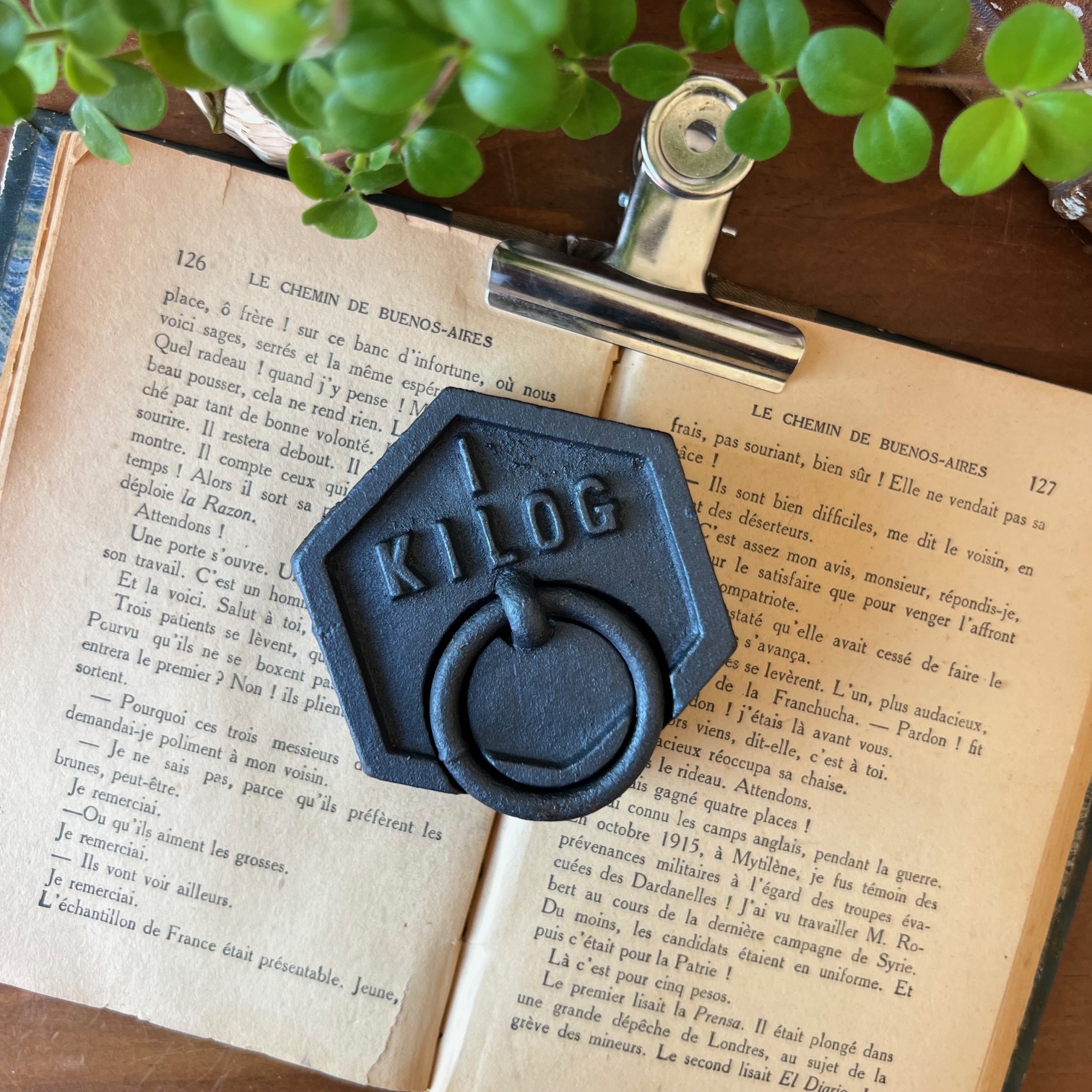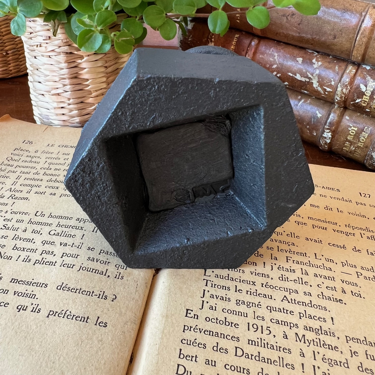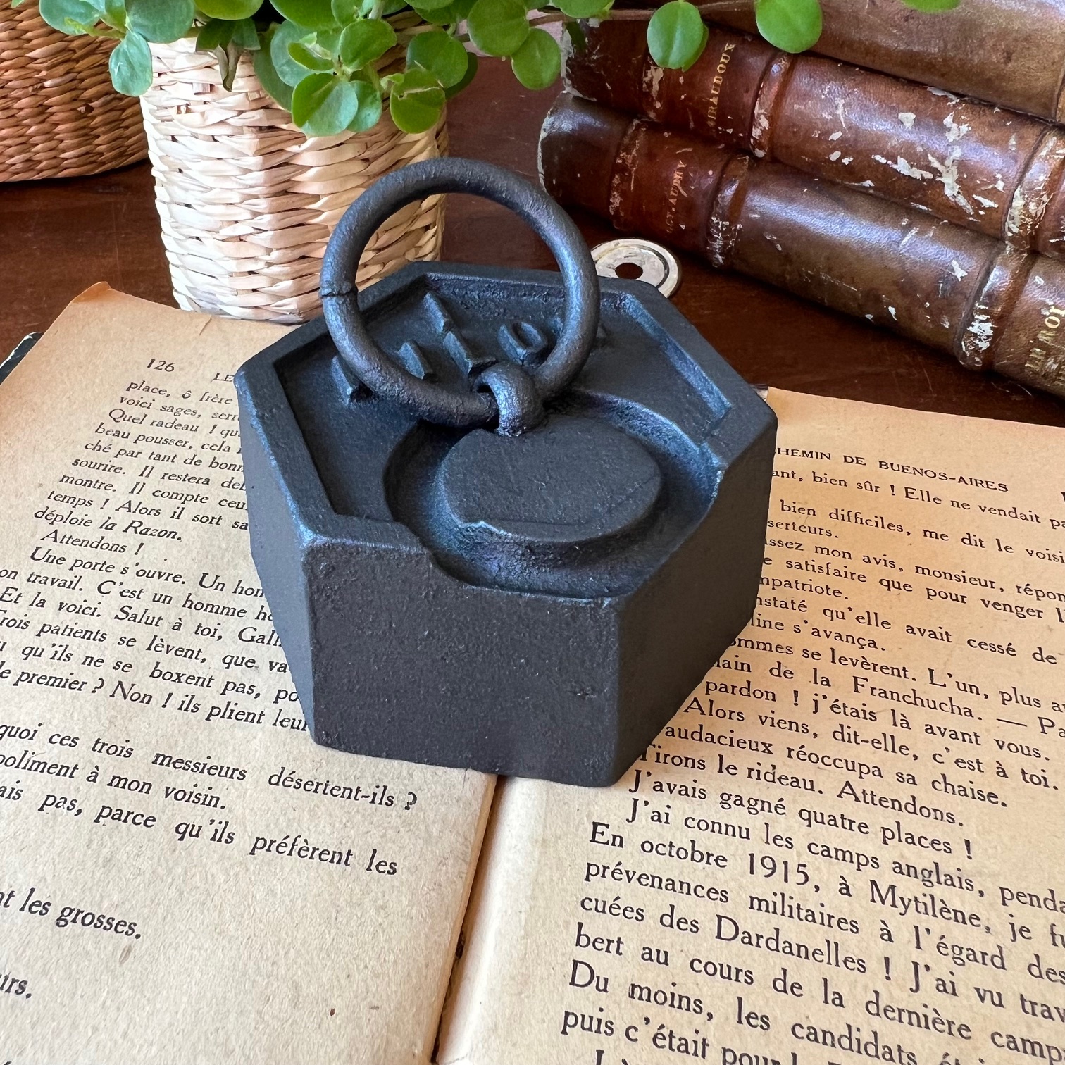 Ce poids de 1 kg en fonte, patiné en noir, affiche une belle silhouette hexagonale surmontée de son anneau. Traces du temps, irrégularités, usure noble : tout en lui raconte une époque révolue où l’on mesurait avec précision et fierté.