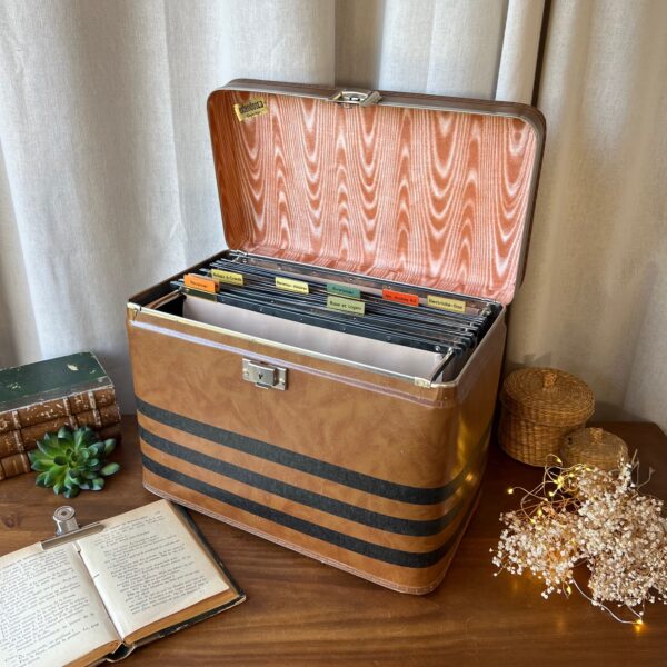 À l’intérieur, un habillage graphique très seventies (effet bois ondé) donne le ton. Neuf dossiers suspendus bien assortis sont fournis pour classer tout ce qui compte. Le système de fermeture est complet avec ses deux clés d’origine, et une poignée sur le dessus transforme l’ensemble en petite valisette facile à transporter du bureau au salon.