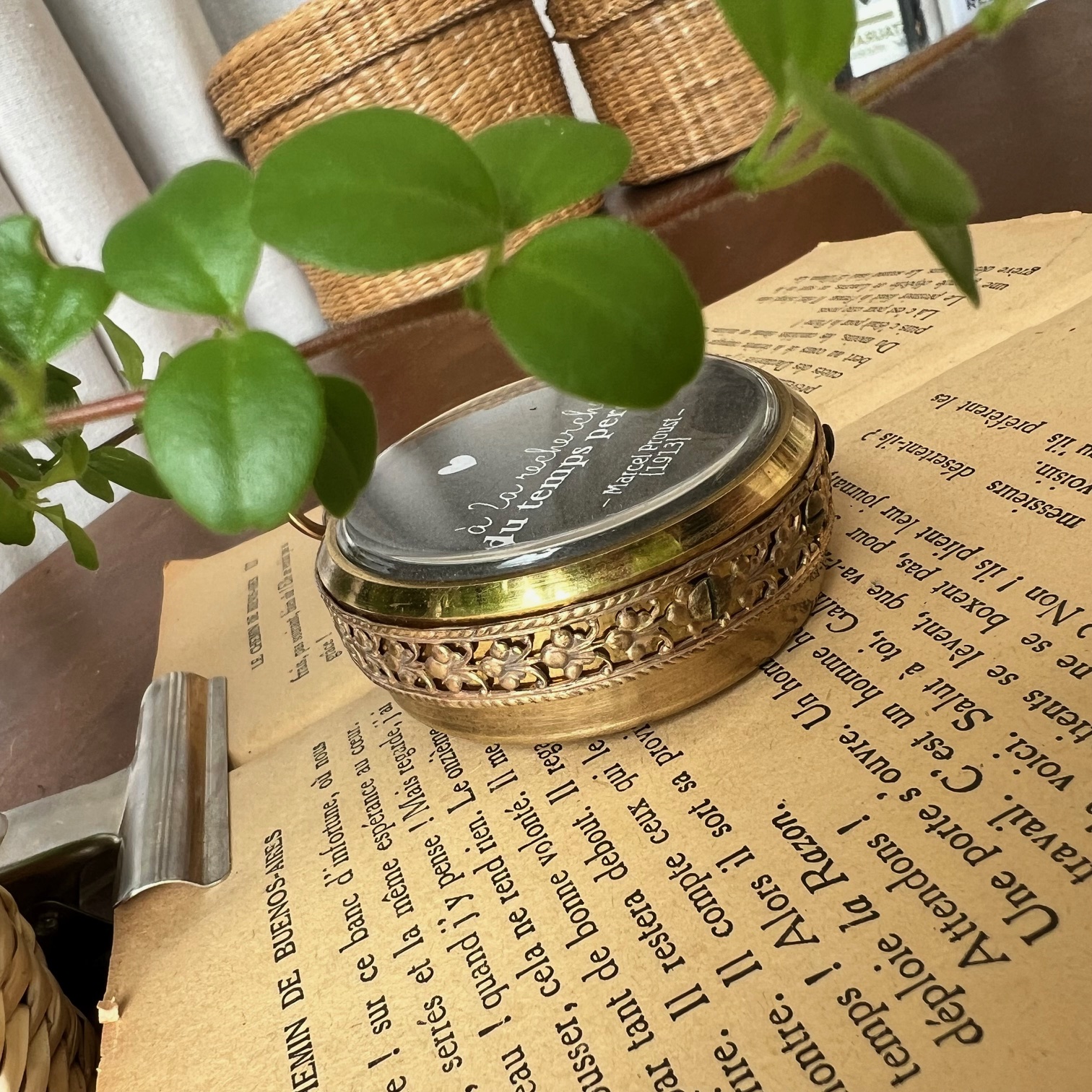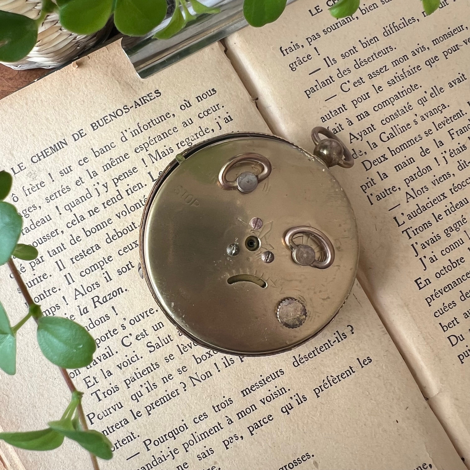 Ce petit réveil ancien en laiton doré a cessé de tictaquer… pour mieux nous faire voyager dans le temps.