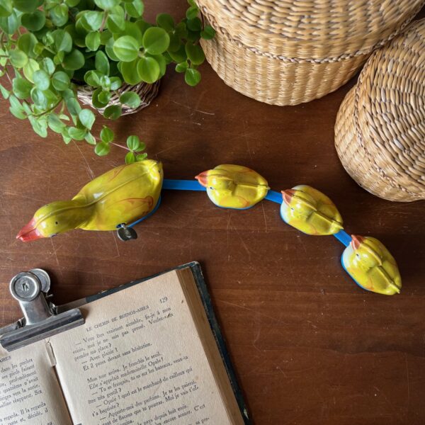 Qui craquera pour ce jouet de seconde main ? Oui, il n’est pas ancien. Oui, il ne fonctionne plus. Oui, il manque une roue au plus grand des canetons. Mais on aime la couleur jaune de la tôle et son grand potentiel déco ♥