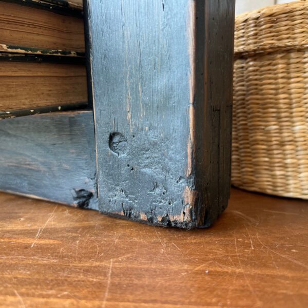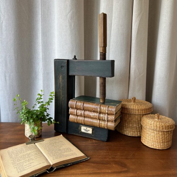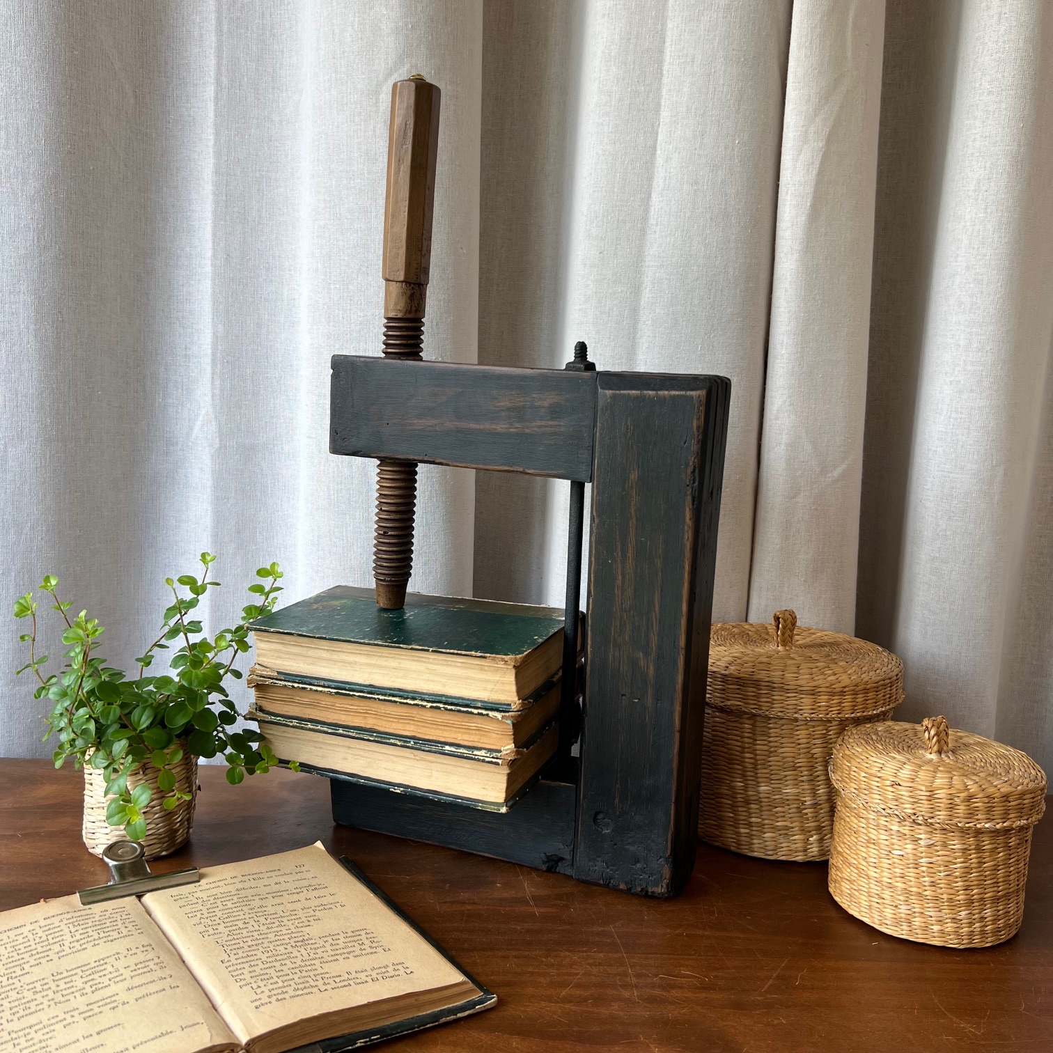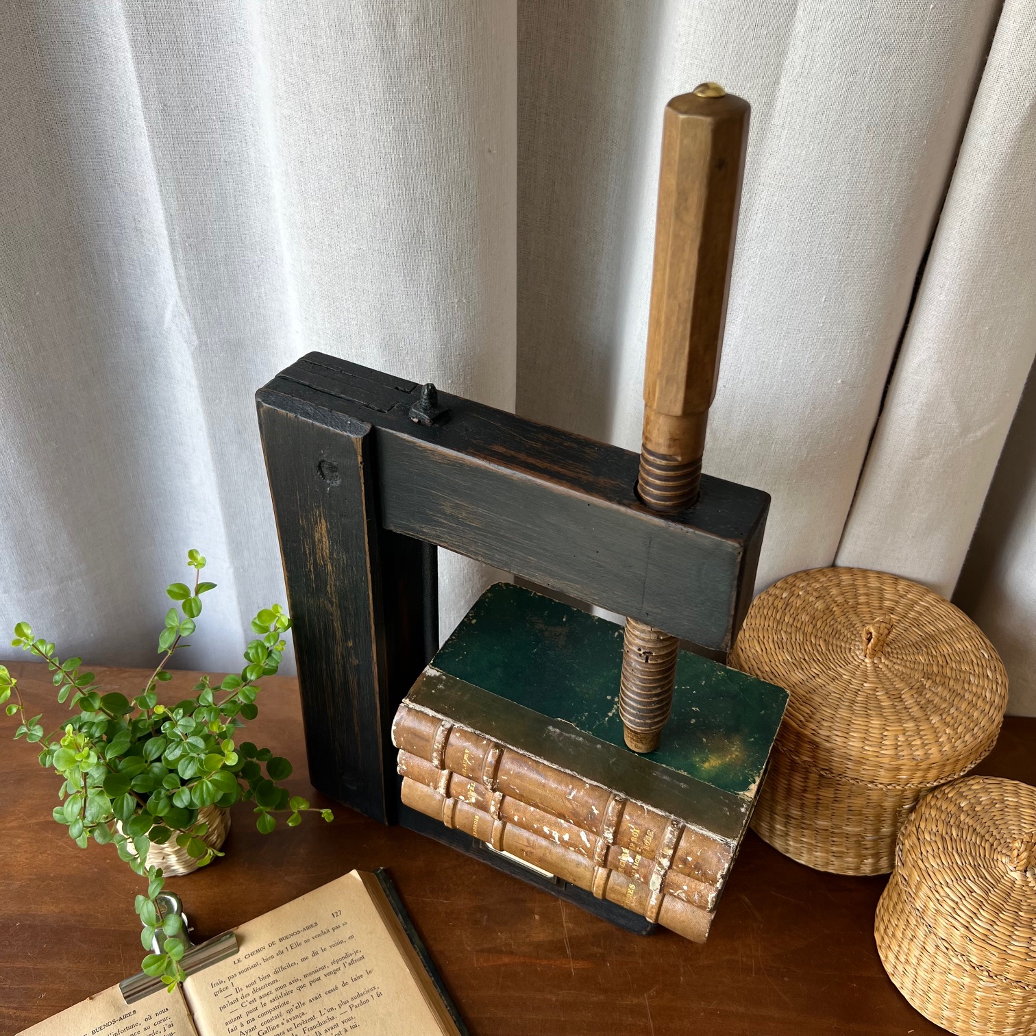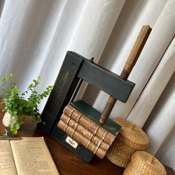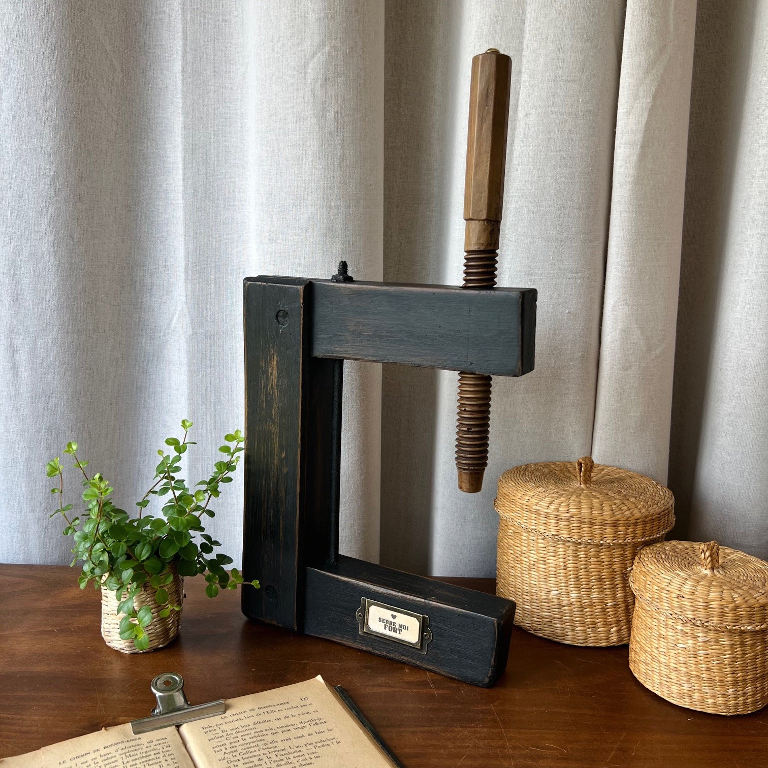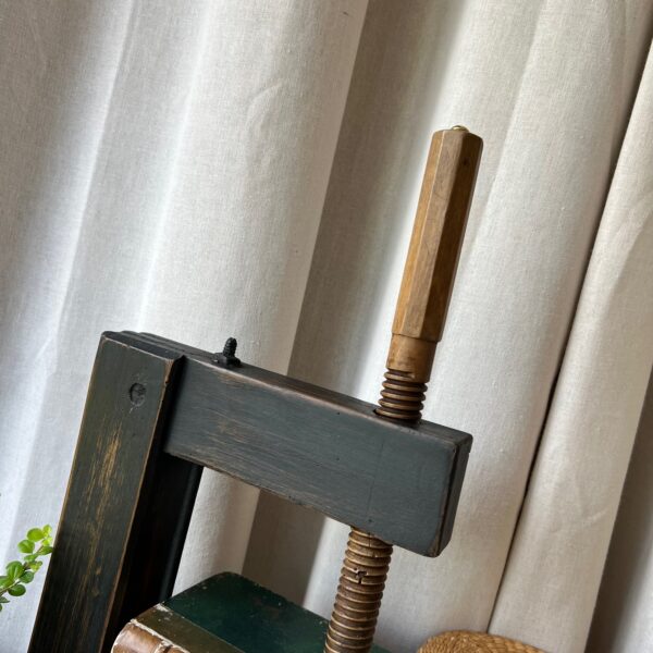 Ancien serre-joint en bois restauré avec amour et une pointe d’audace : la structure a été repeinte en noir mat tandis que sa grande vis en bois a conservé sa patine d’origine — parce que certaines choses sont plus belles brutes.