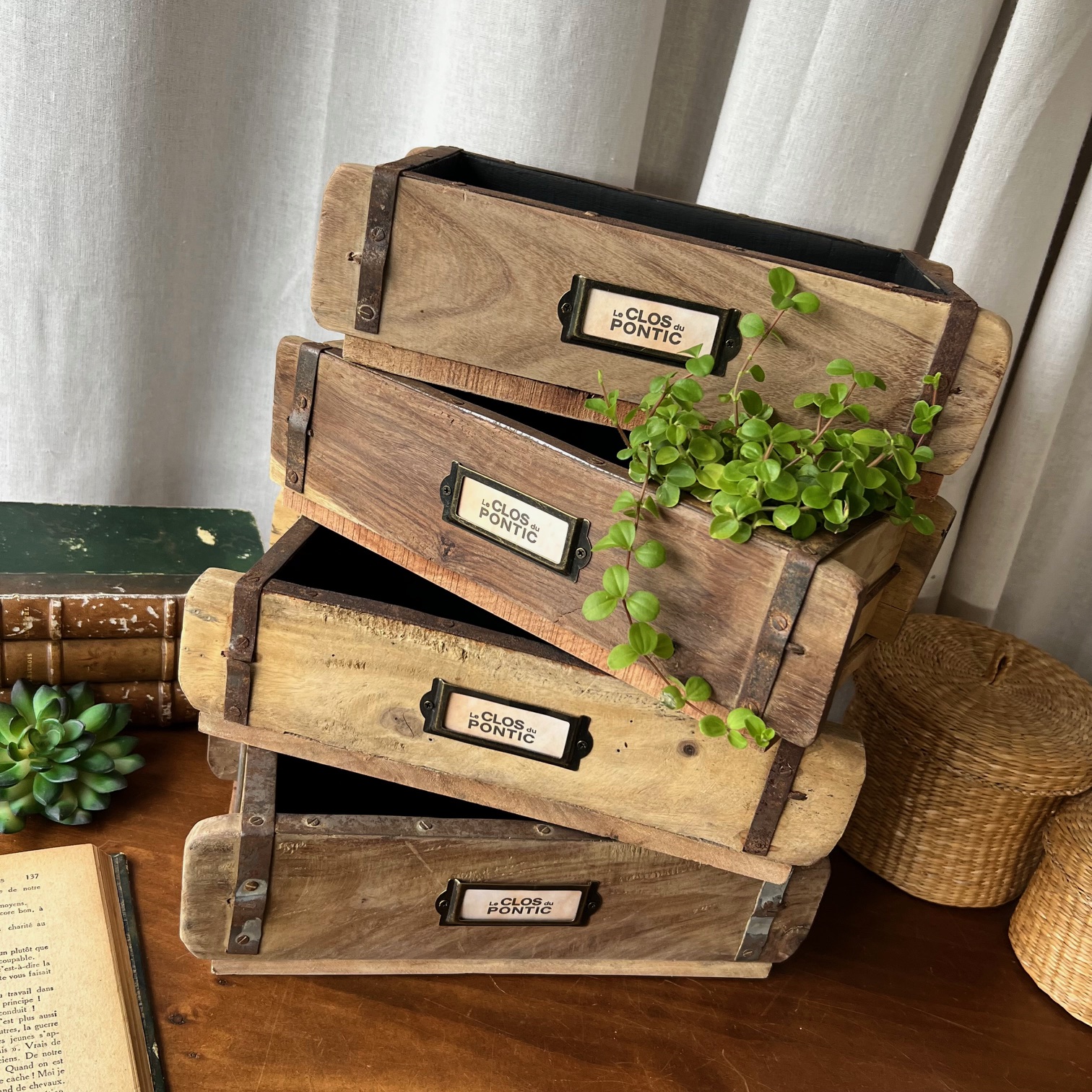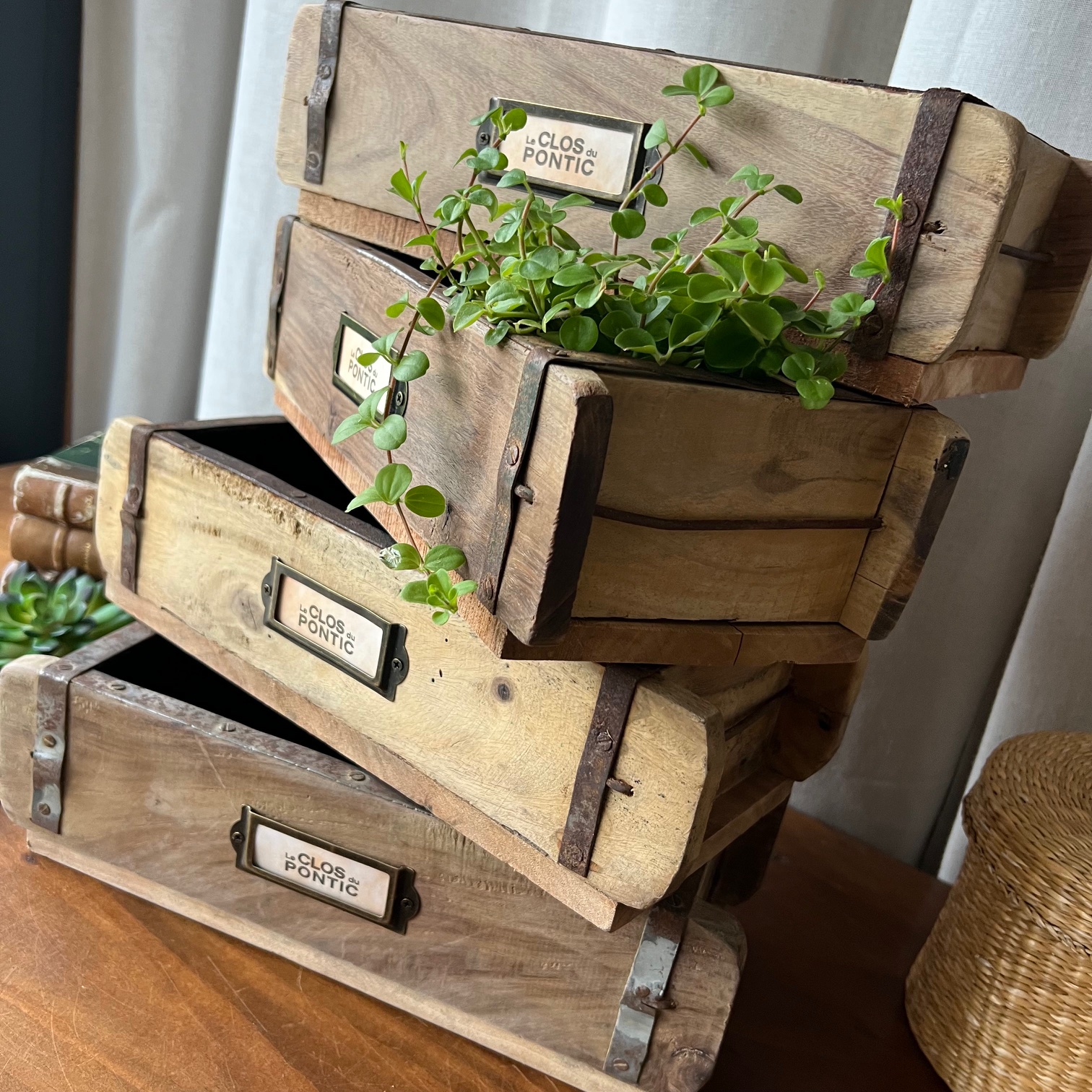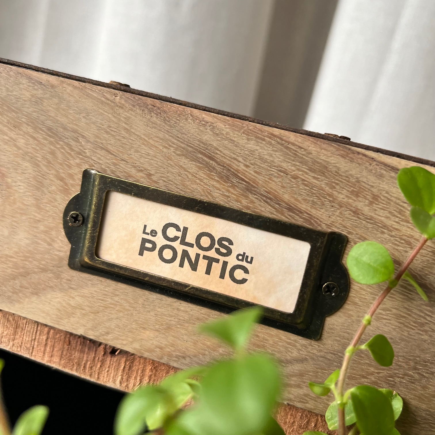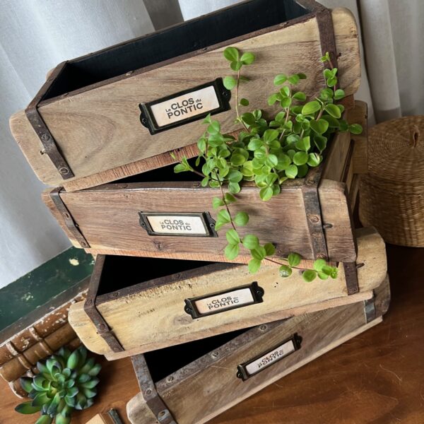 Cerclé de métal riveté, il allie solidité et esthétique industrielle. Sur le devant, un détail qui fait mouche : un porte-étiquette en métal affichant les mots « Le Clos du Pontic »… clin d’œil espiègle à sa nouvelle vie, entre rangement insolite et déco décalée.