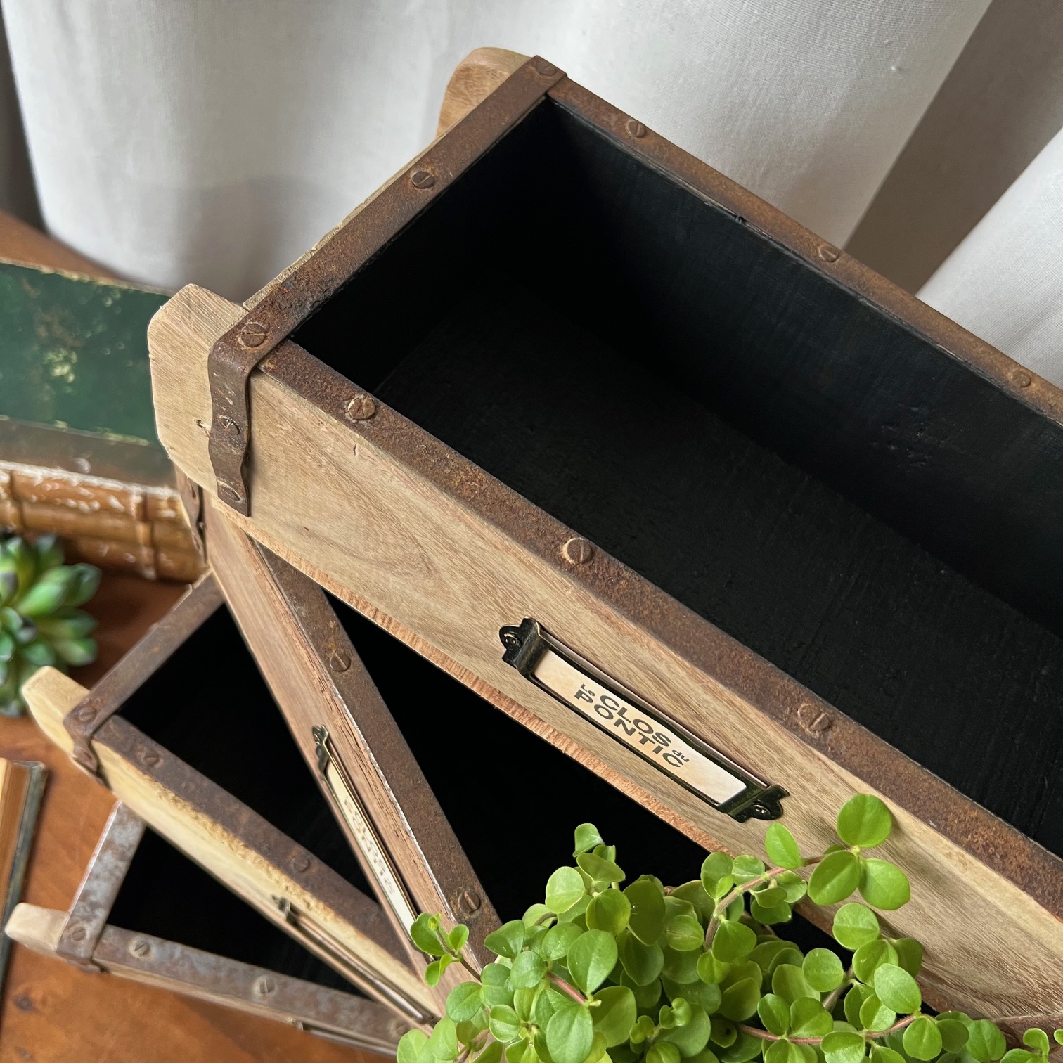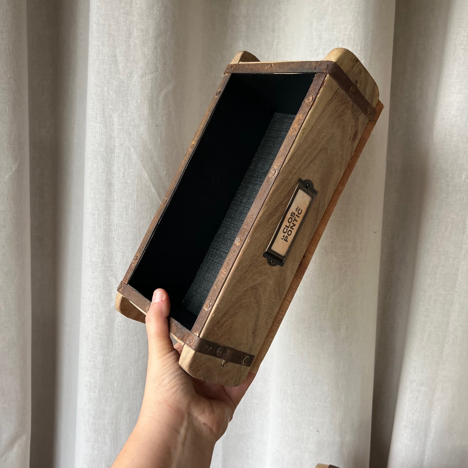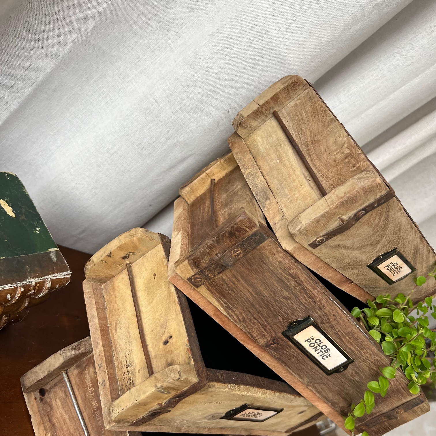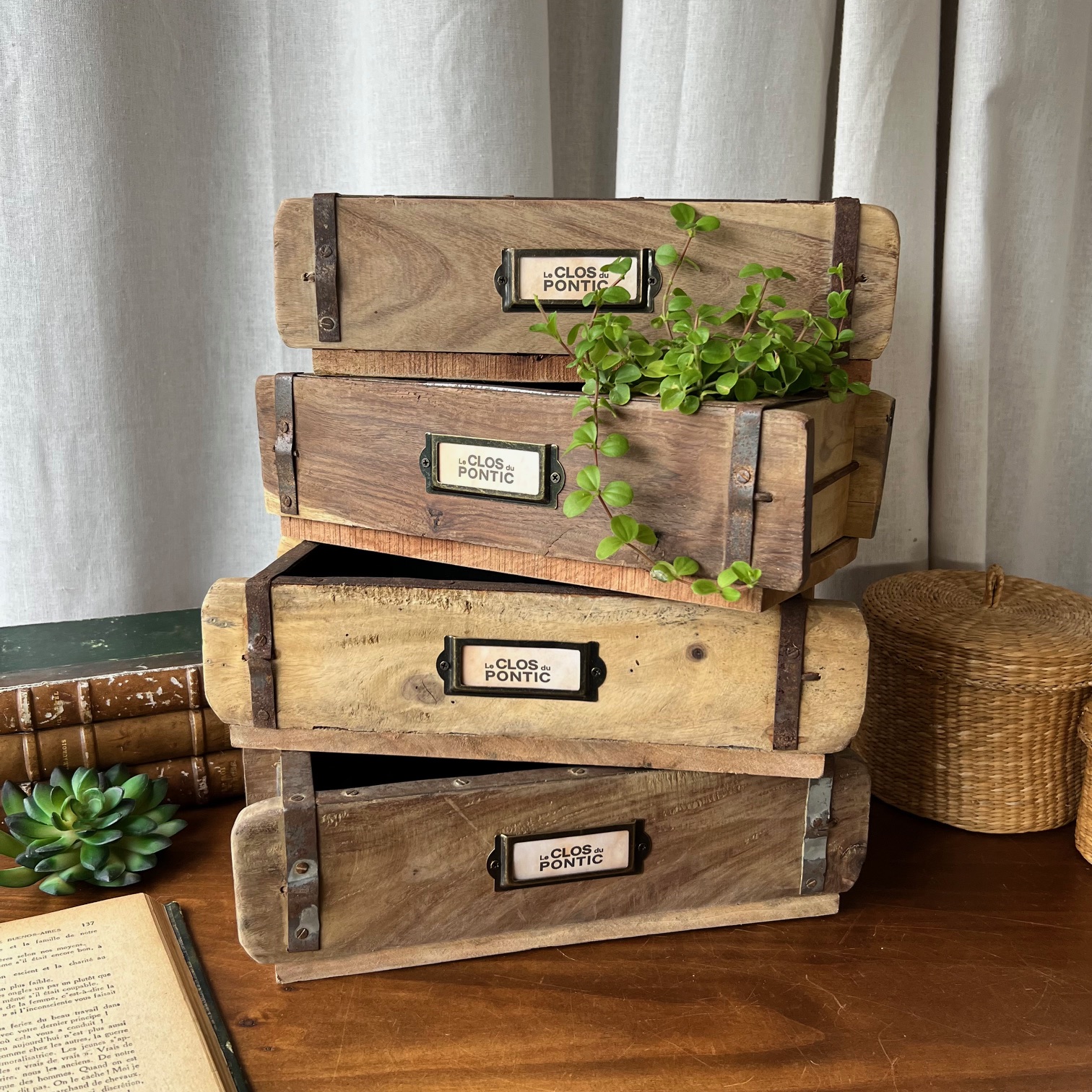 Cerclé de métal riveté, il allie solidité et esthétique industrielle. Sur le devant, un détail qui fait mouche : un porte-étiquette en métal affichant les mots « Le Clos du Pontic »… clin d’œil espiègle à sa nouvelle vie, entre rangement insolite et déco décalée.