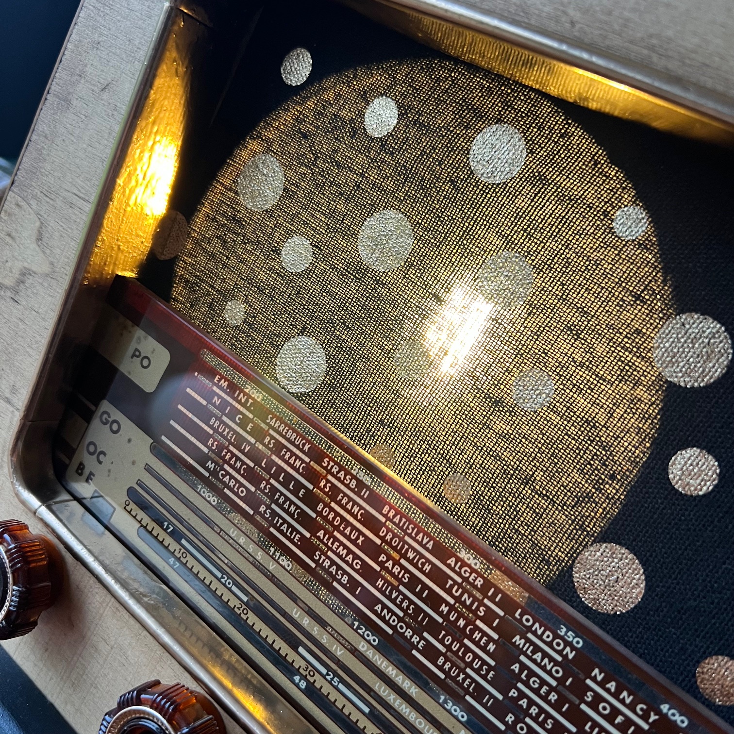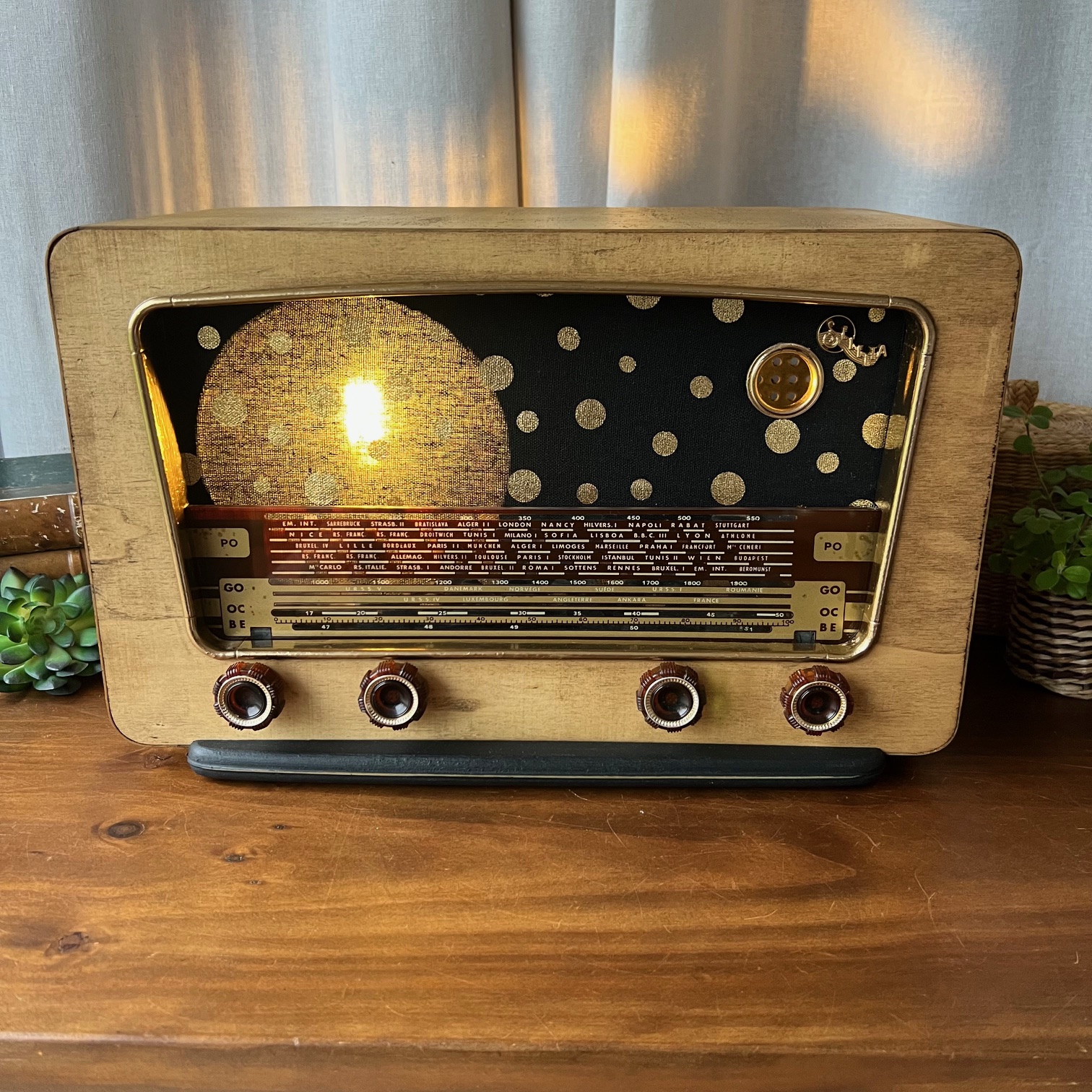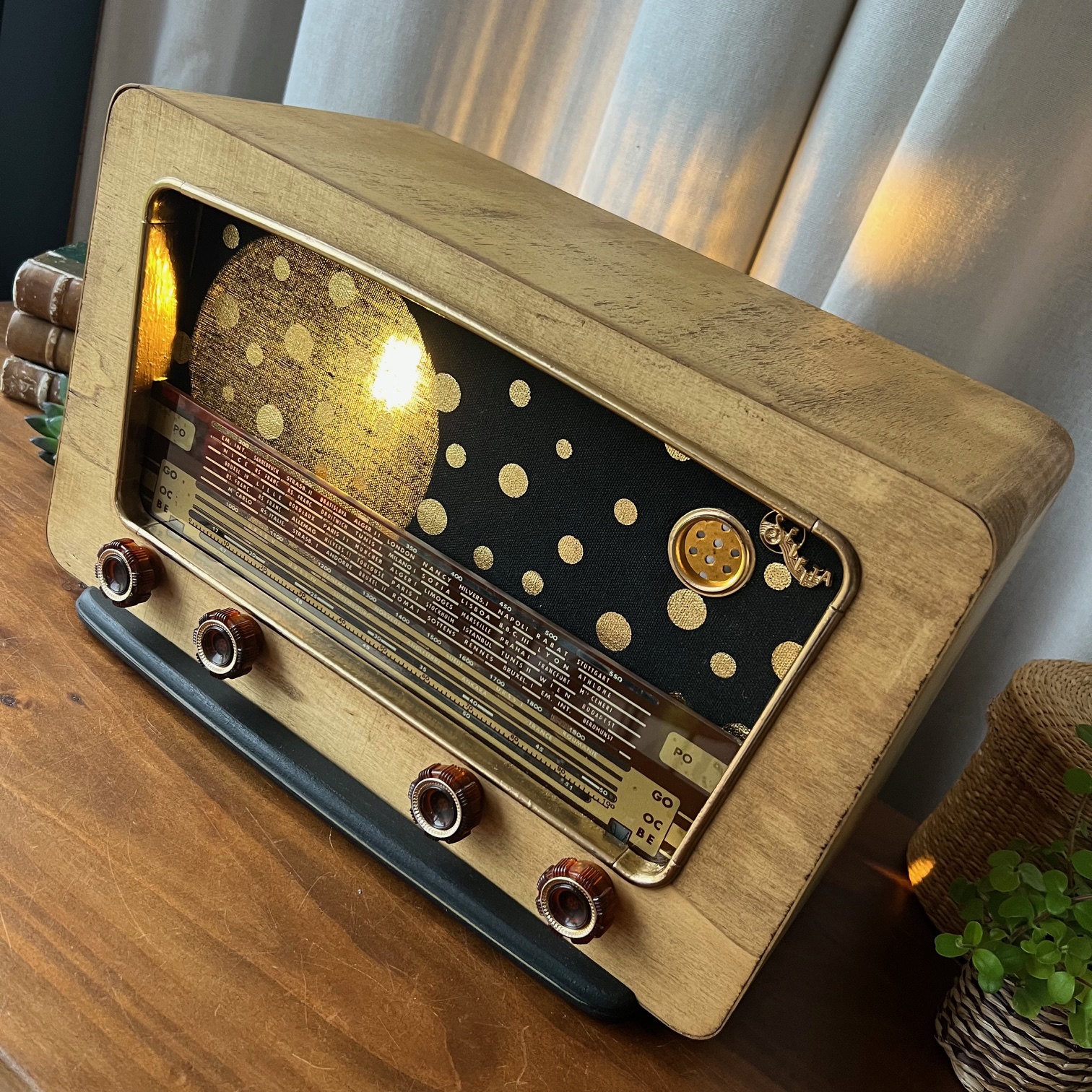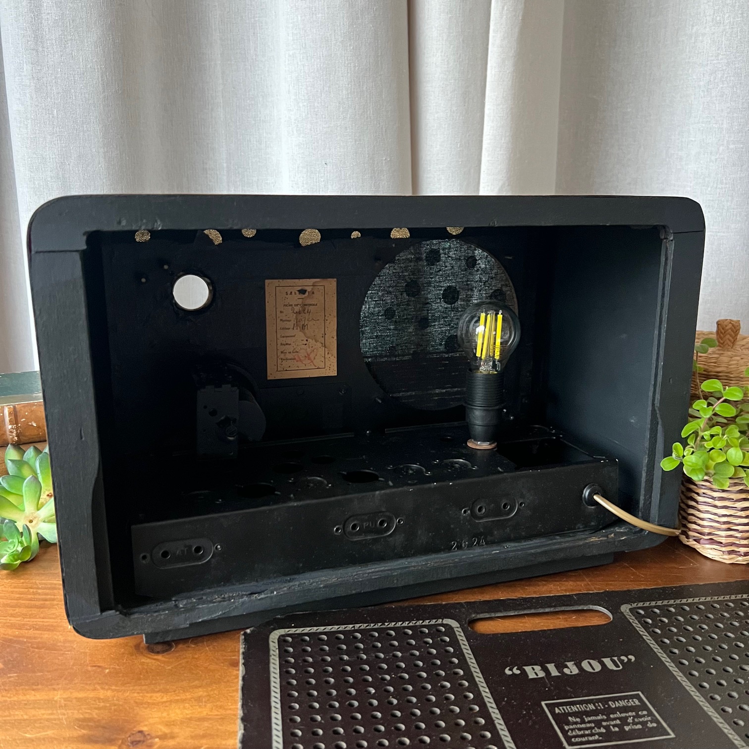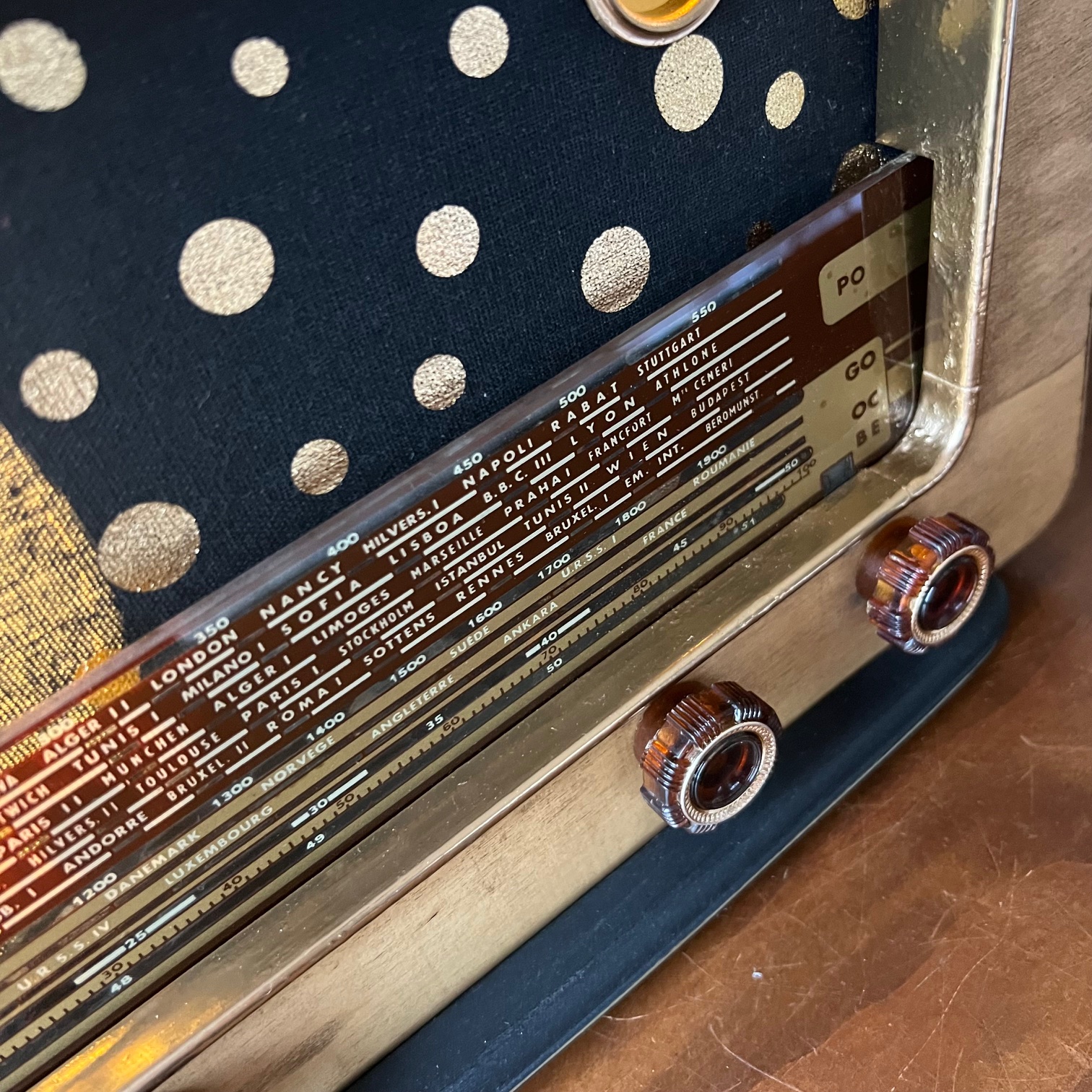 Le plaquage très abîmé, l’intérieur fatigué, les composants électroniques bons pour une autre vie… Alors j’ai tout démonté. Vraiment tout. J’ai vidé l’intérieur, peint en noir, installé un système lumineux. Une ampoule, une présence douce. J’ai changé le tissu, choisi un noir ponctué de pois dorés. Un peu de nuit, un peu d’éclat. Le bois a retrouvé une patine, nettoyé, respecté, sans chercher à effacer ce qu’il a vécu.