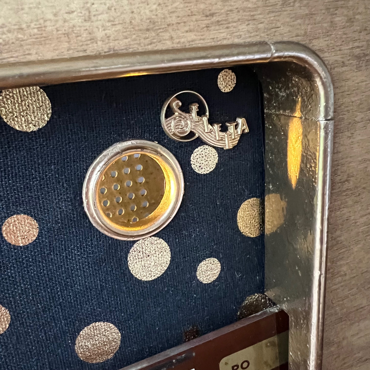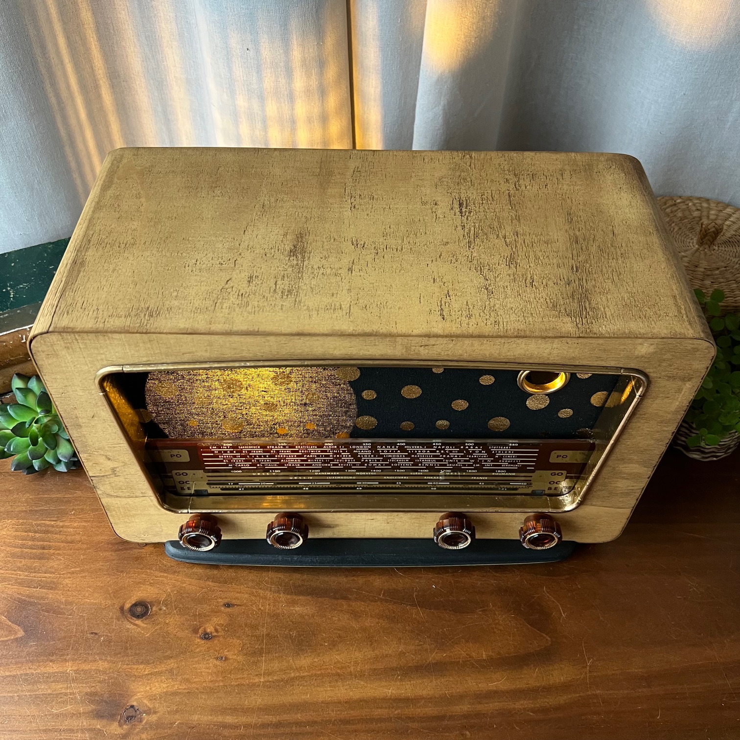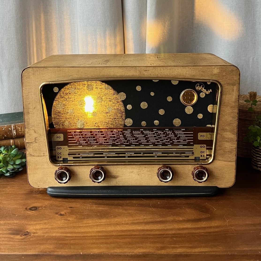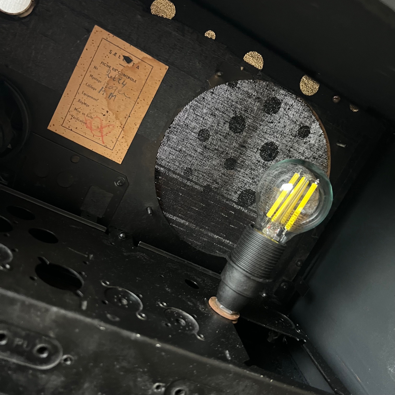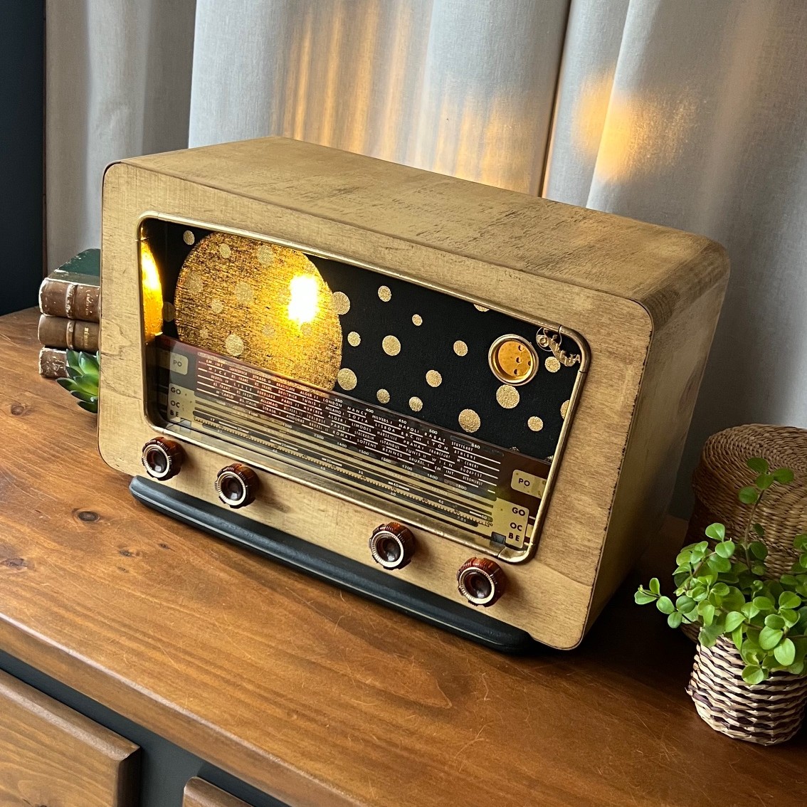 Le plaquage très abîmé, l’intérieur fatigué, les composants électroniques bons pour une autre vie… Alors j’ai tout démonté. Vraiment tout. J’ai vidé l’intérieur, peint en noir, installé un système lumineux. Une ampoule, une présence douce. J’ai changé le tissu, choisi un noir ponctué de pois dorés. Un peu de nuit, un peu d’éclat. Le bois a retrouvé une patine, nettoyé, respecté, sans chercher à effacer ce qu’il a vécu.