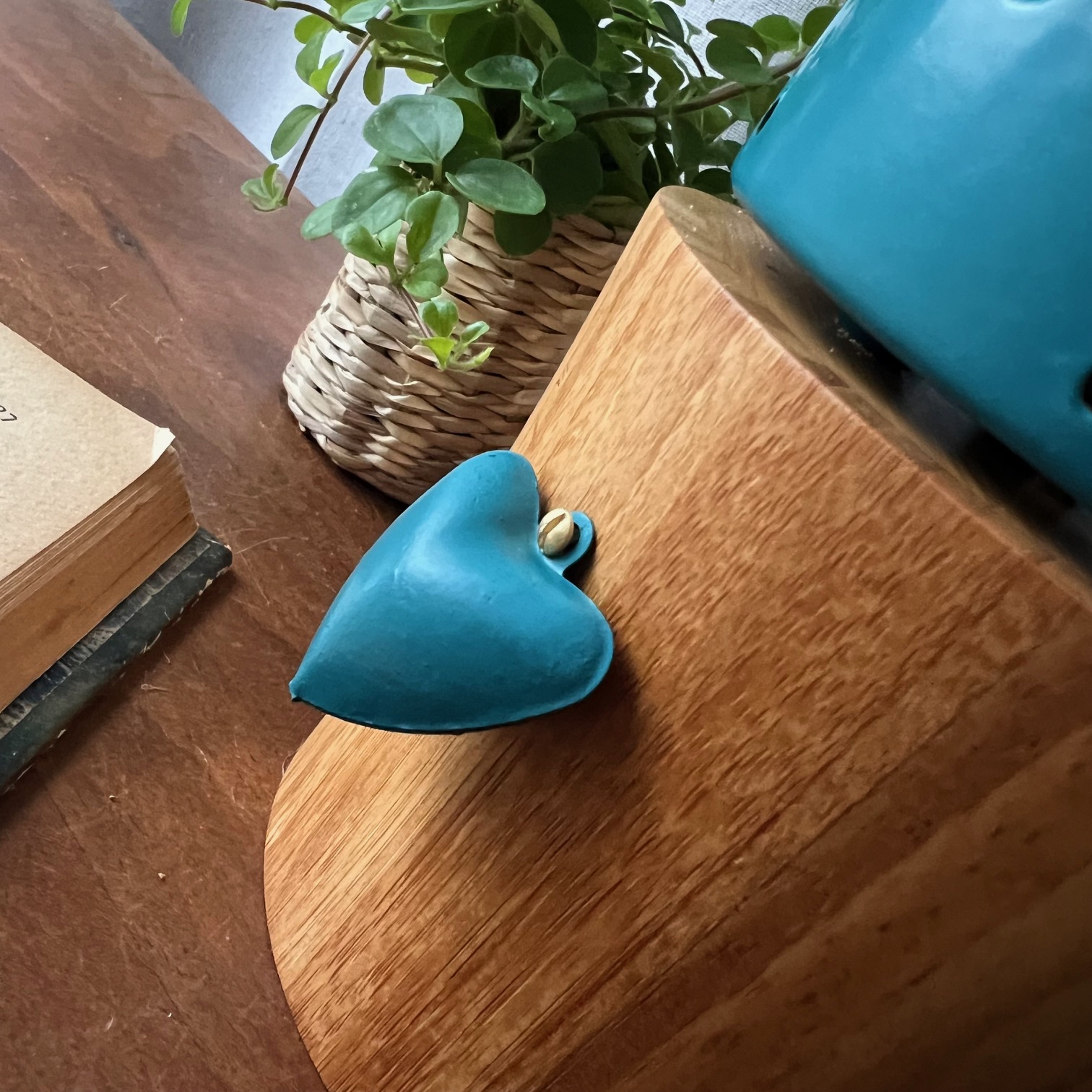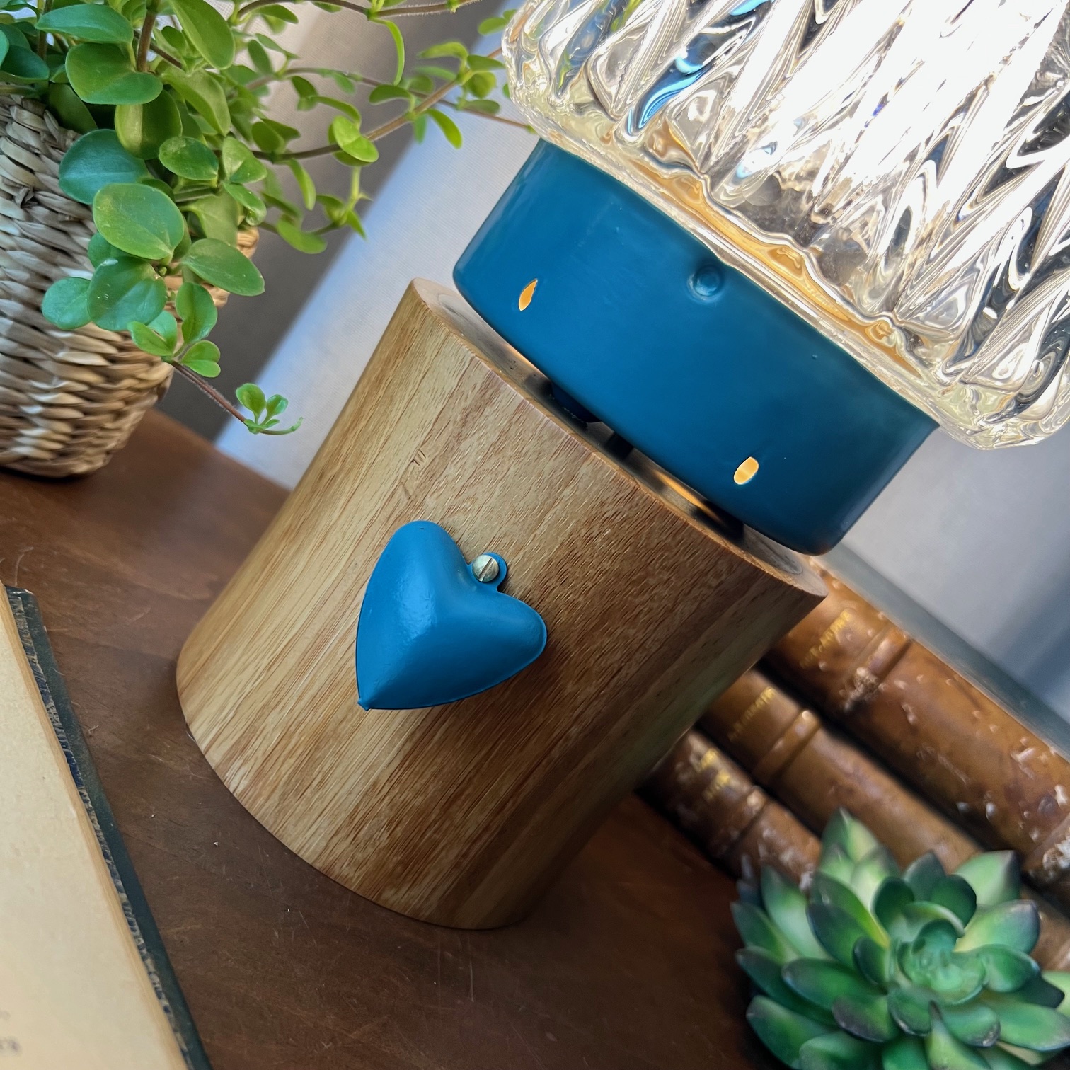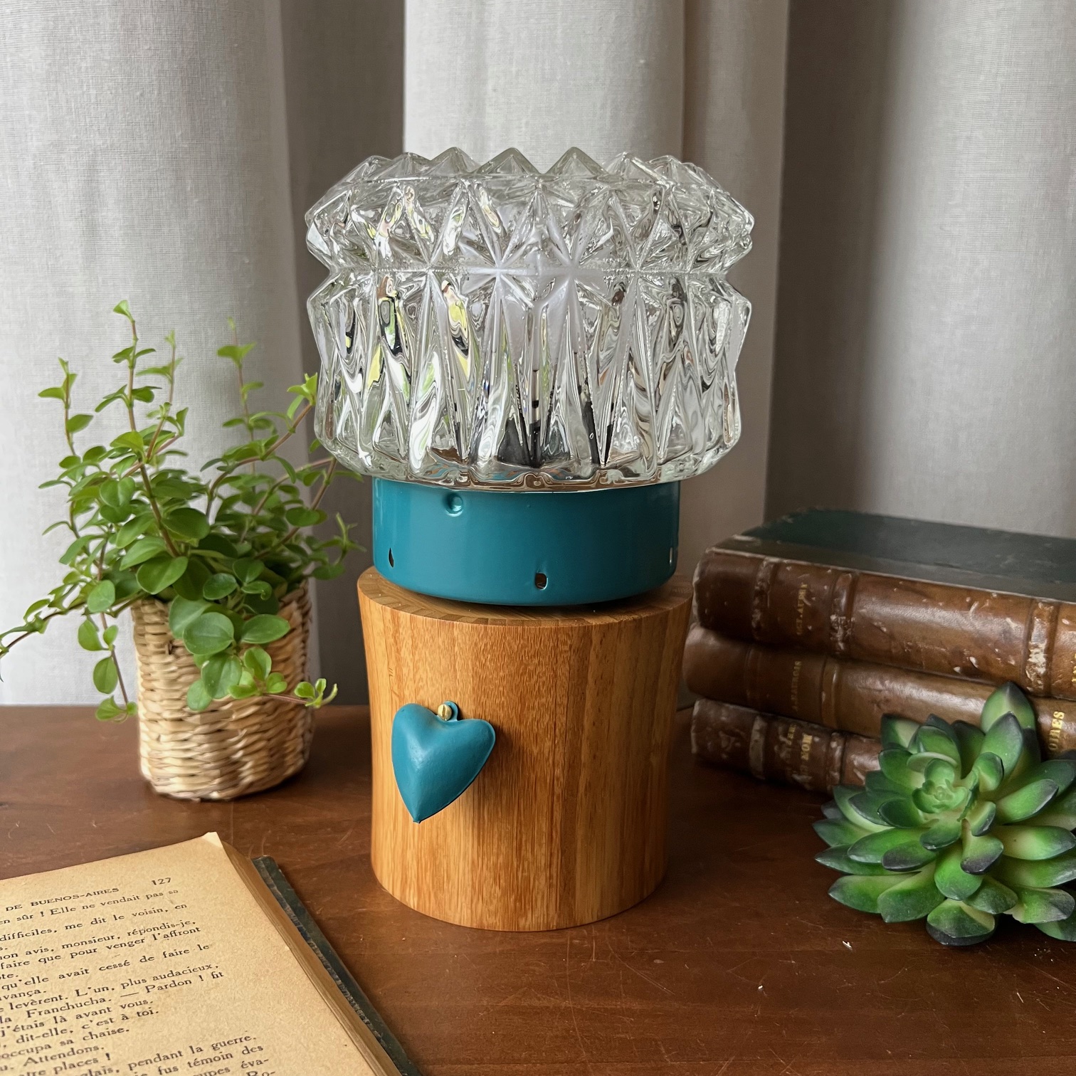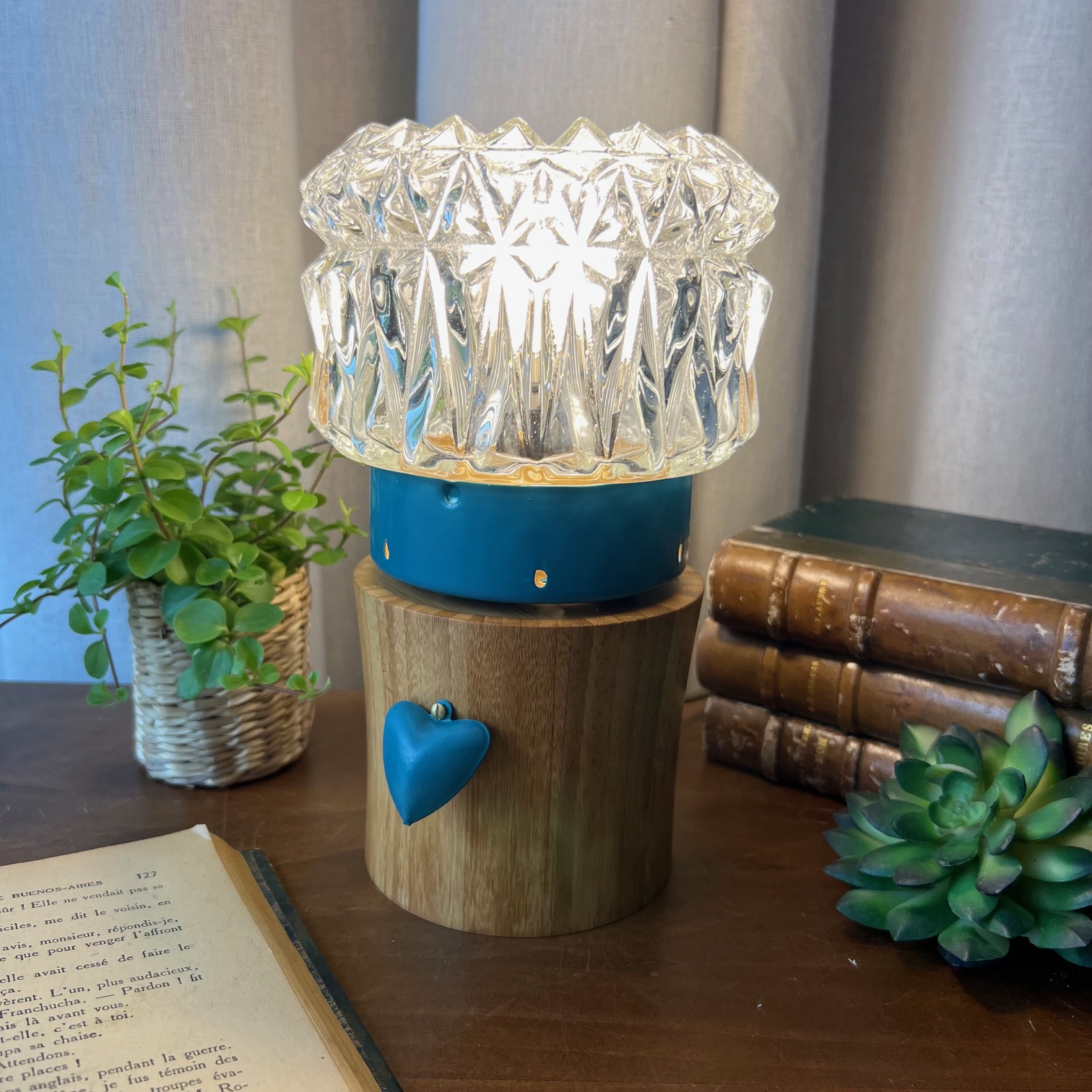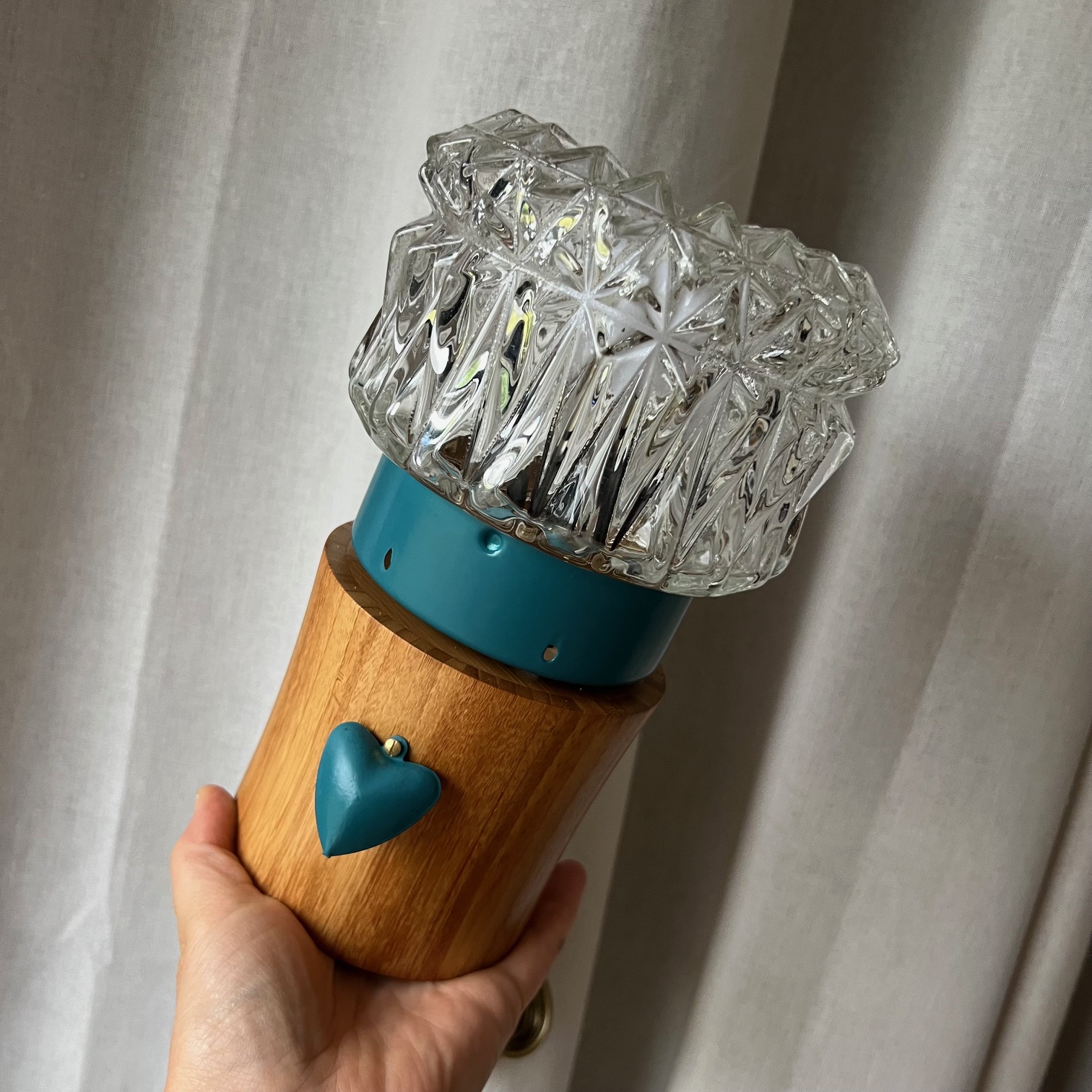 Pour lui offrir une nouvelle vie, j’ai fixé ce globe sur un socle en bois et entièrement réélectrifié l’ensemble : voilà qu’elle devient aujourd’hui une lampe à poser pleine de charme et de caractère. Sur le devant, un cœur en métal peint dans le même bleu vient souligner sa poésie et sa douceur, un petit clin d’œil qui rend cette lampe unique.