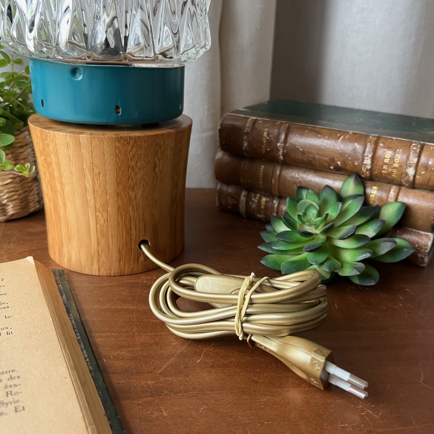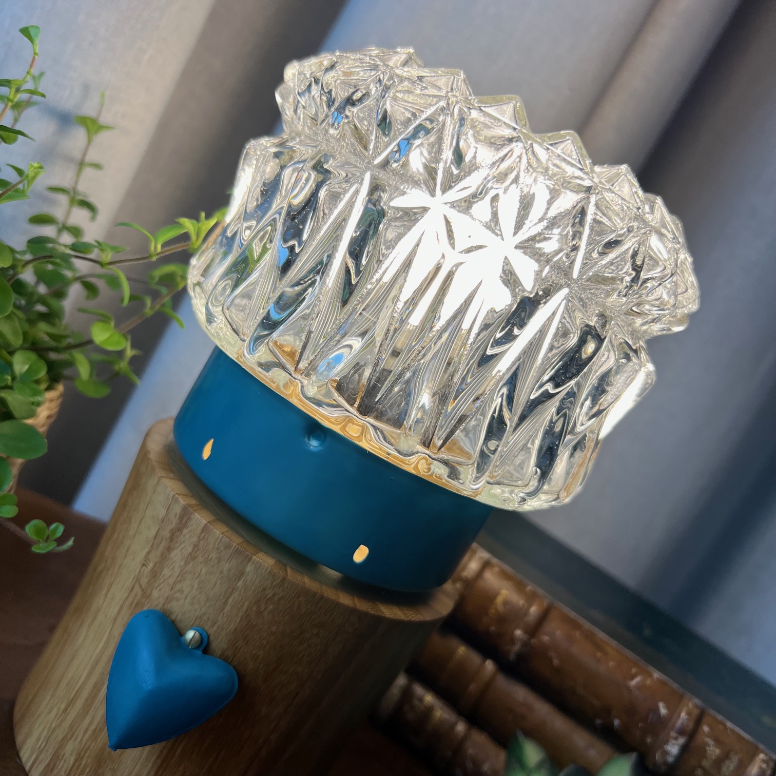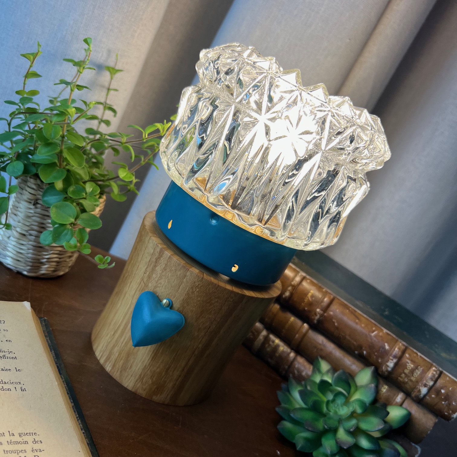 #LampeVintage #AppliqueTransformée #ObjetRétro #LampeÀPoser #VerreTexturé #PatineBleue #DécorationUnique #UpcyclingVintage #HistoireDesObjets #MaValiseEnCarton