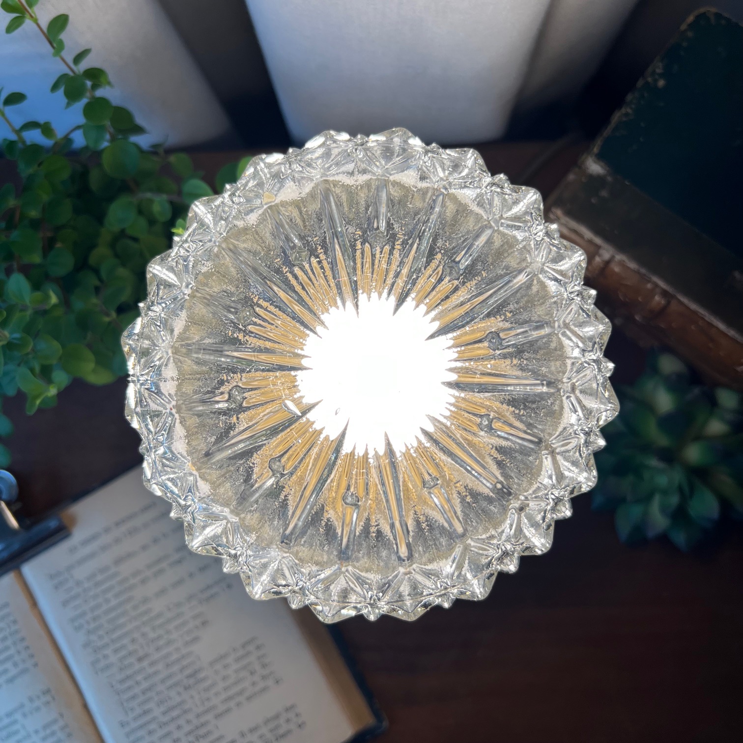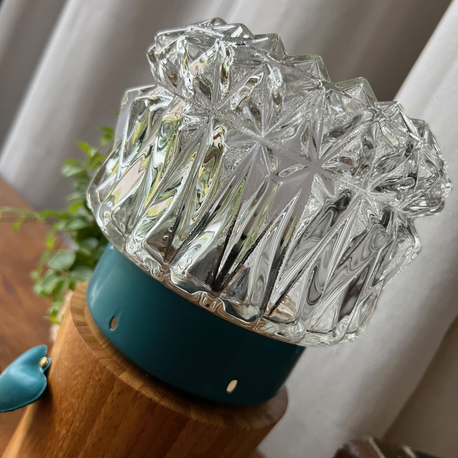 J’ai pris soin de nettoyer chaque rainure de ce verre pour qu’il retrouve tout son éclat, puis j’ai repeint le socle en métal en un bleu lumineux.