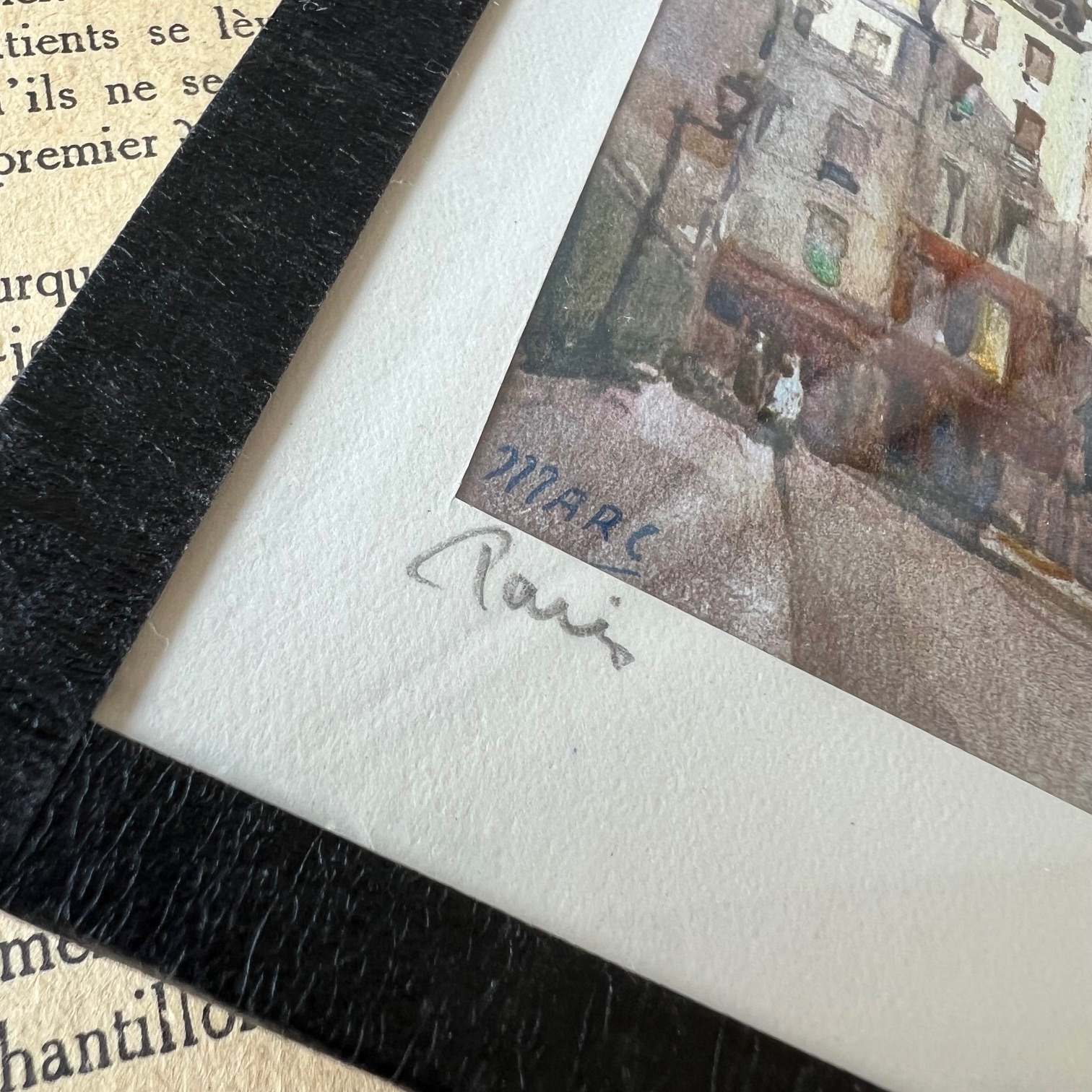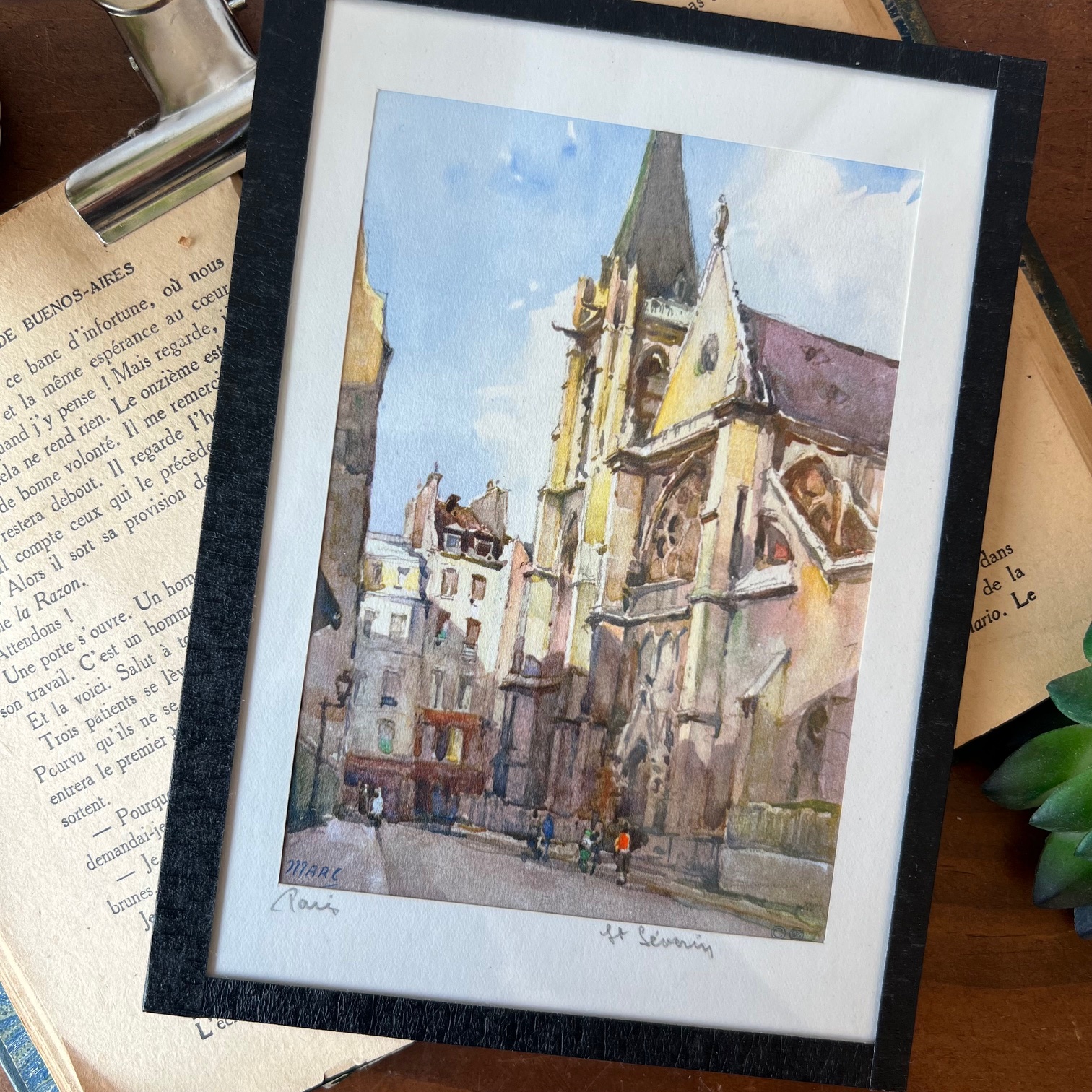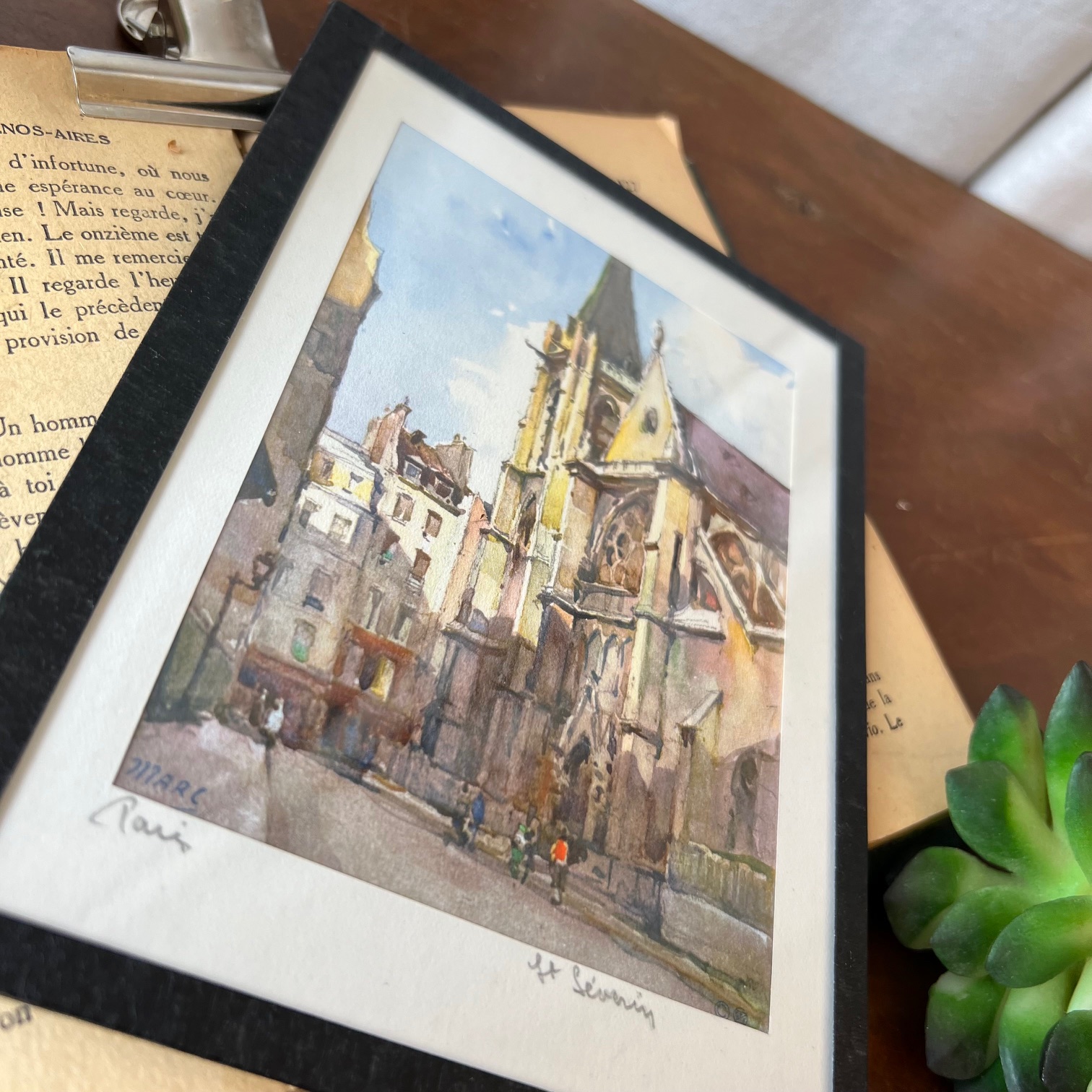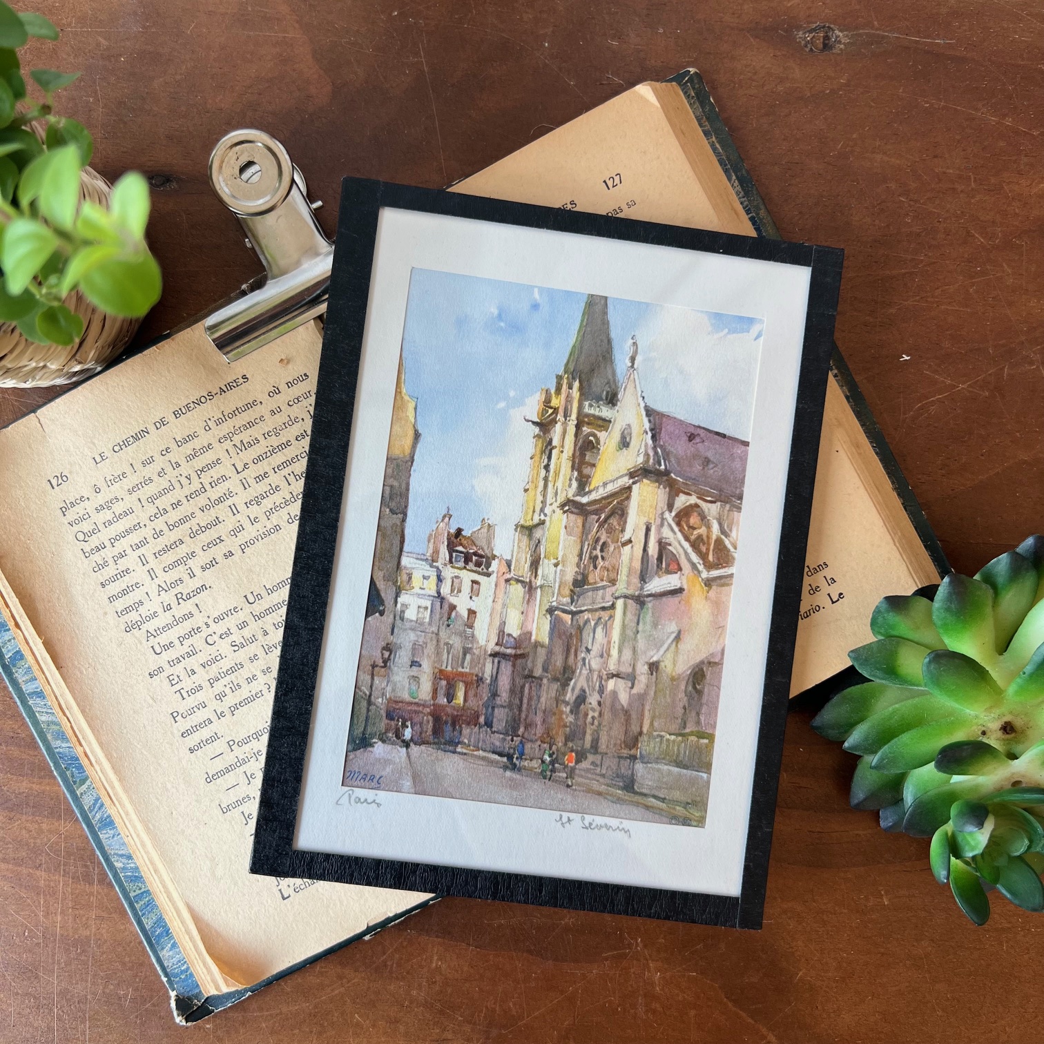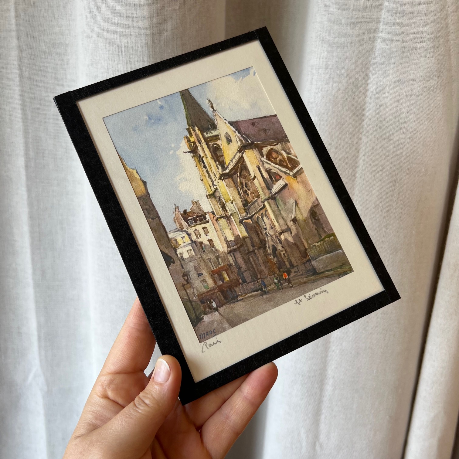 Pour les amoureux de Paris 🌸 : laissez-vous séduire par ces reproductions d’aquarelles signées MARC (Auguste Marc, XXᵉ siècle – tirage imprimé en Suisse). Les couleurs vives et parfaitement conservées restituent toute la poésie de la capitale. Un petit morceau de Paris à accrocher chez soi. Ici, l’église de Saint Séverin dans le célèbre quartier latin.