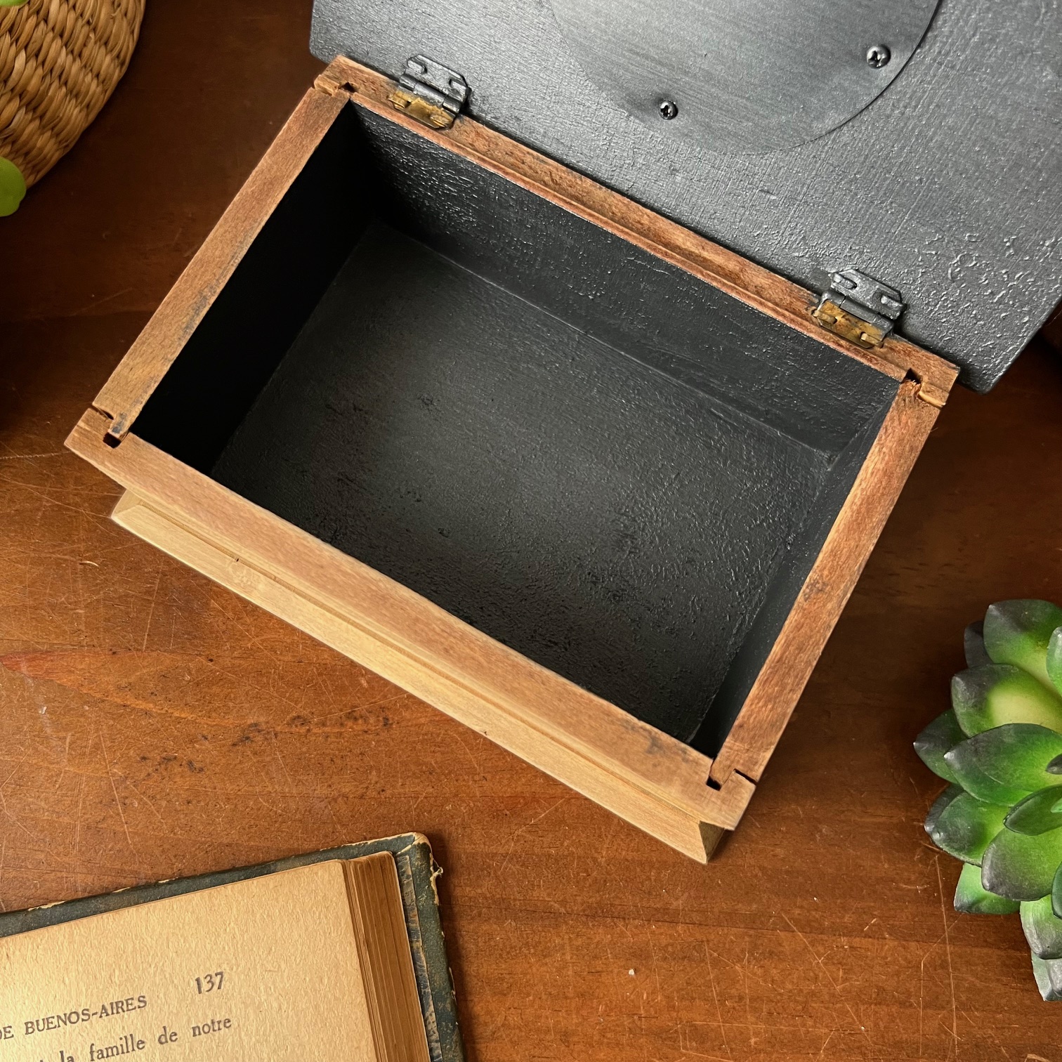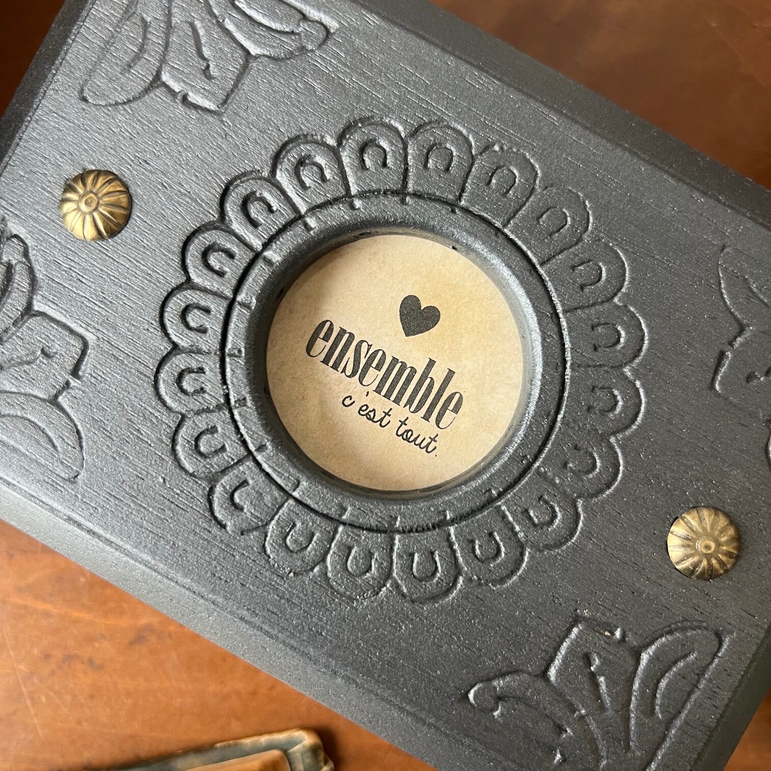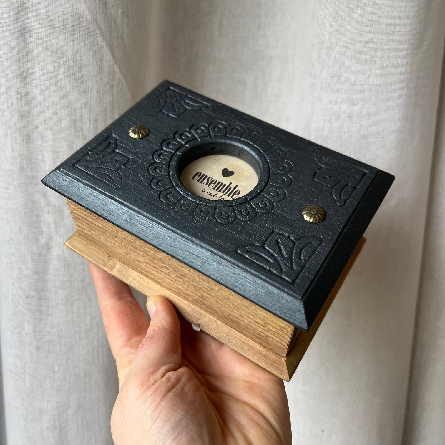 Le couvercle a été patiné en noir, tout comme l’intérieur, tandis que le reste conserve la chaleur du bois. Dans le cercle central, là où l’on trouvait autrefois un décor, j’ai choisi de faire autrement.