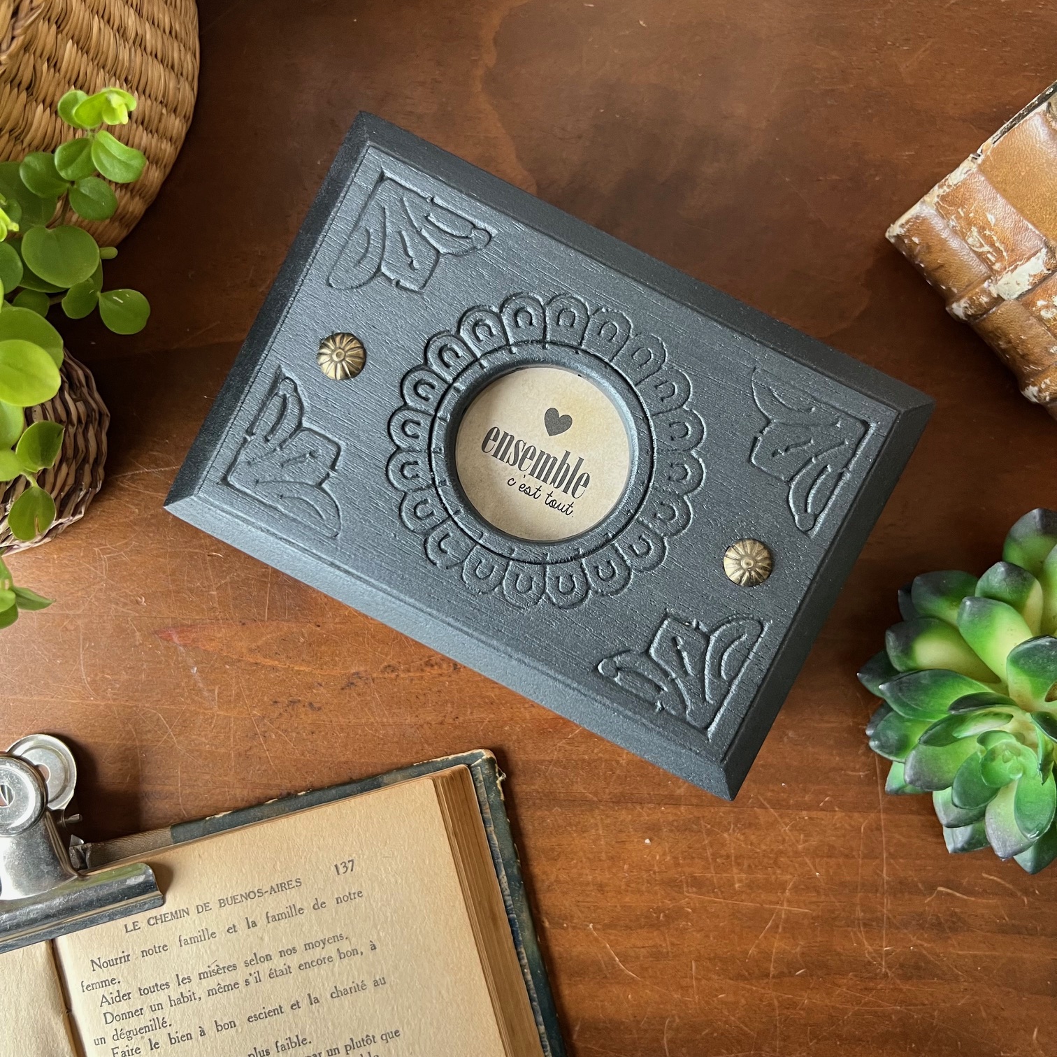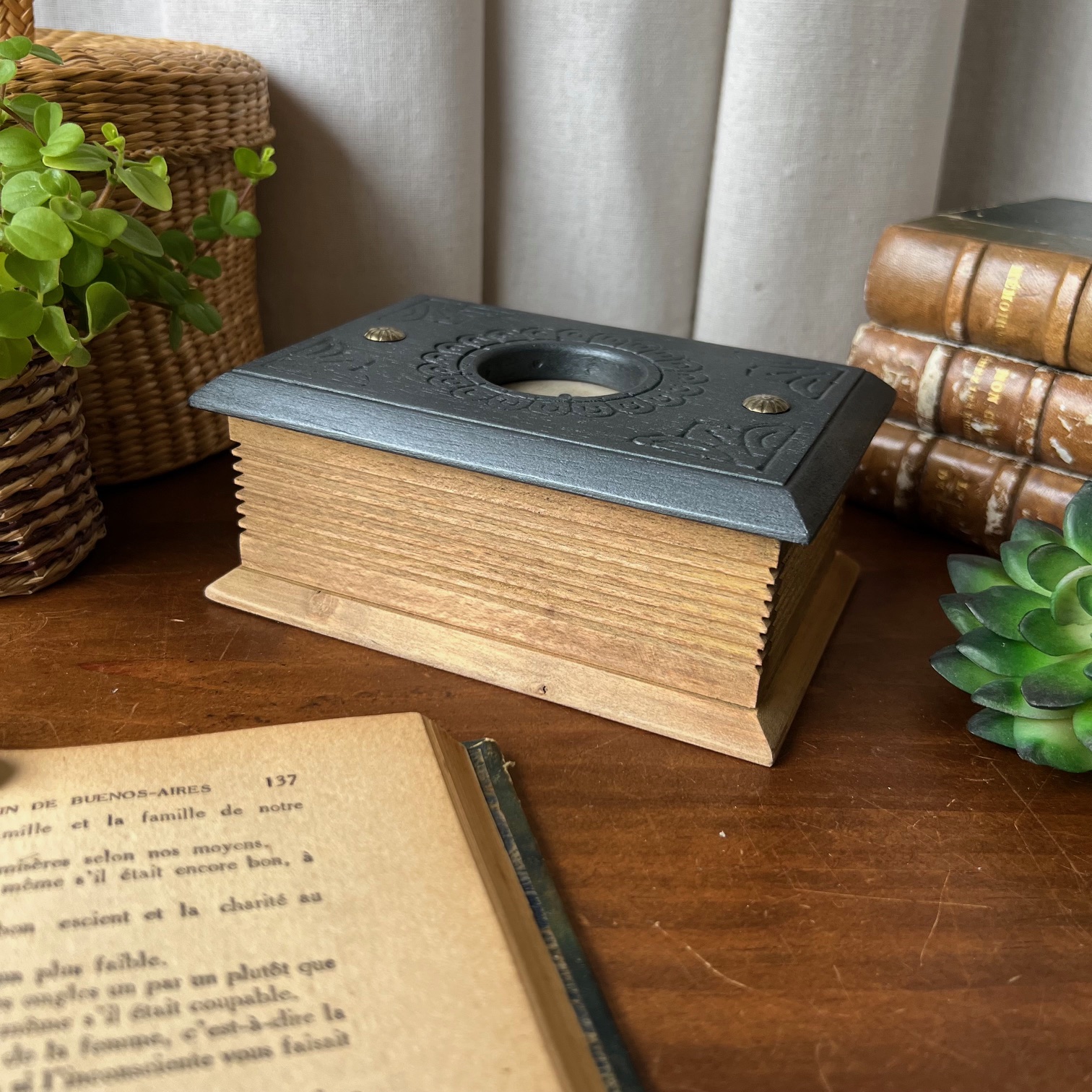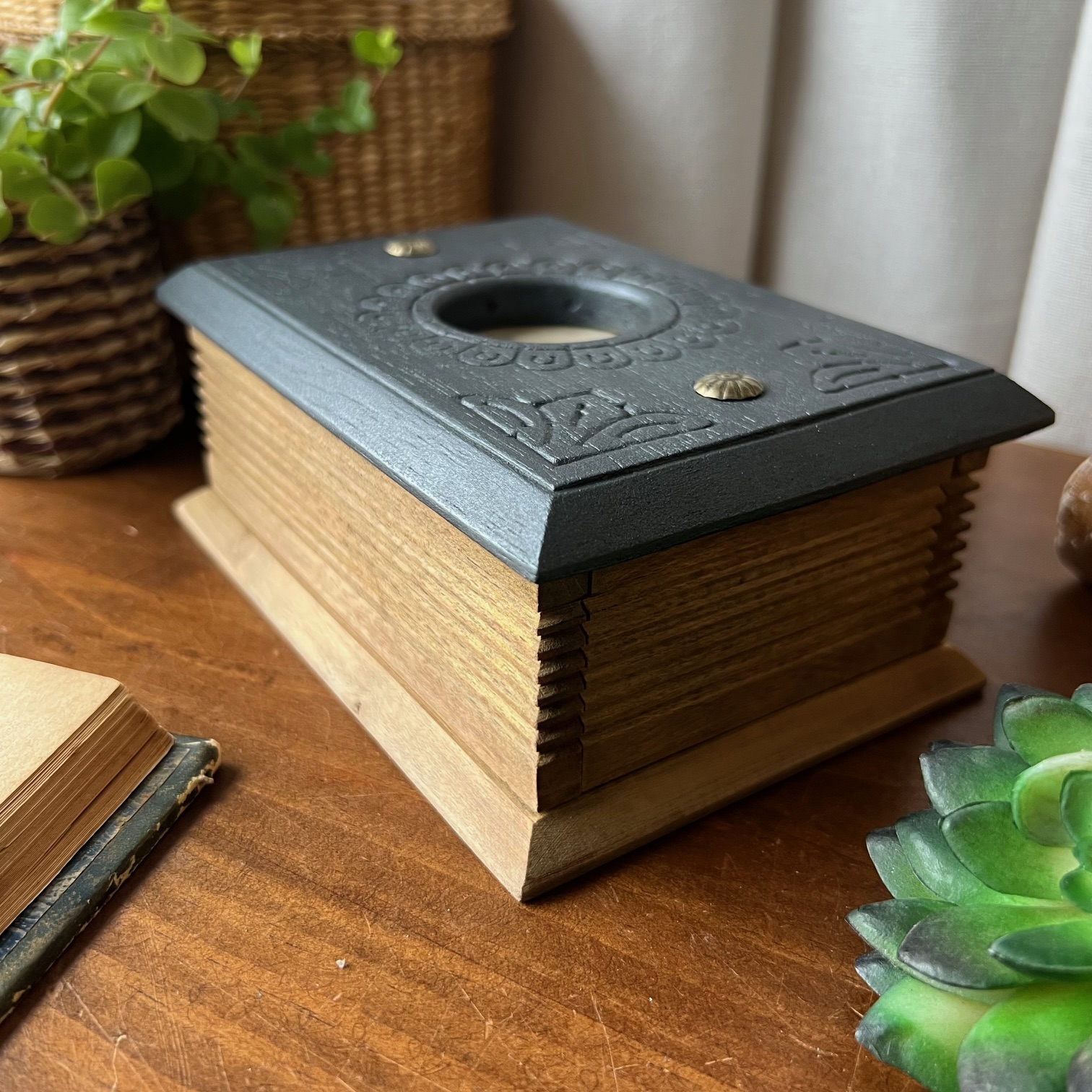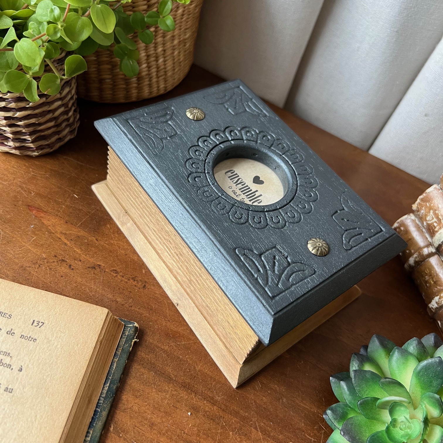 Le couvercle a été patiné en noir, tout comme l’intérieur, tandis que le reste conserve la chaleur du bois. Dans le cercle central, là où l’on trouvait autrefois un décor, j’ai choisi de faire autrement.