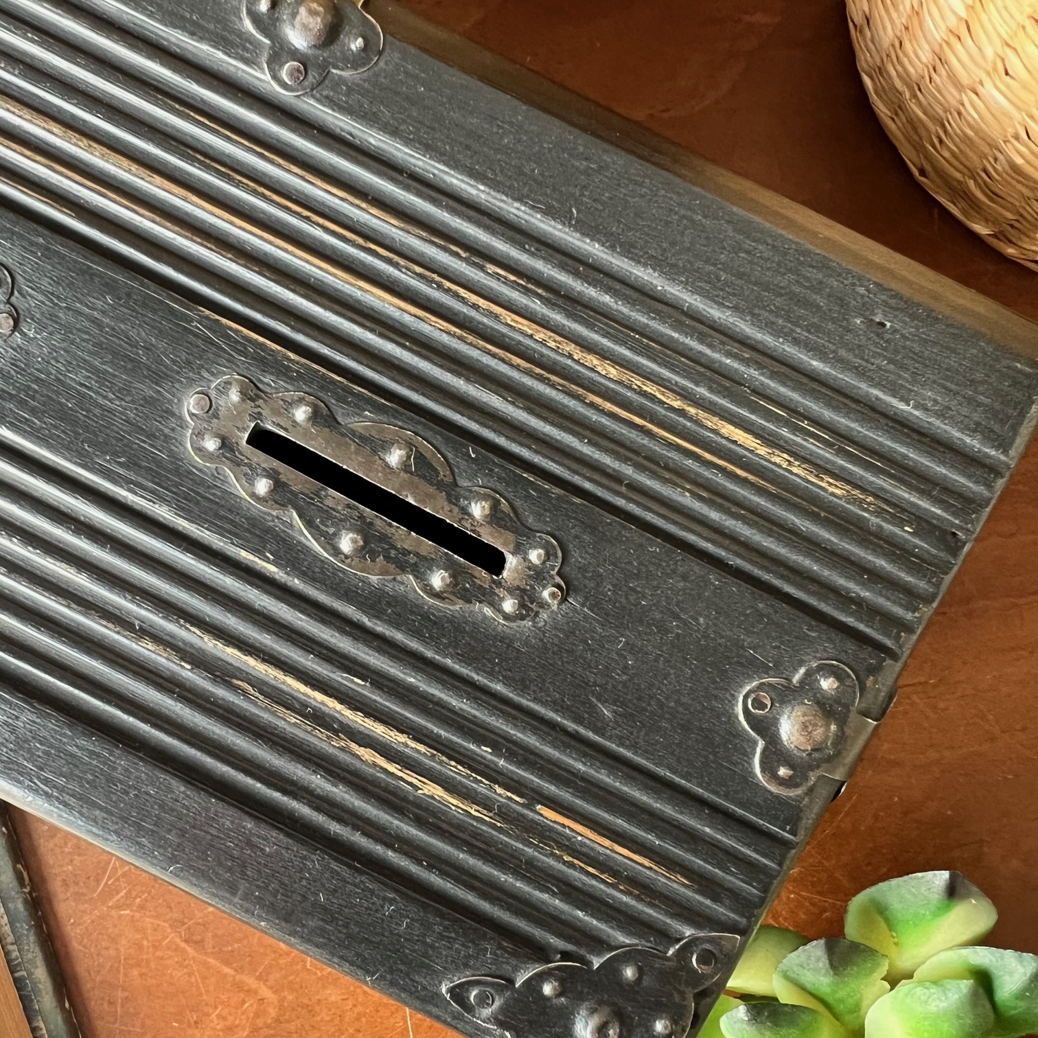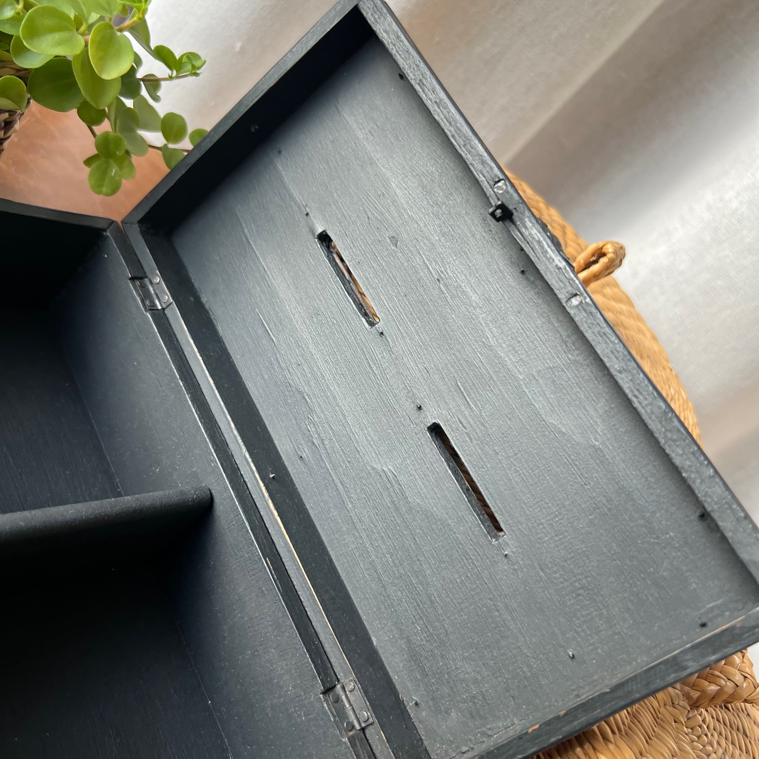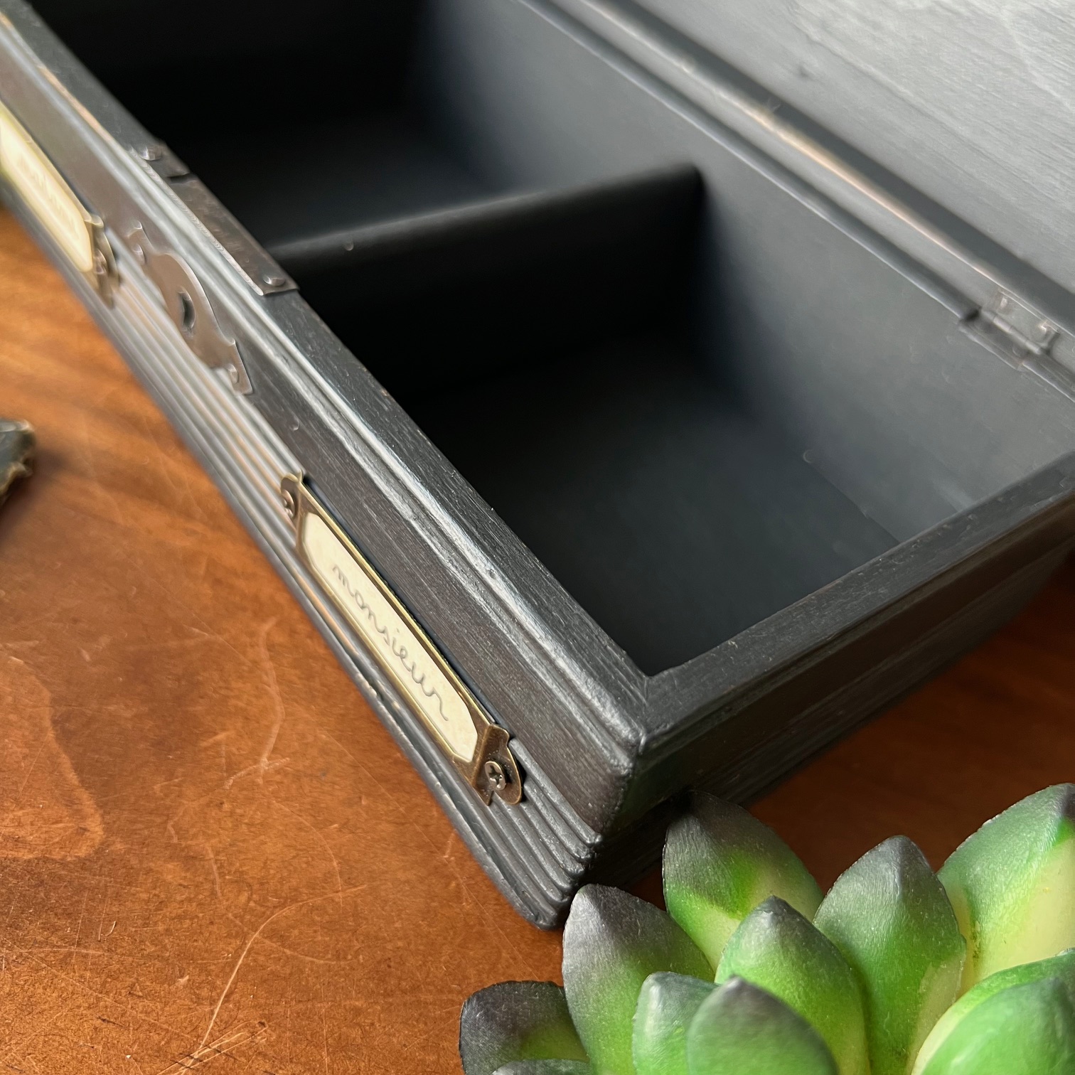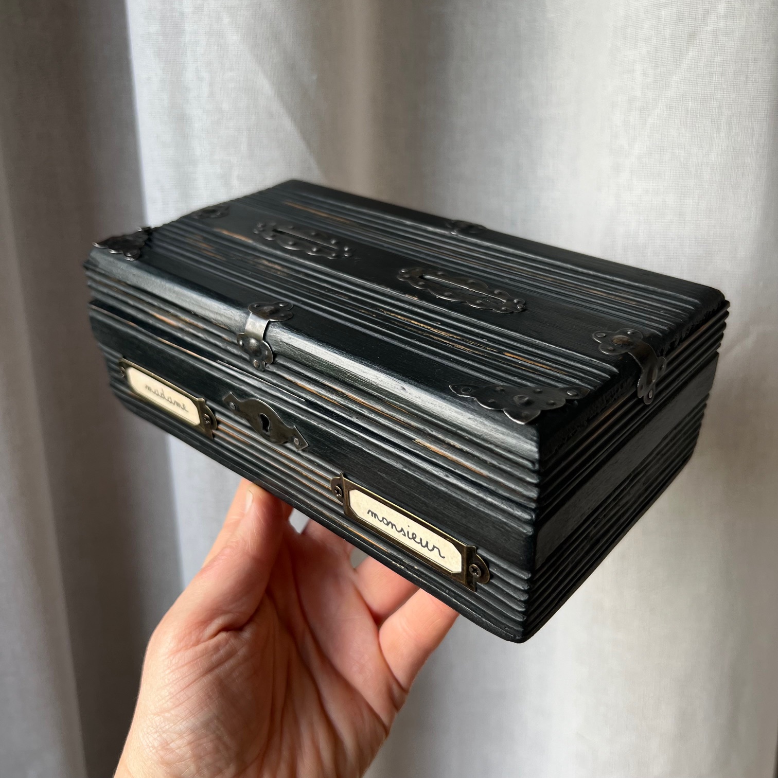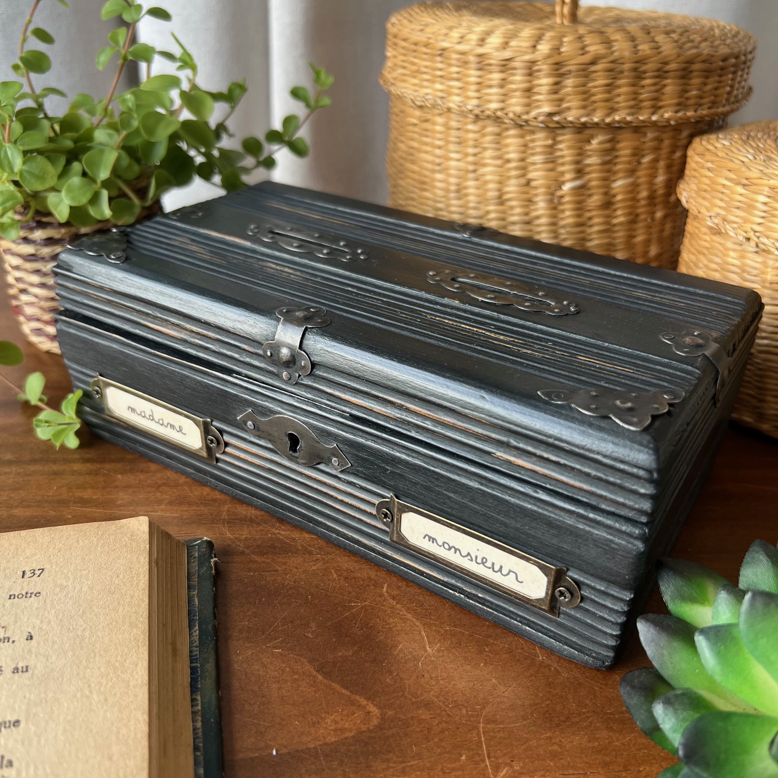 Coup de cœur pour cette jolie boite-tirelire à double-entrée. Atypique ! Le bois a été patiné en noir puis vieilli pour faire réapparaitre le bois par endroit. Deux porte-étiquettes sur le devant apportent de la personnalité, et peuvent être personnalisés. Idée cadeau ?