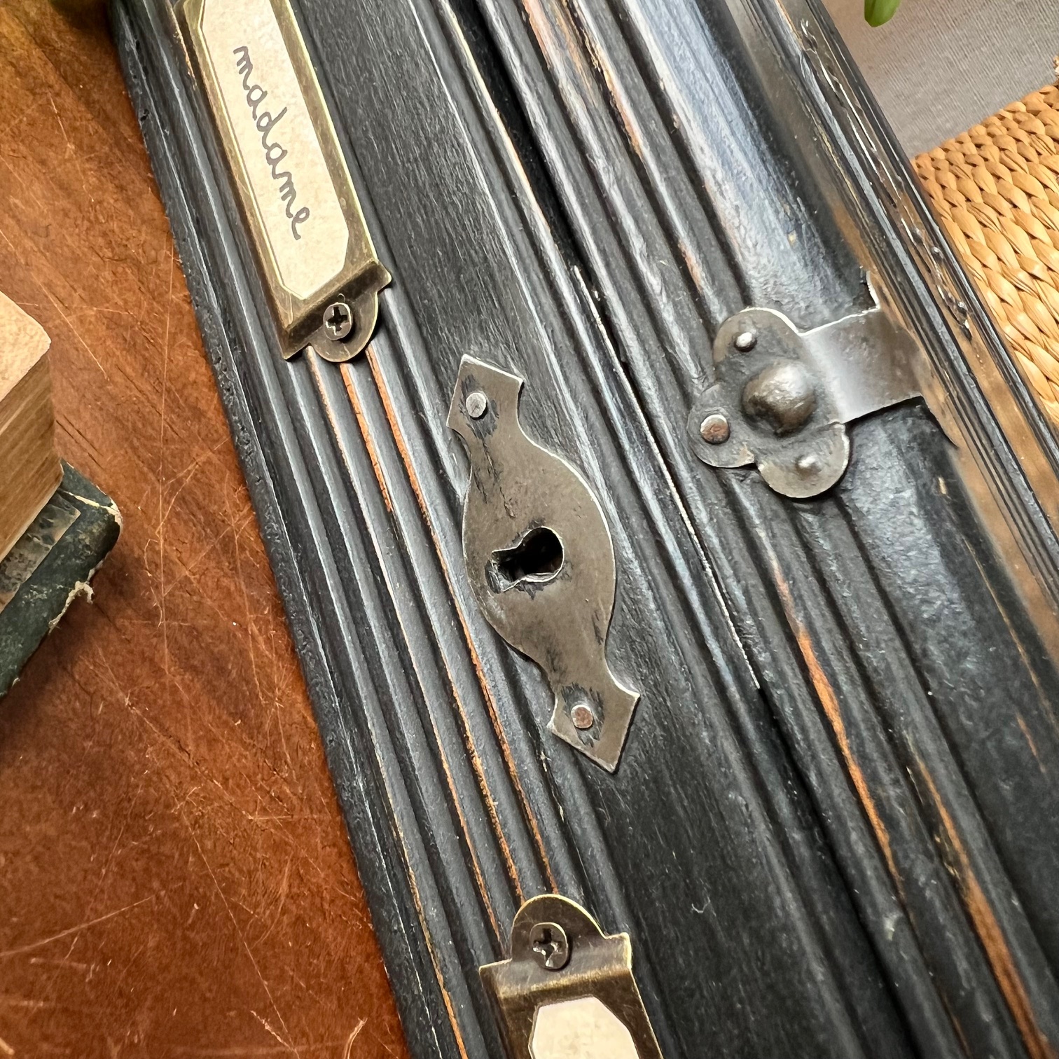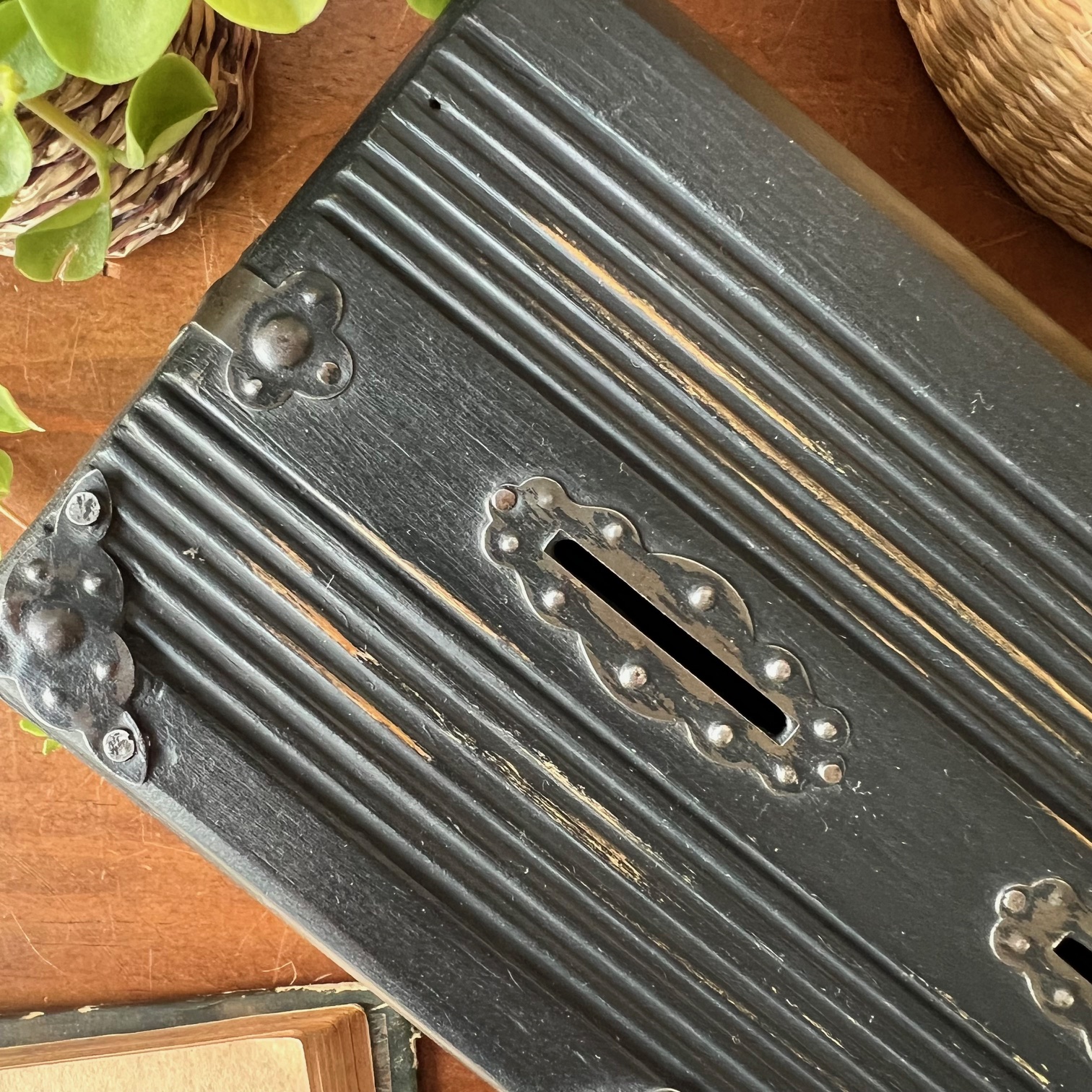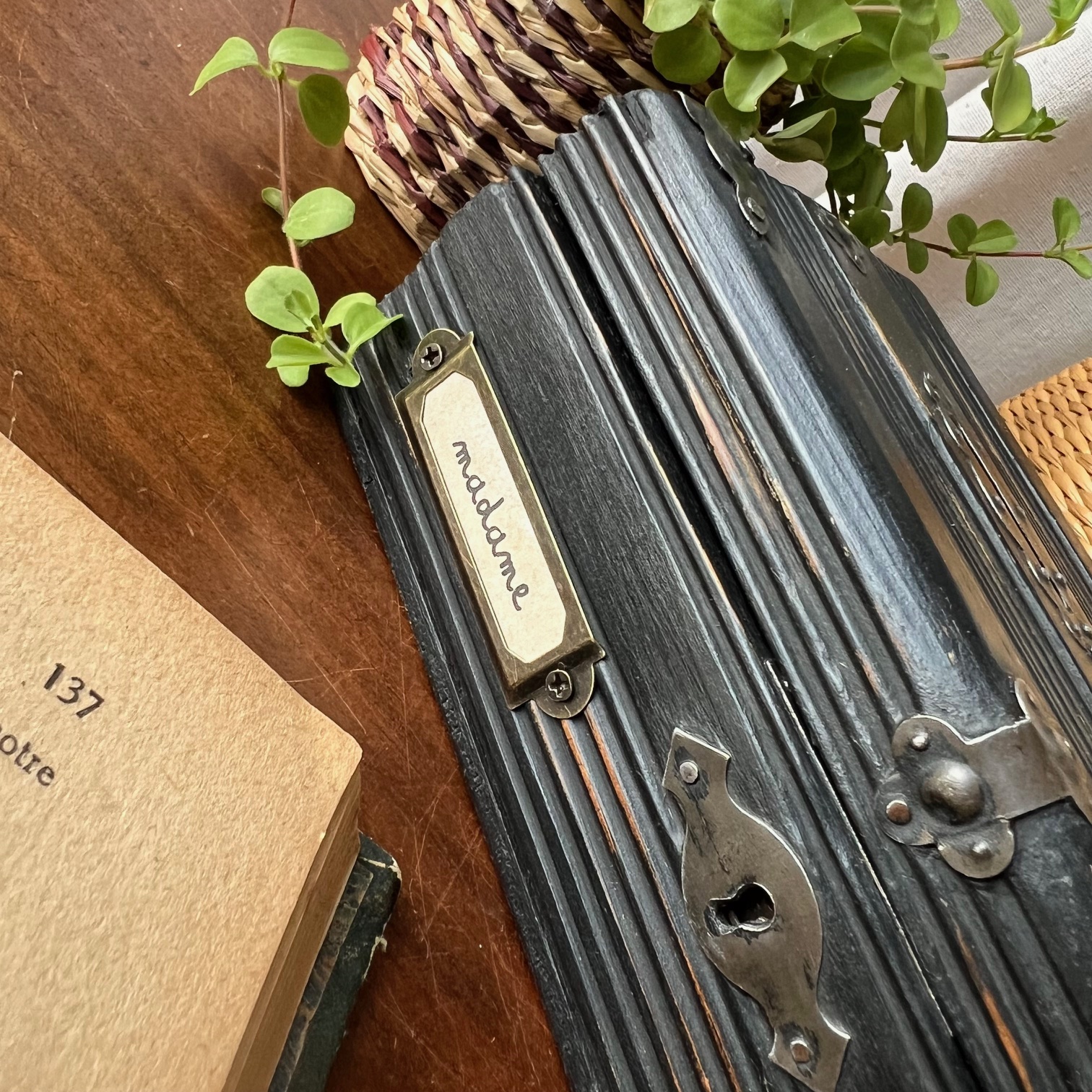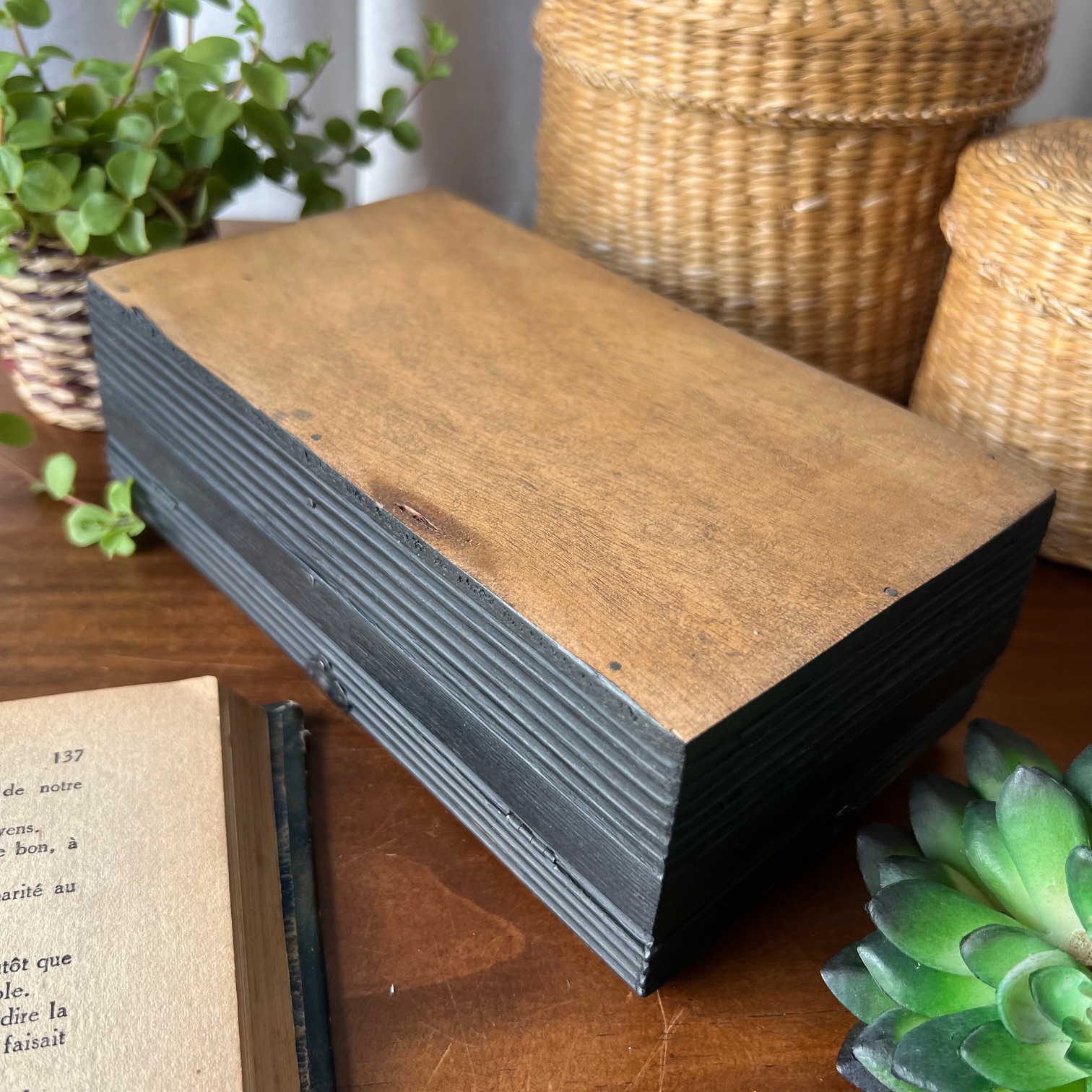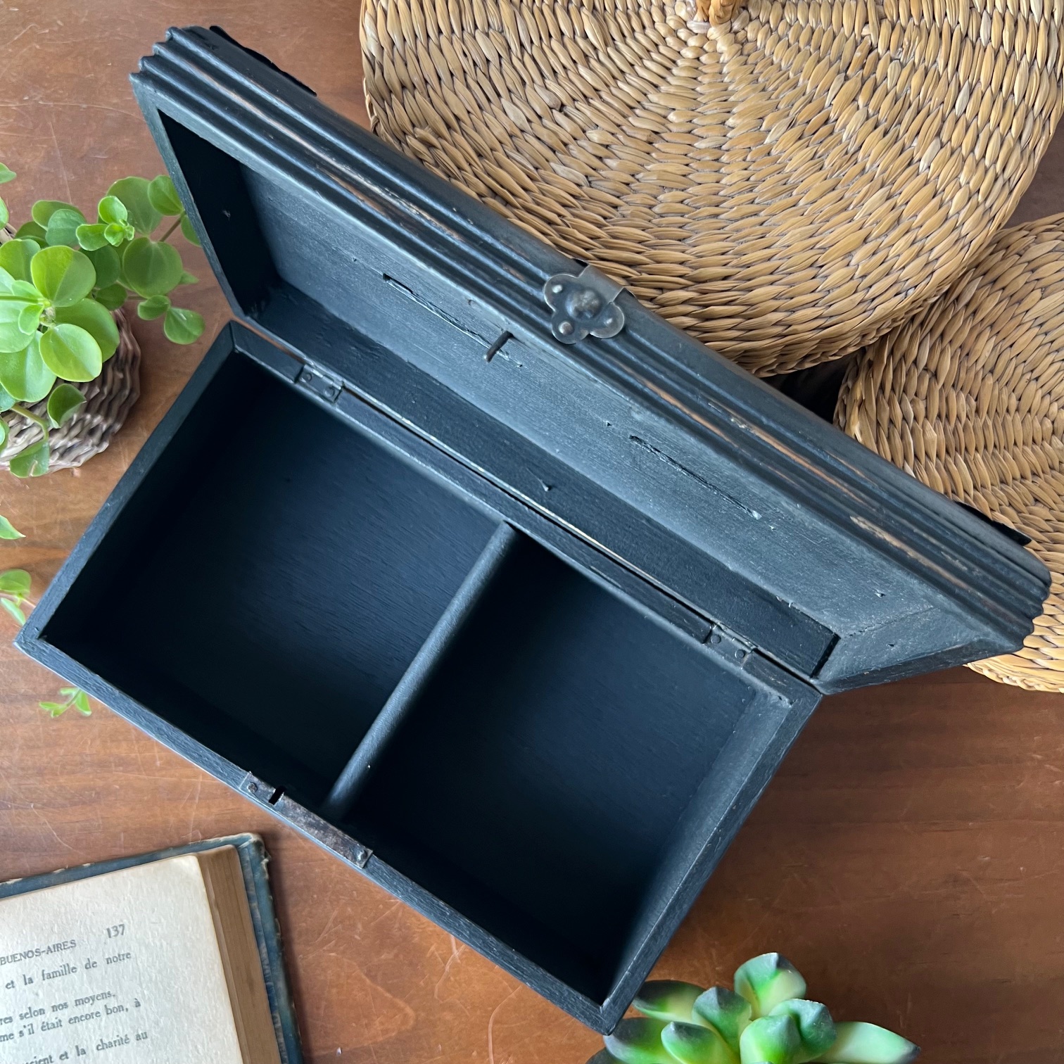 Coup de cœur pour cette jolie boite-tirelire à double-entrée. Atypique ! Le bois a été patiné en noir puis vieilli pour faire réapparaitre le bois par endroit. Deux porte-étiquettes sur le devant apportent de la personnalité, et peuvent être personnalisés. Idée cadeau ?